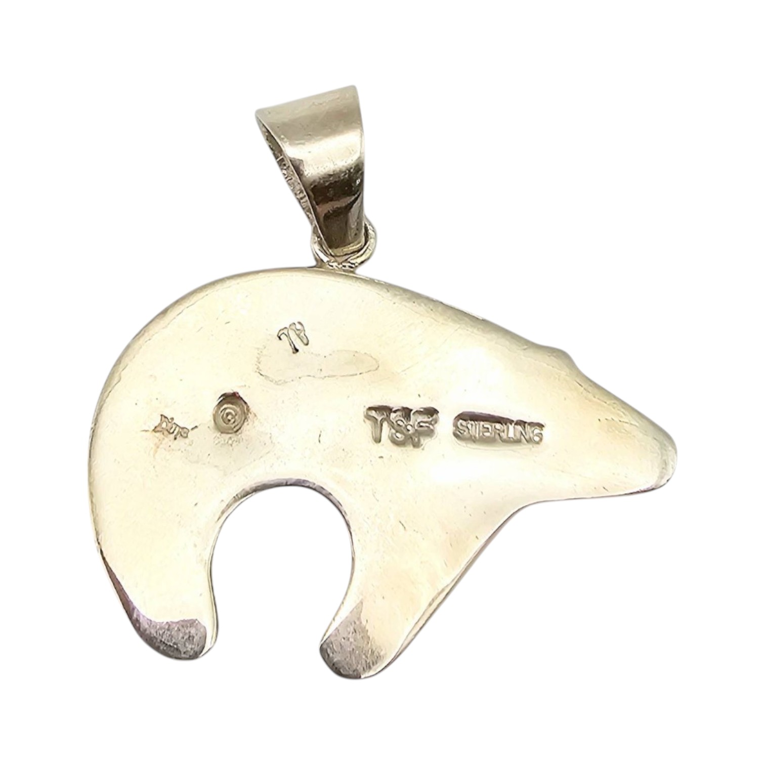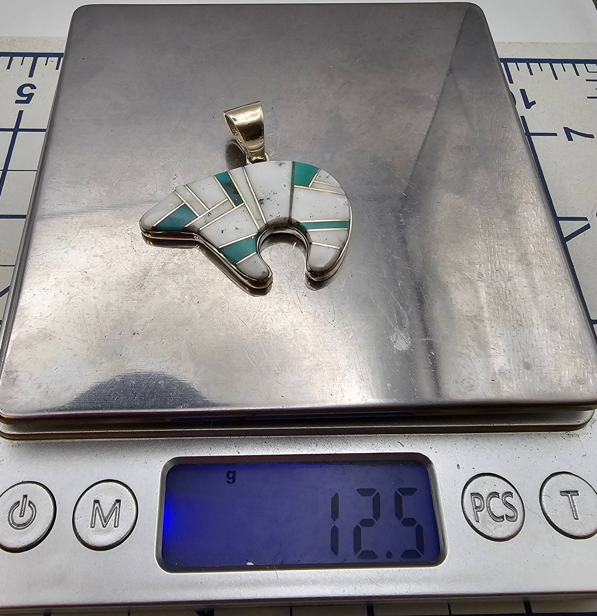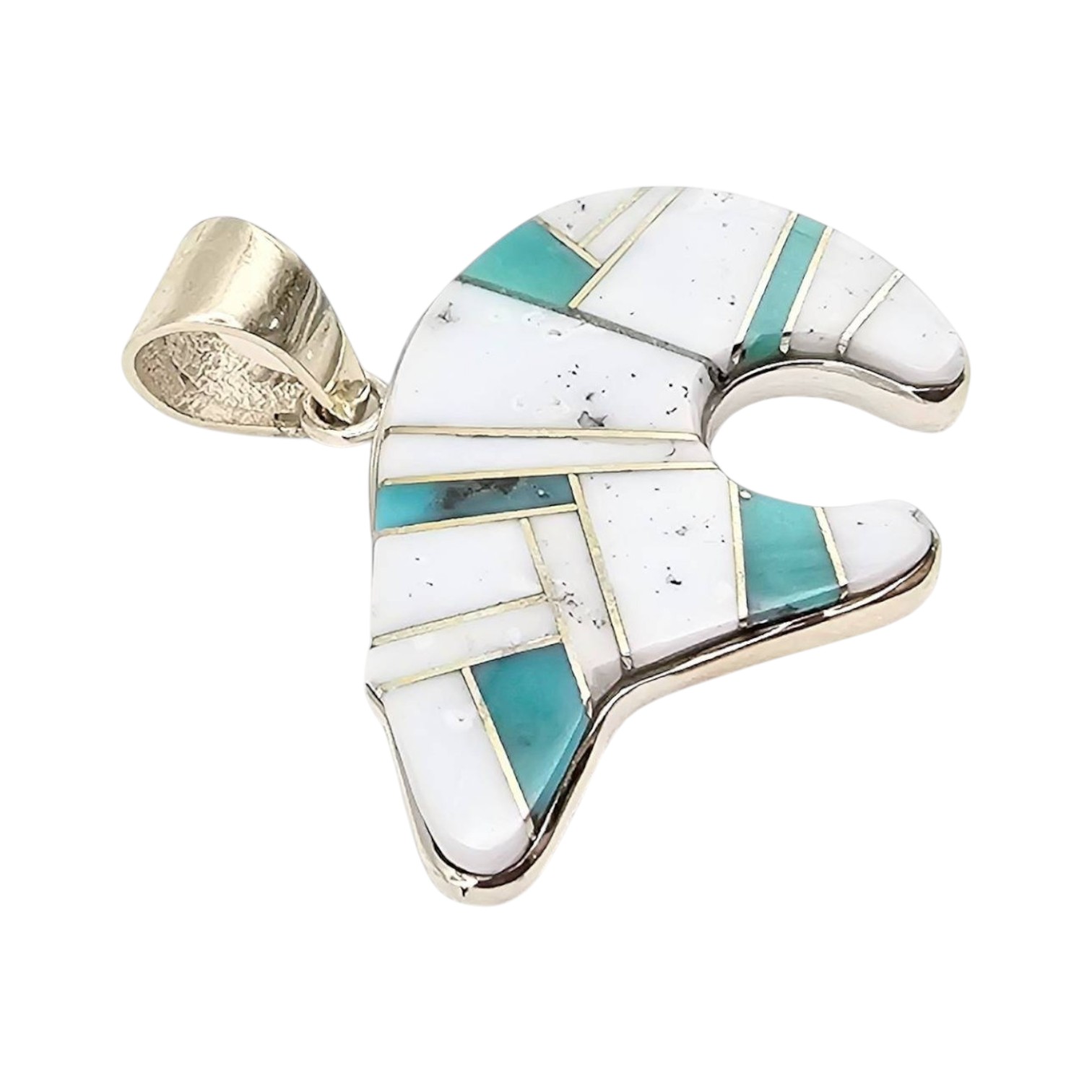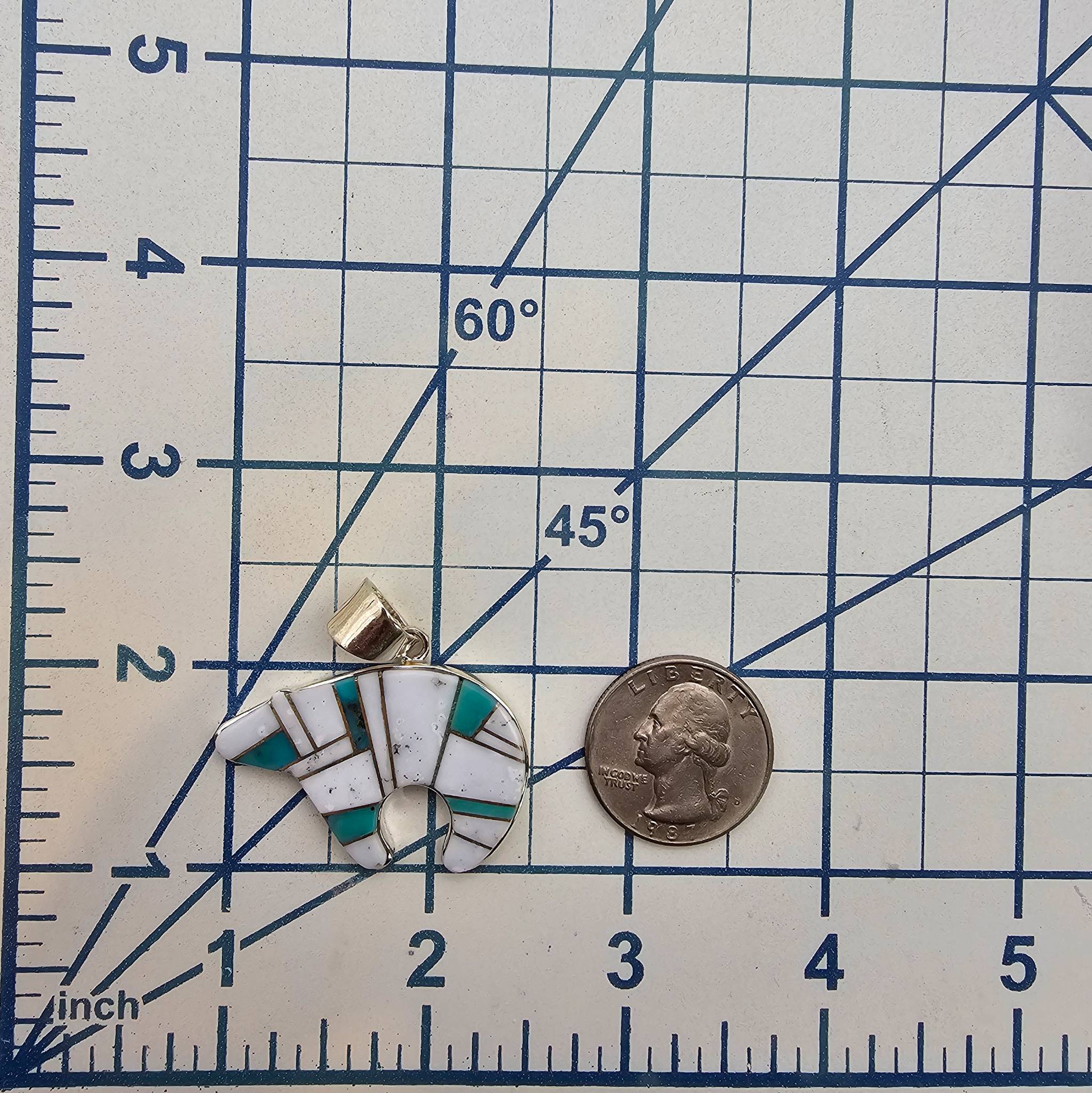 Sterling silver bear-shaped pendant handmade by Navajo artist Adlina Lee. Features inlaid turquoise and white stones arranged in a geometric pattern. Pendant measures approximately 12.5 grams in weight and bears maker marks on the reverse. Includes an attached sterling silver bail for easy wear.