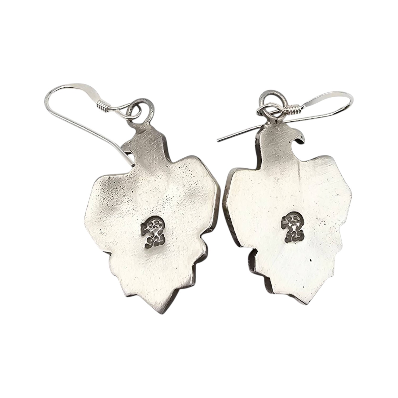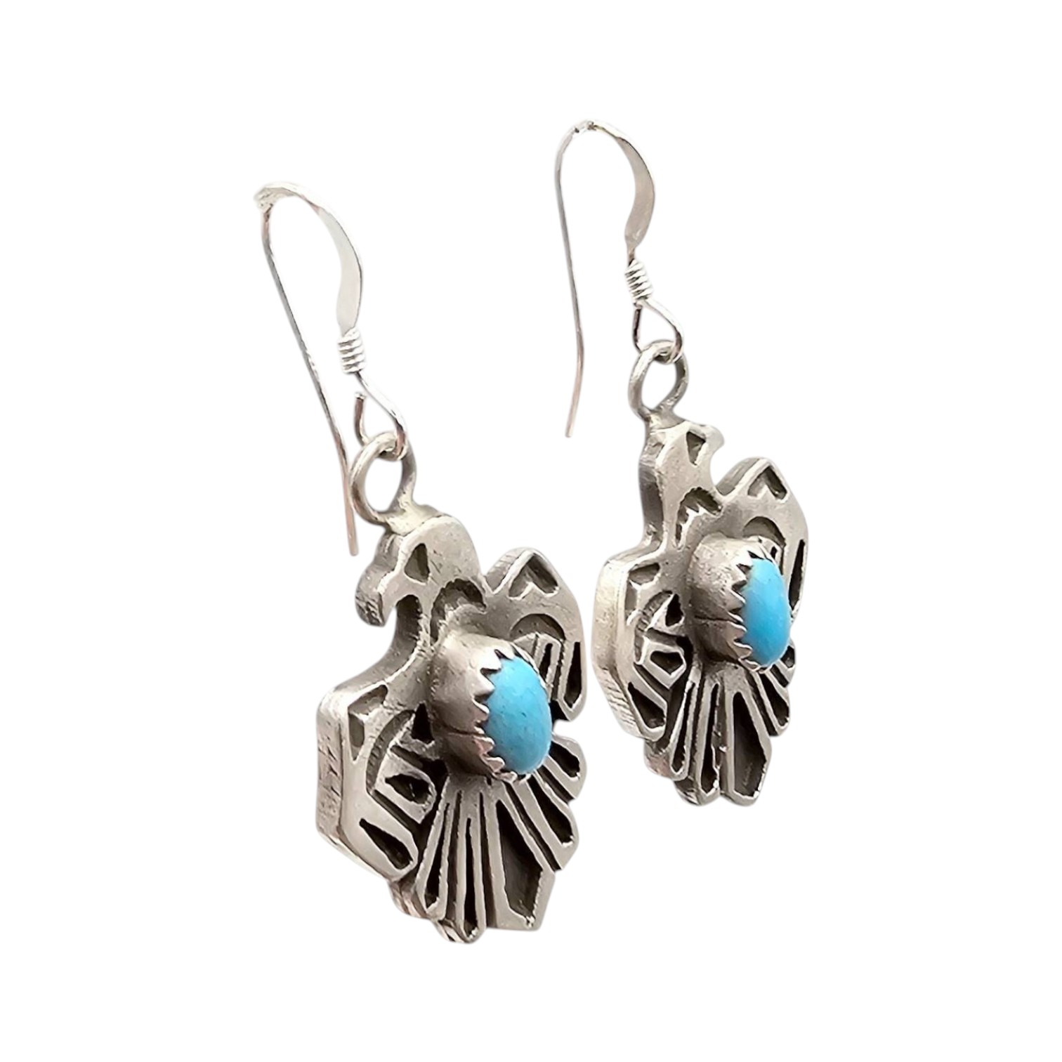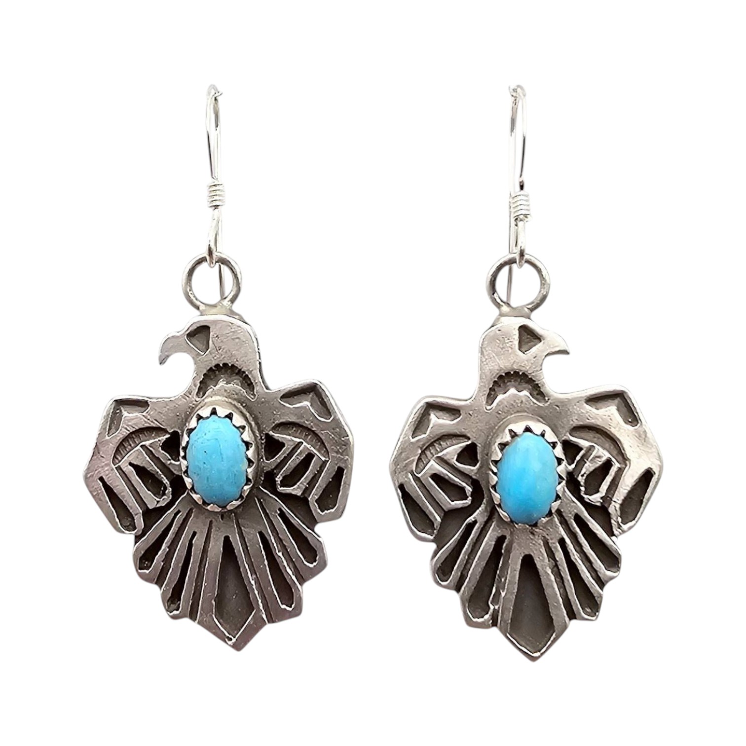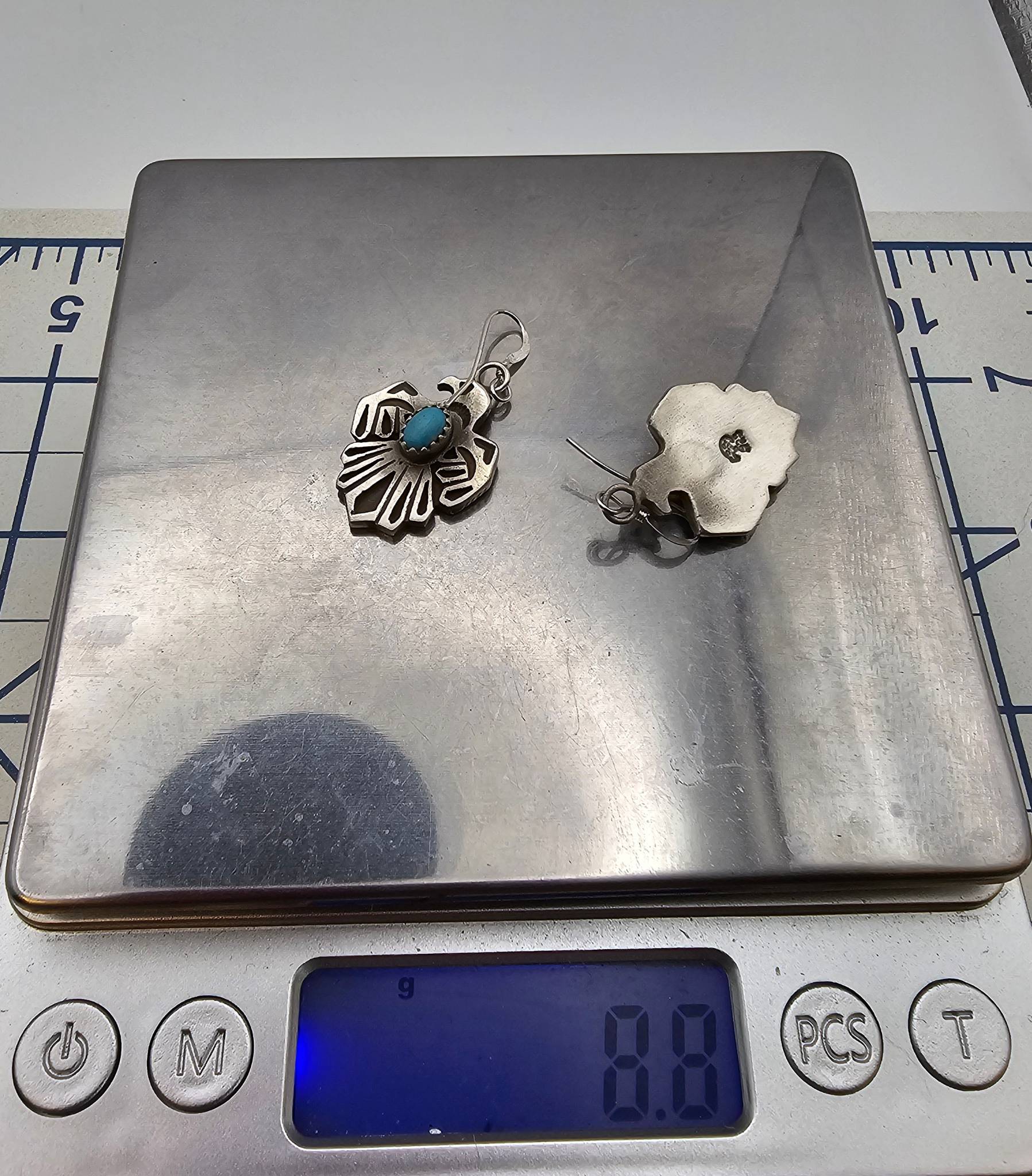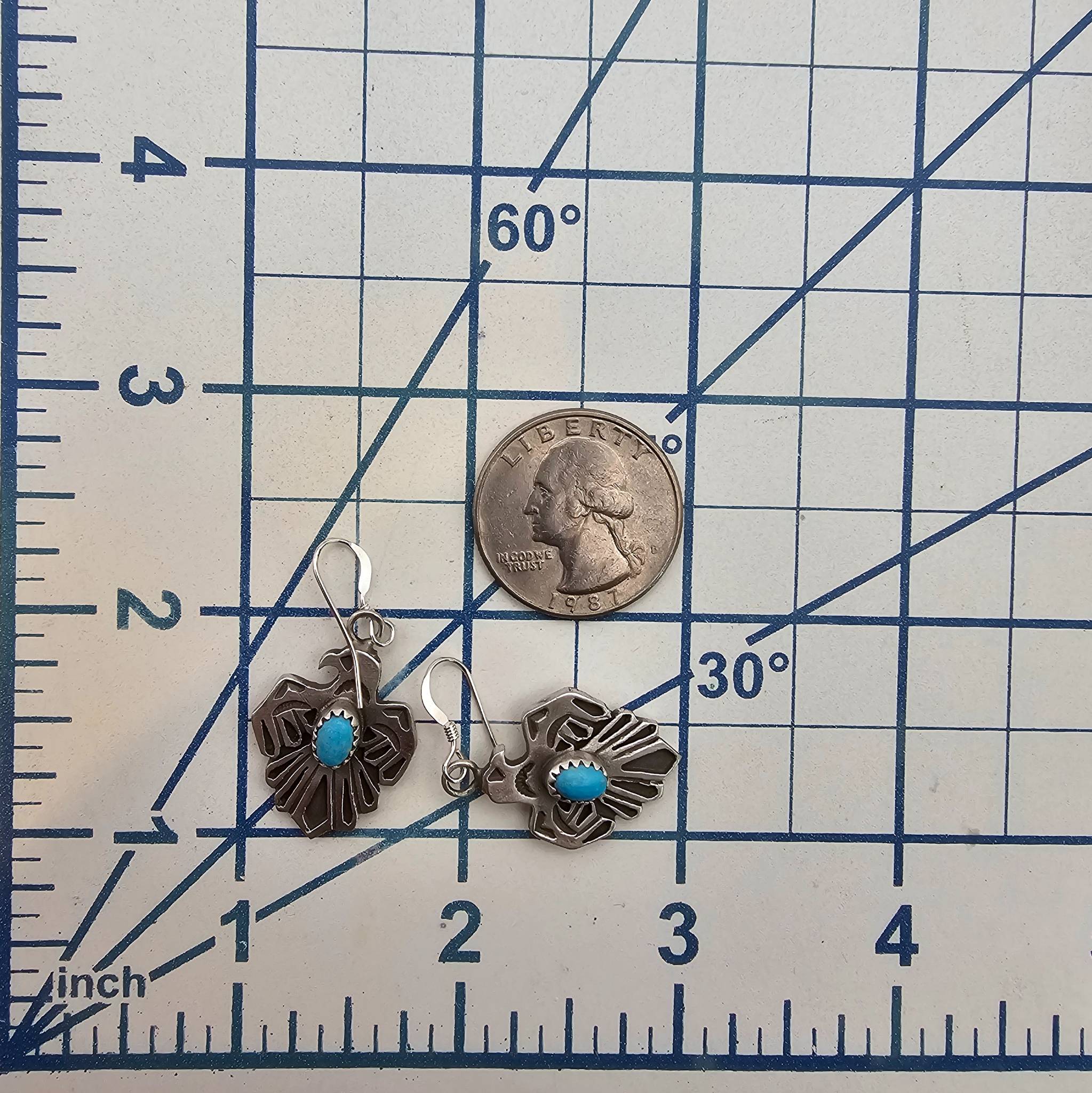 Handmade sterling silver earrings by Genevieve Francisco, a Navajo artisan. Features a detailed, cutout thunderbird design, each set with a central oval turquoise stone. Earrings are signed on the back with ‘GF’ hallmark. Combined weight is 8.8 grams. Ruler and coin shown for size reference.