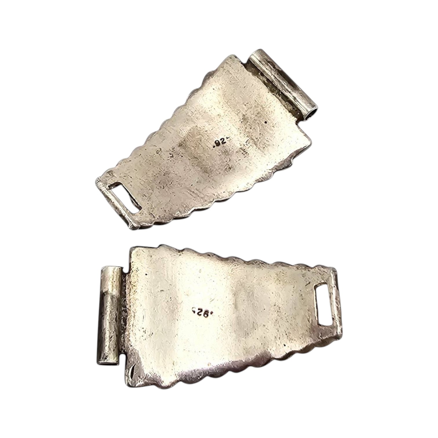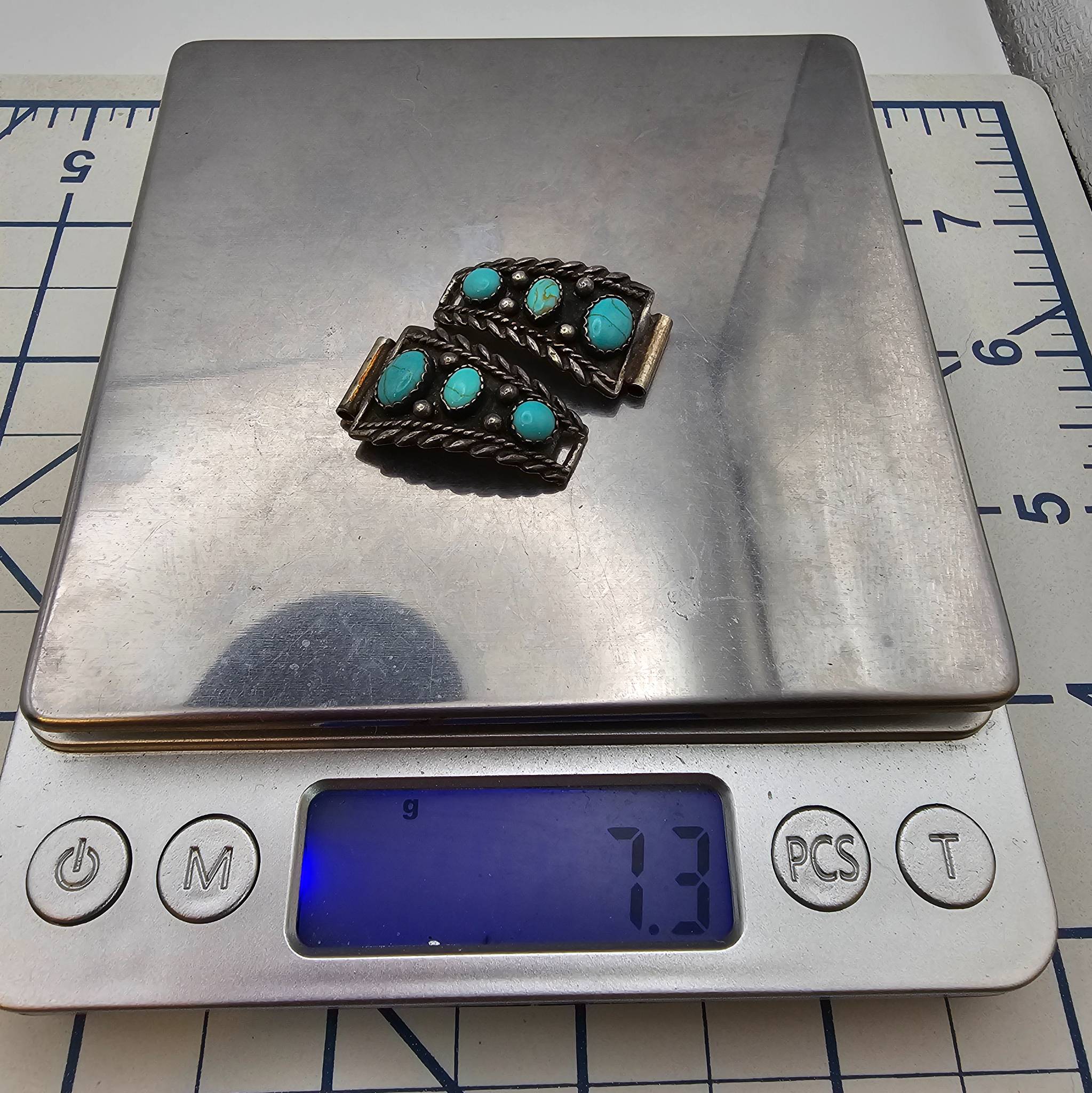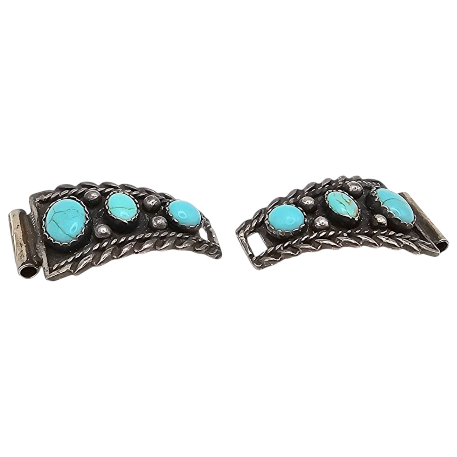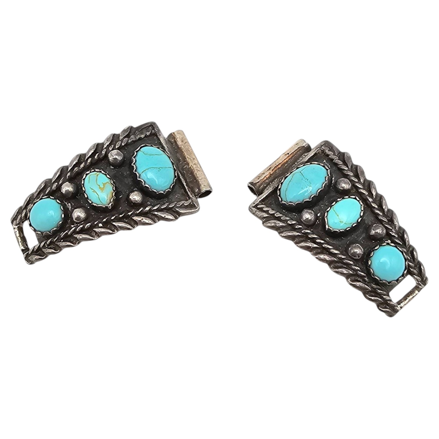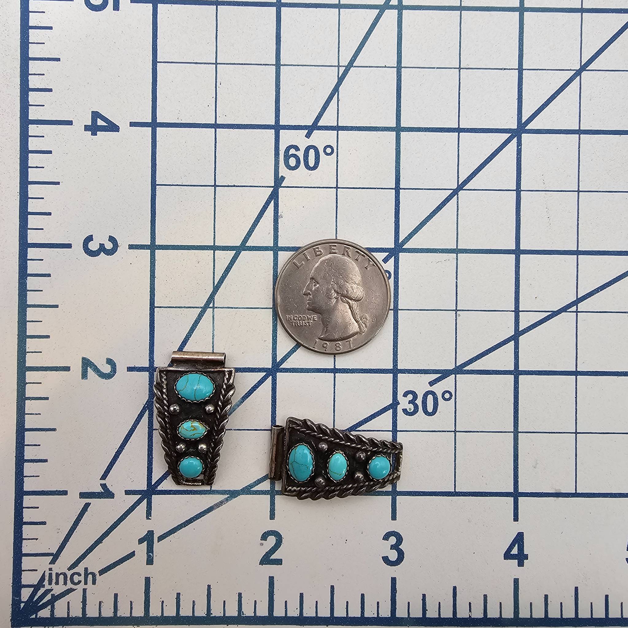 Native Southwestern watch nibs crafted from. sterling silver, adorned with turquoise cabochon inlays. Each piece features intricate rope and beadwork designs, weighing a total of 7.3 grams. The back is stamped with ‘ ‘.