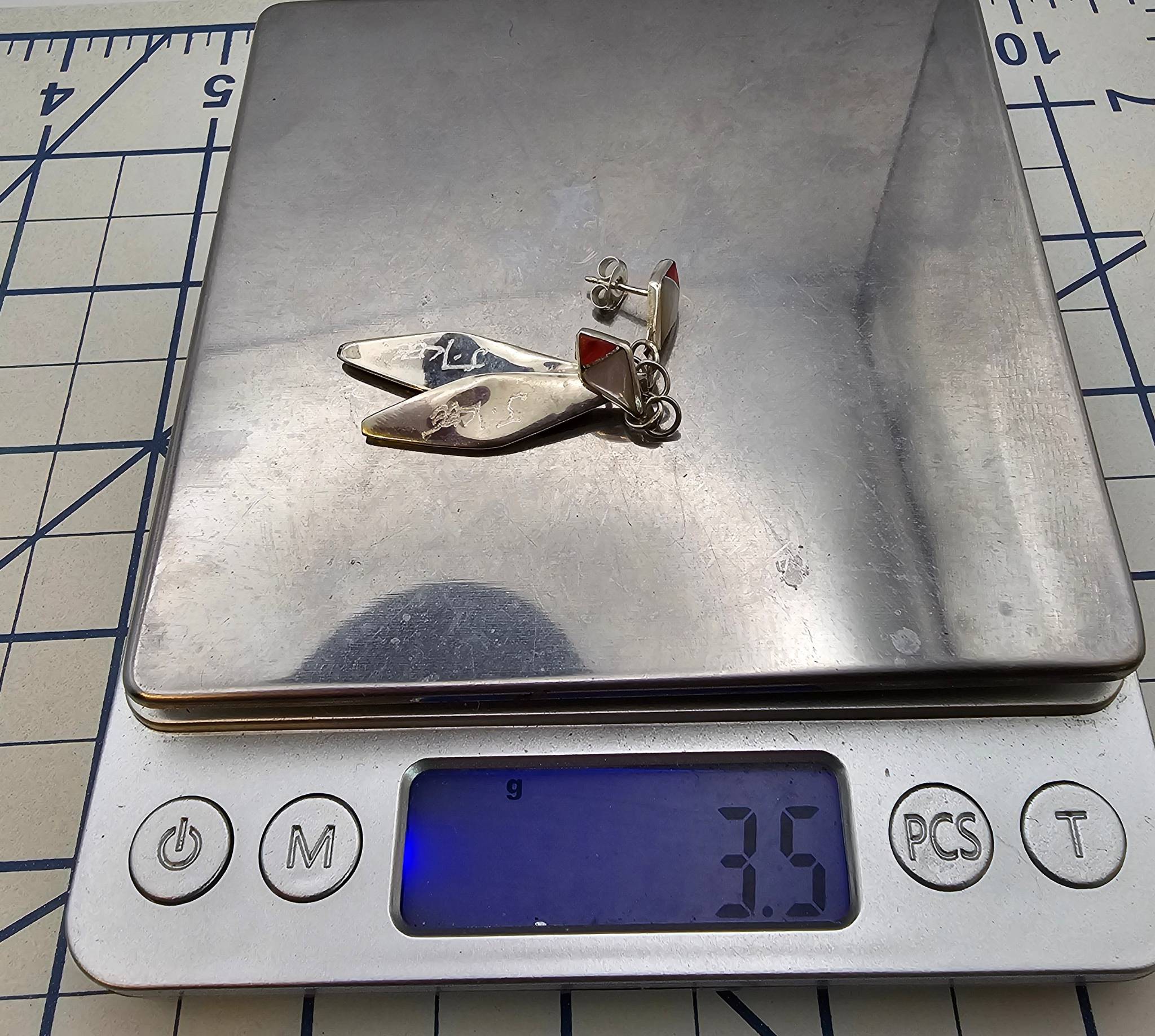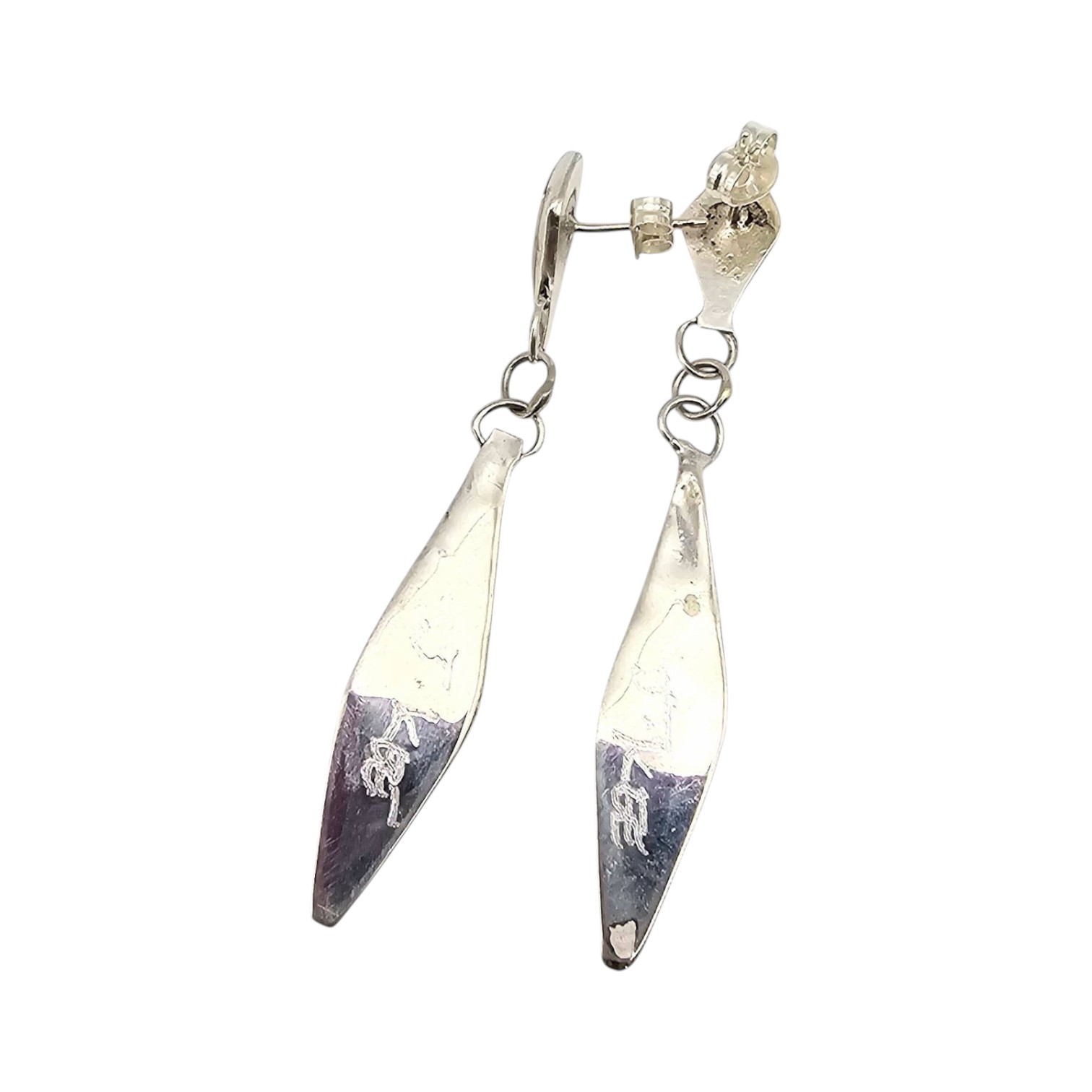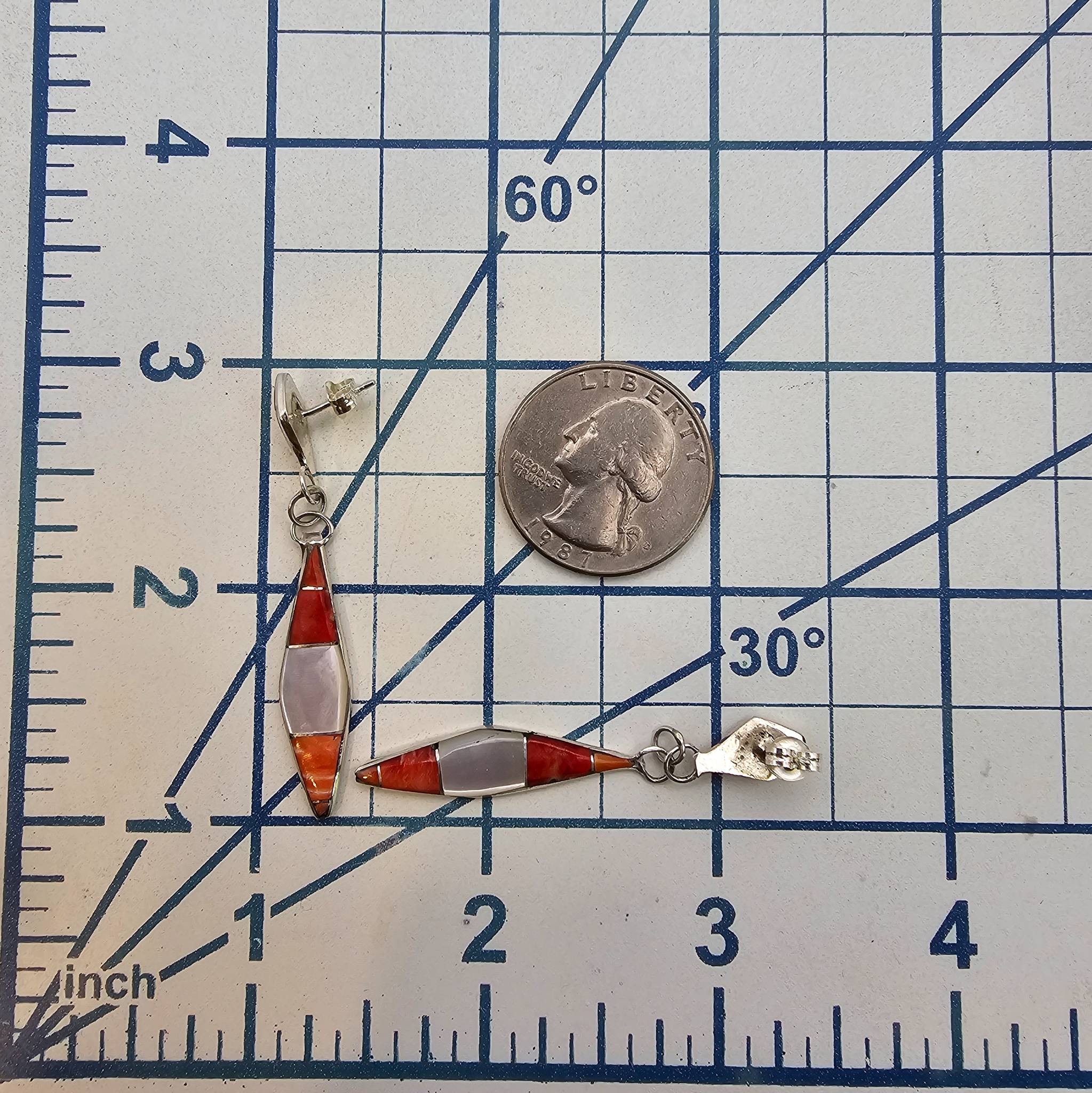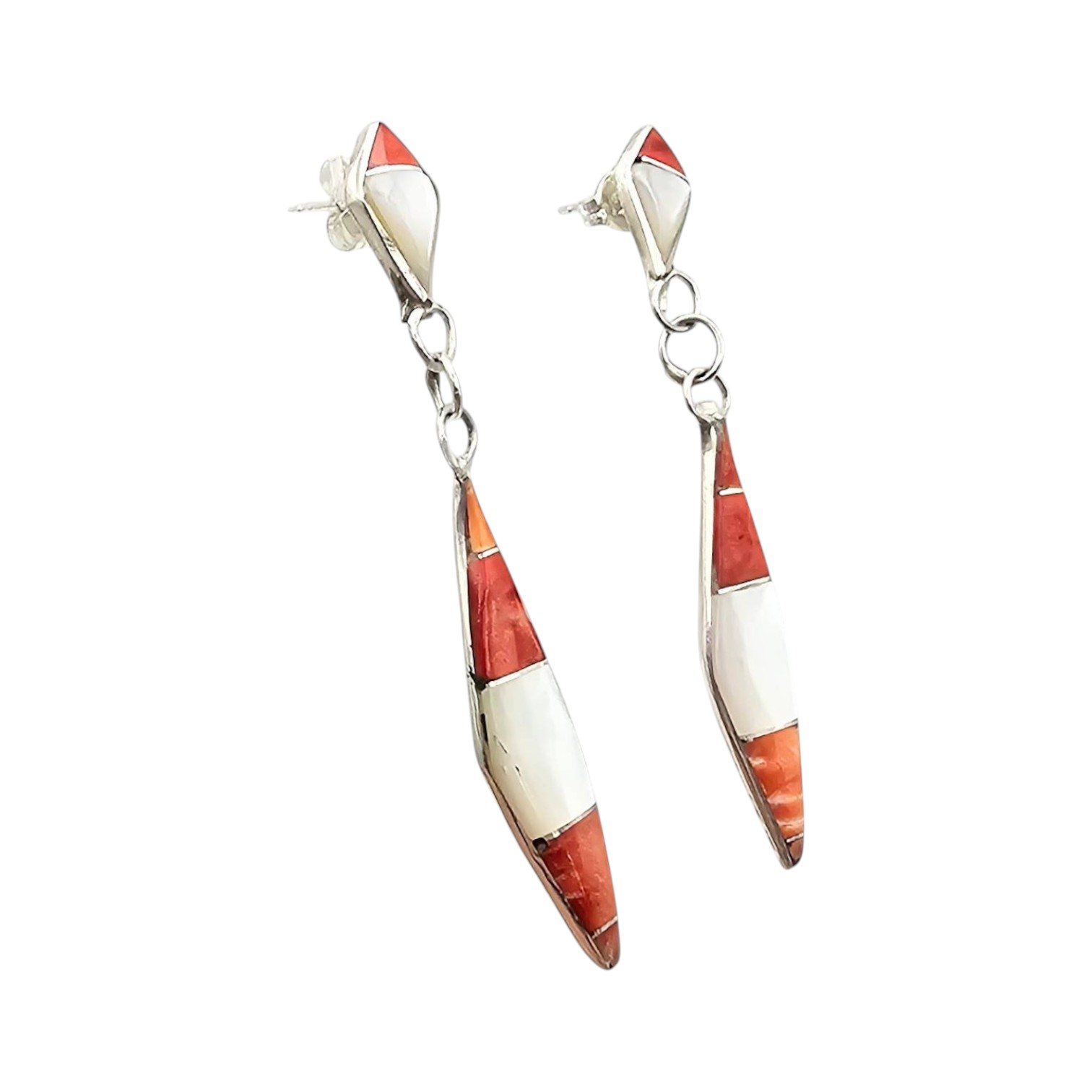 Sterling silver earrings handcrafted by James Kee, a Zuni artist. These earrings feature spiny oyster and shell inlay set in elongated geometric designs. The earrings measure approximately 2 inches in length and weigh 3.5 grams collectively. Backings are included. The reverse side shows the artist’s signature.