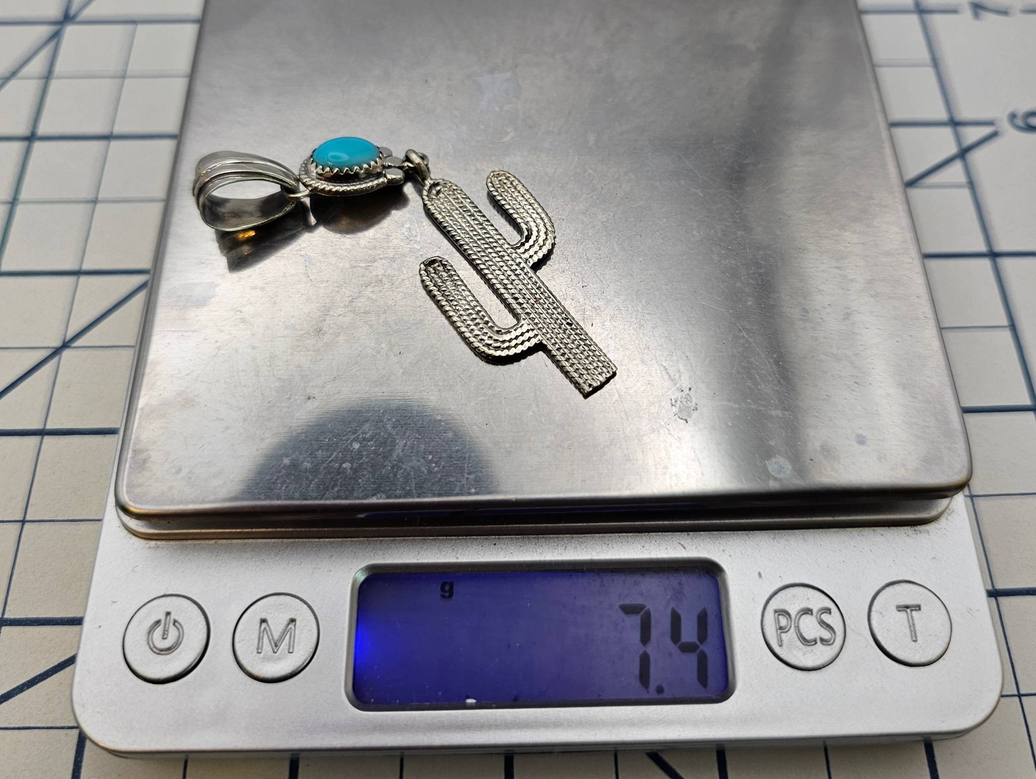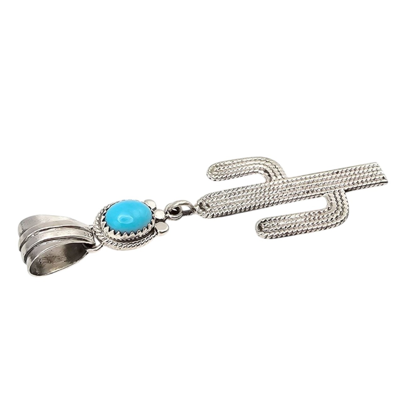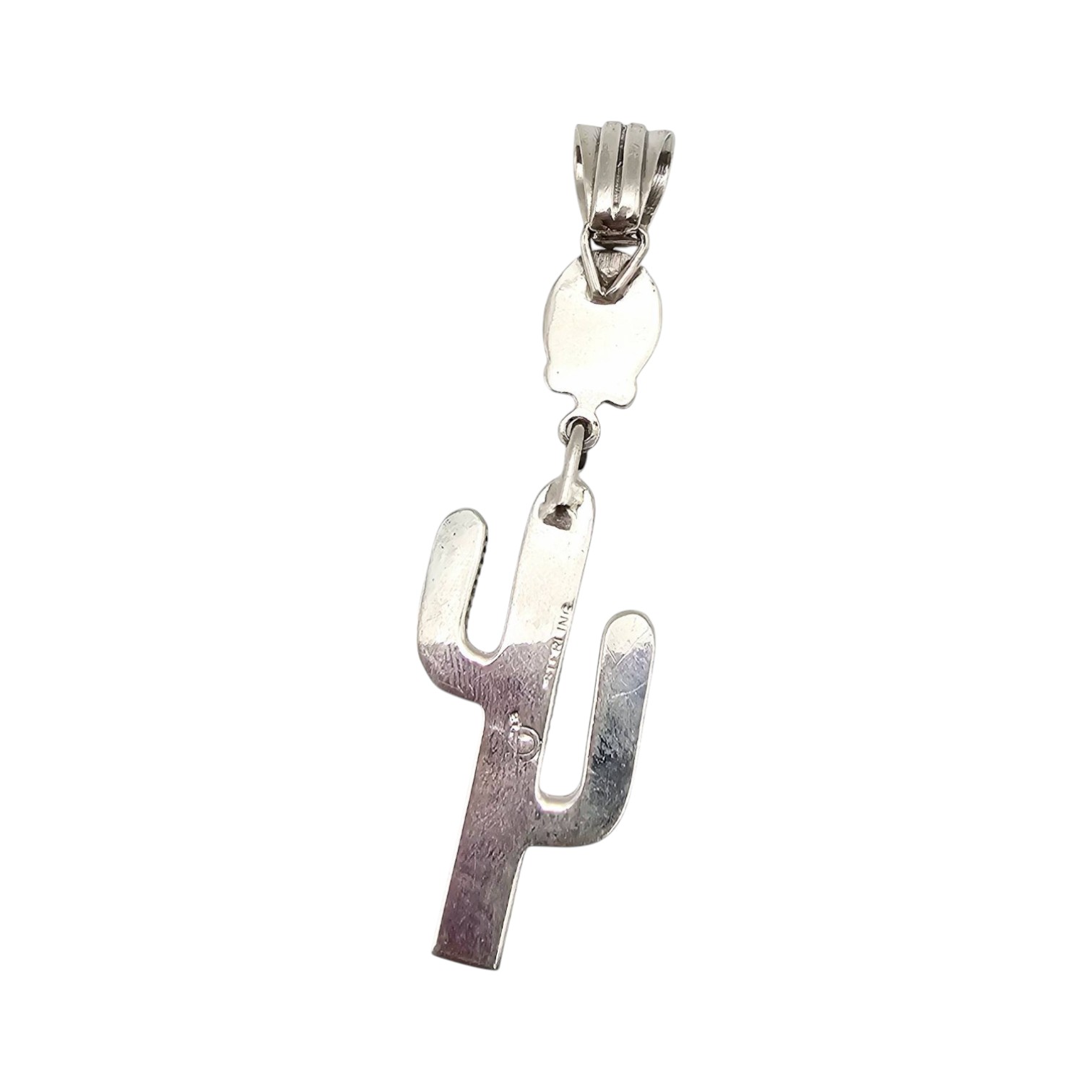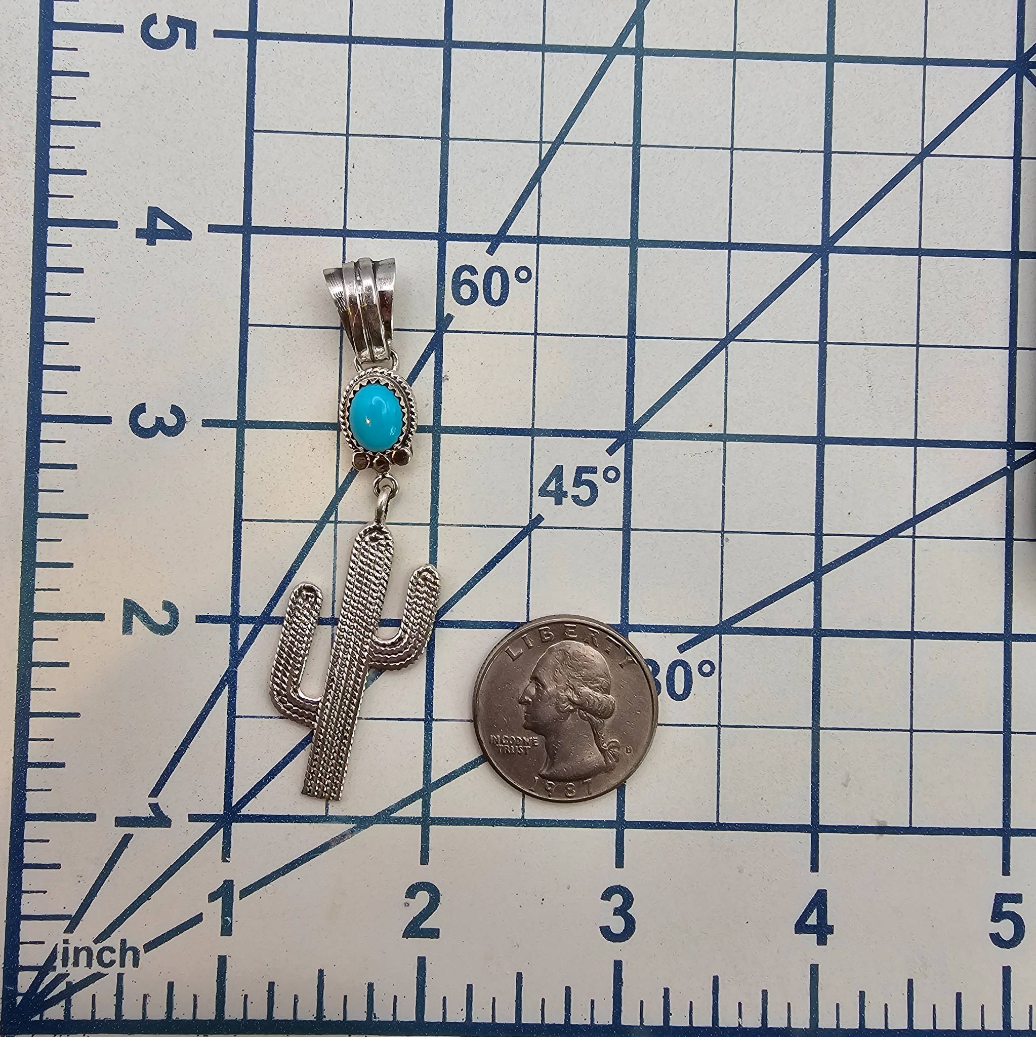 Handmade sterling silver cactus-shaped pendant by Navajo artisan Annie Spencer. This piece features a turquoise stone set in a bezel above the cactus with a decorative bail and weighs 7.4 grams.