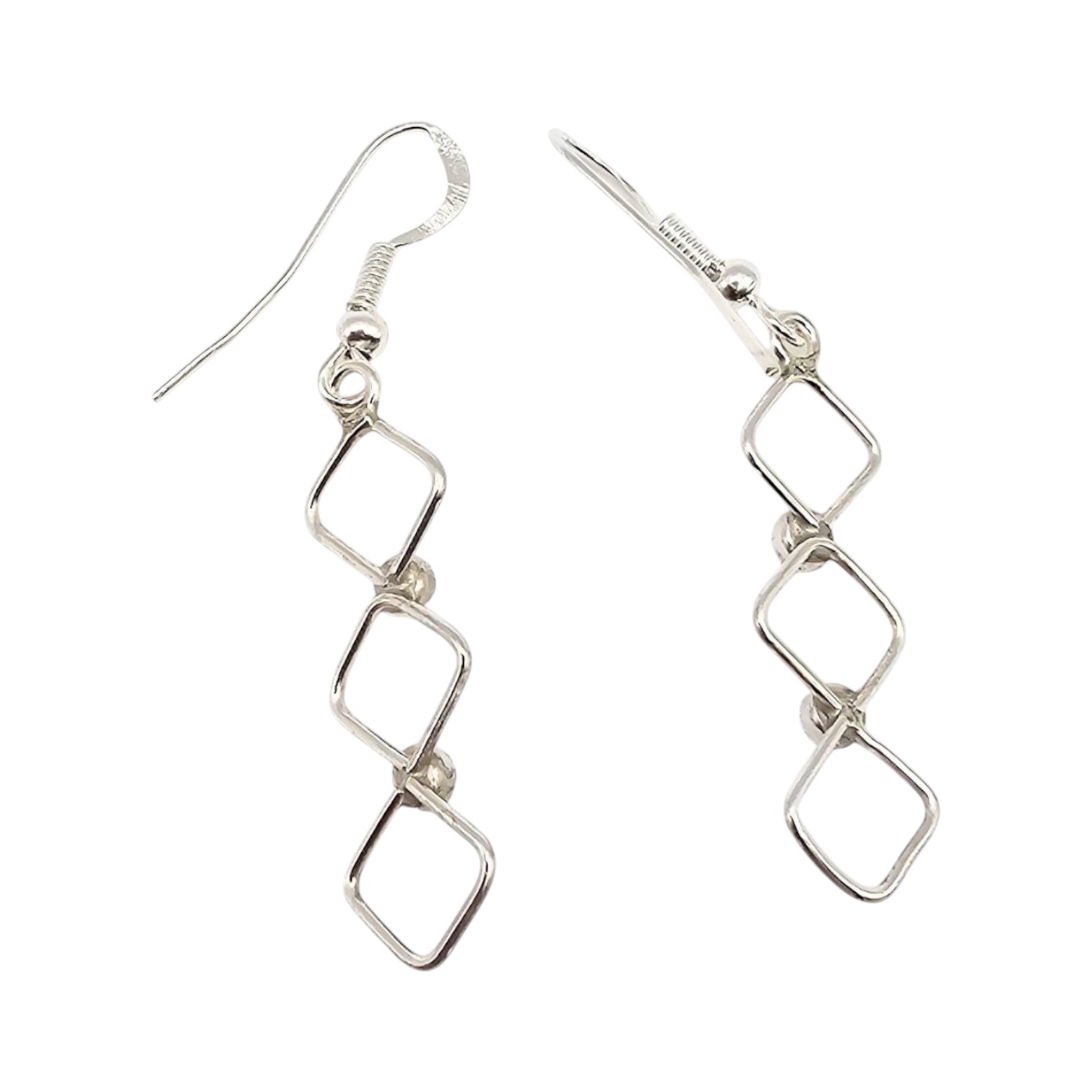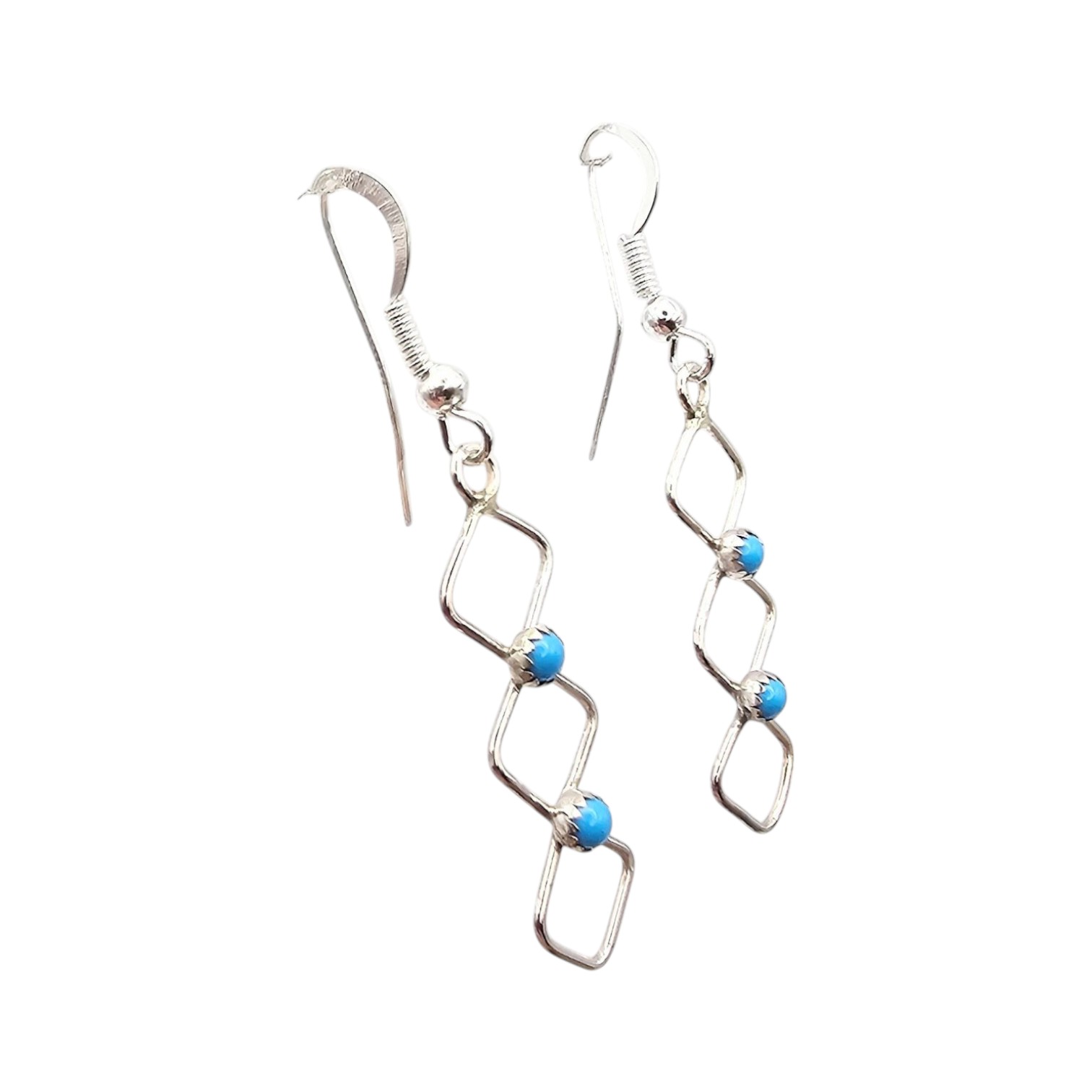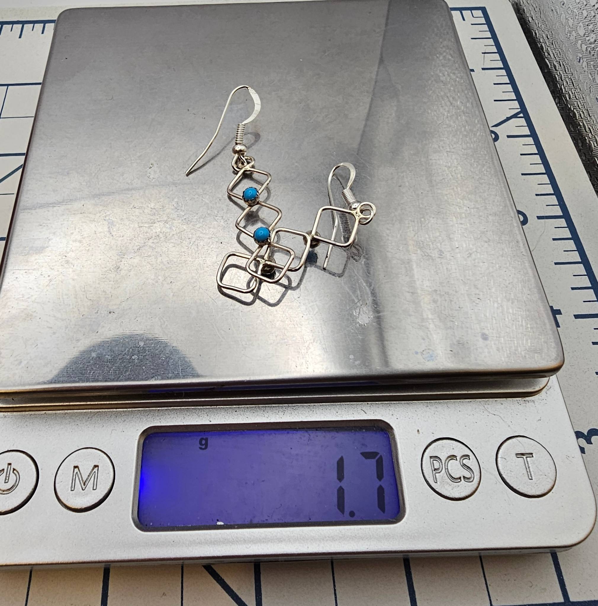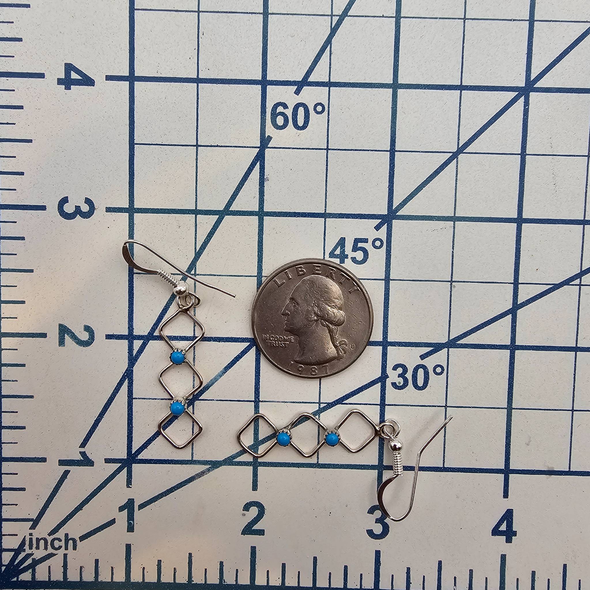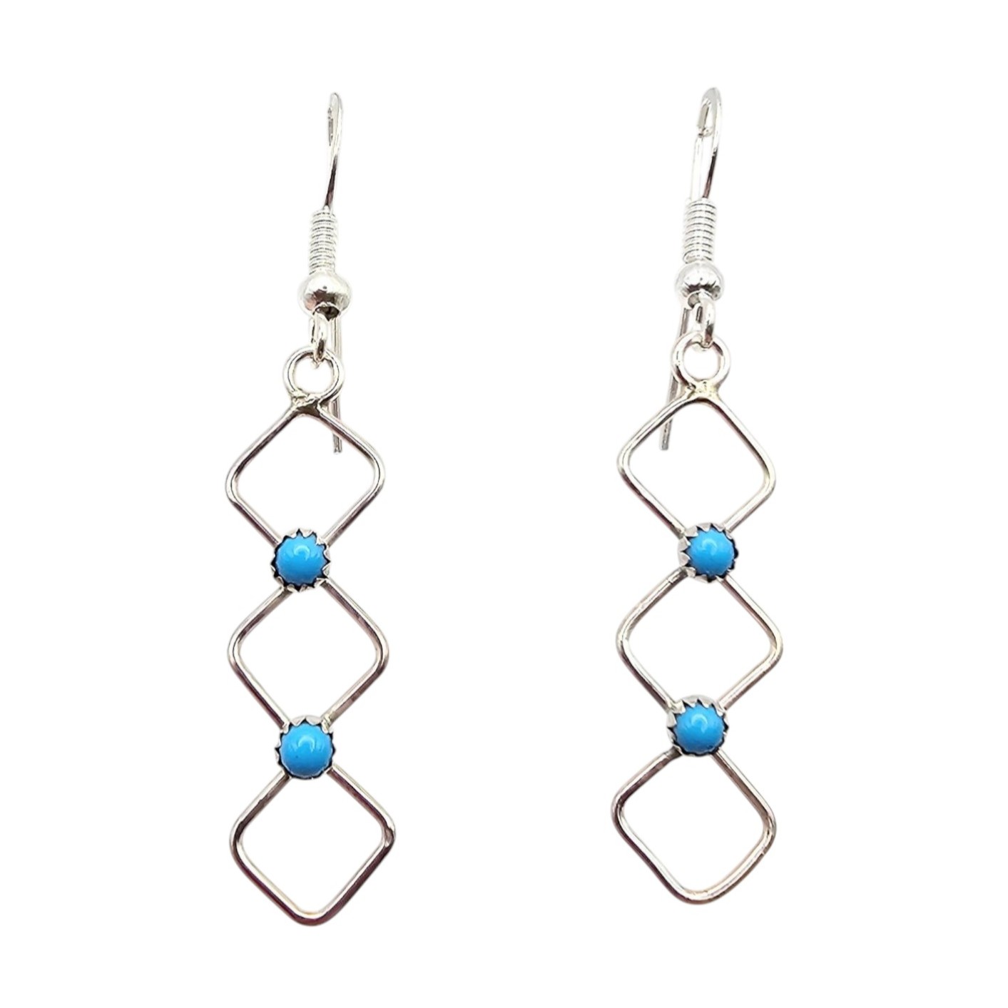 Navajo handmade dangle earrings by Sylvia Chee, featuring sterling silver (SS) and Kingman turquoise. The earrings have an elegant geometric design with hook backs and weigh 1.7 grams.