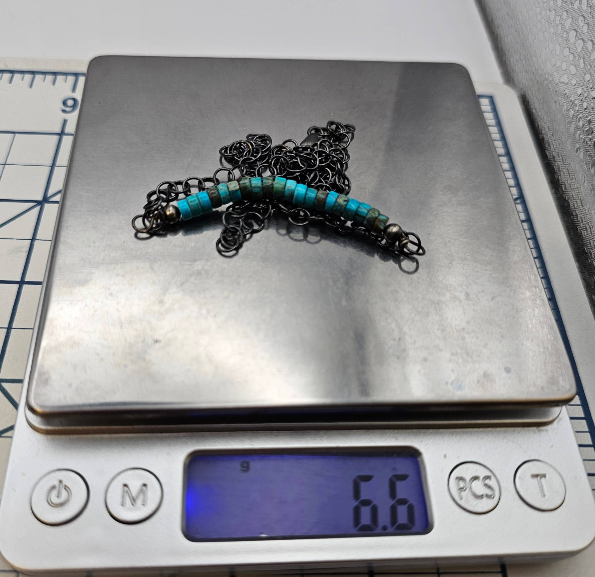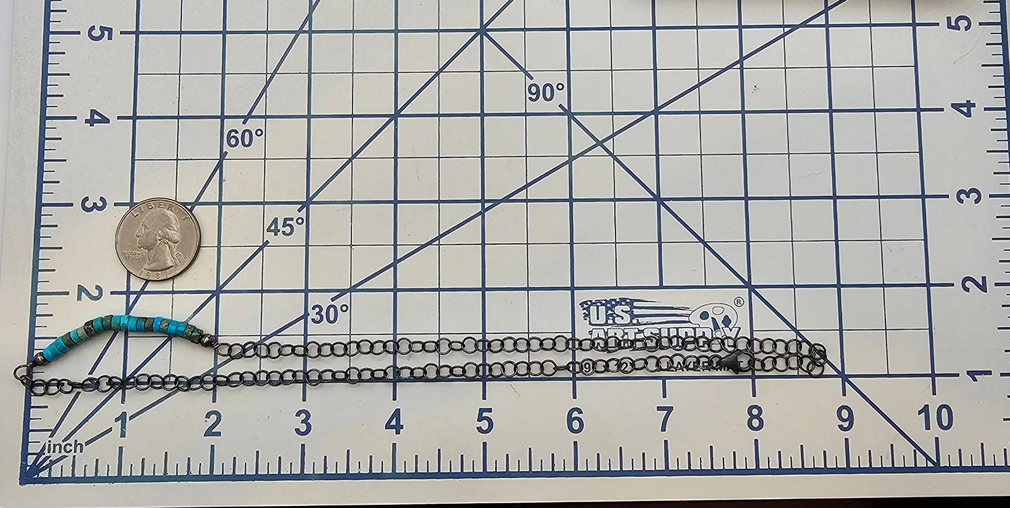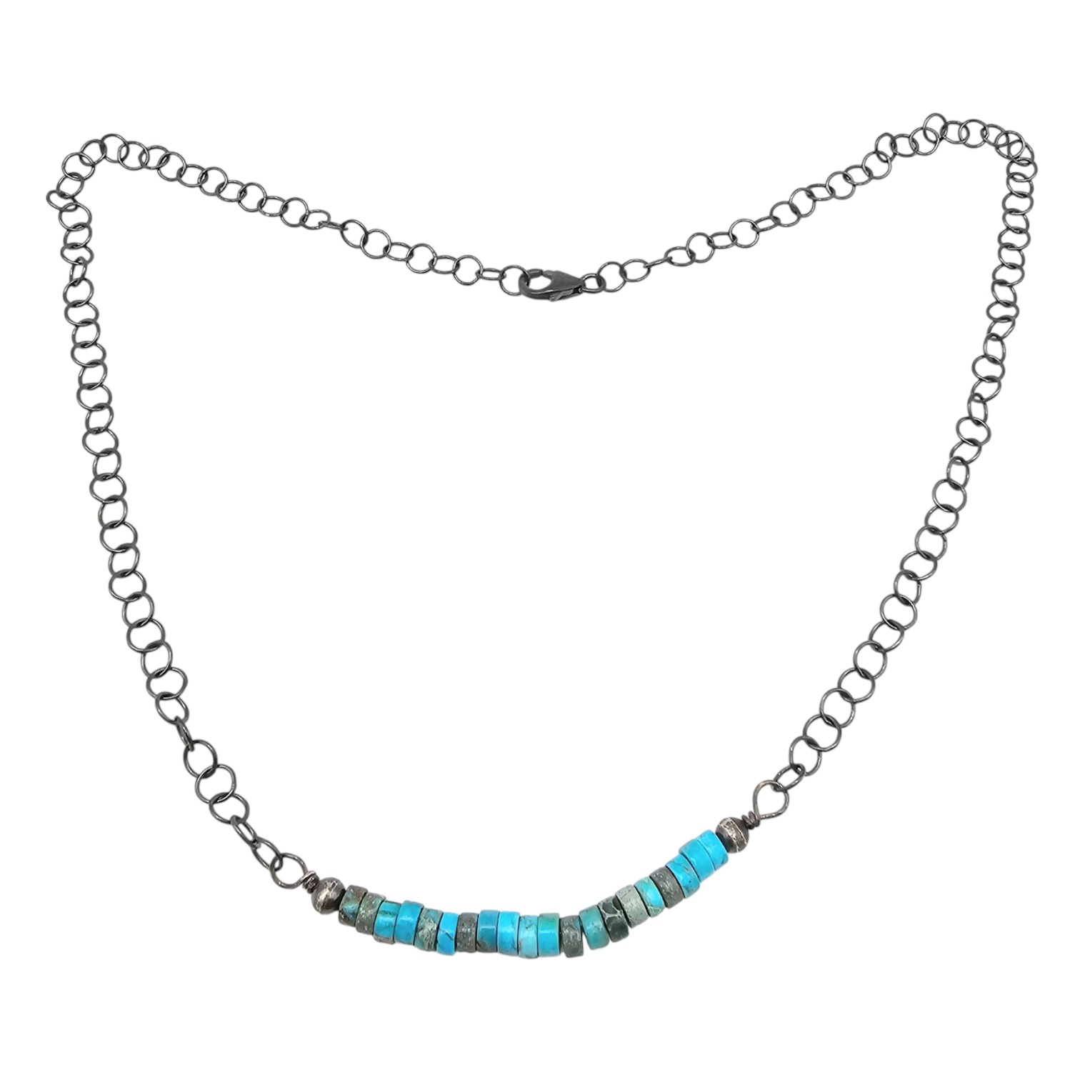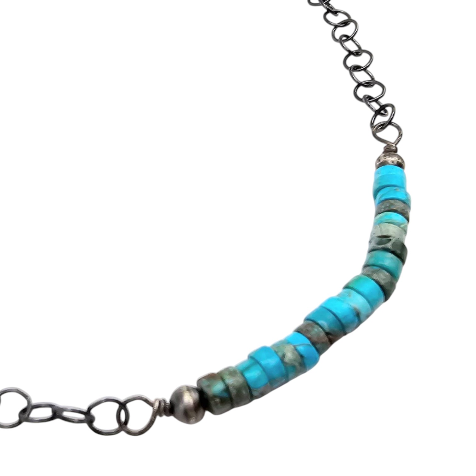 Handstrung Kingman turquoise necklace crafted by Corrane Smith, a Navajo artist. Features blue and green turquoise beads on robust Sterling silver chain links with a lobster clasp closure. Measures approximately 18 inches in length.