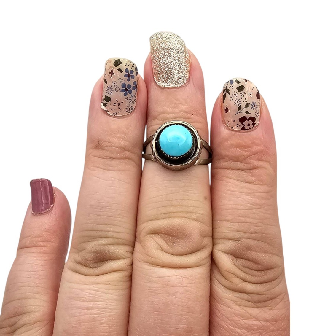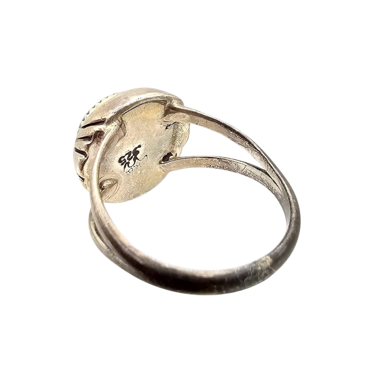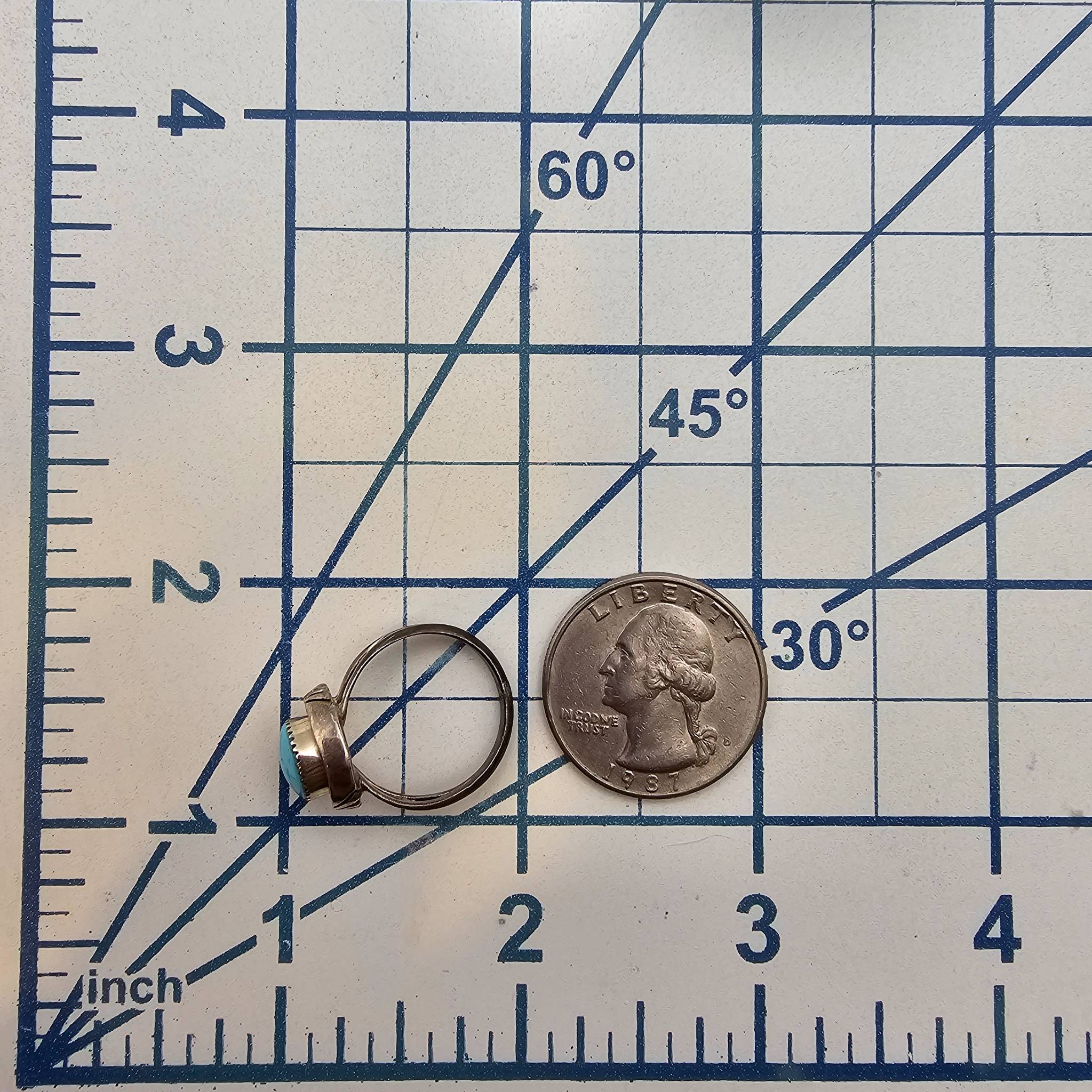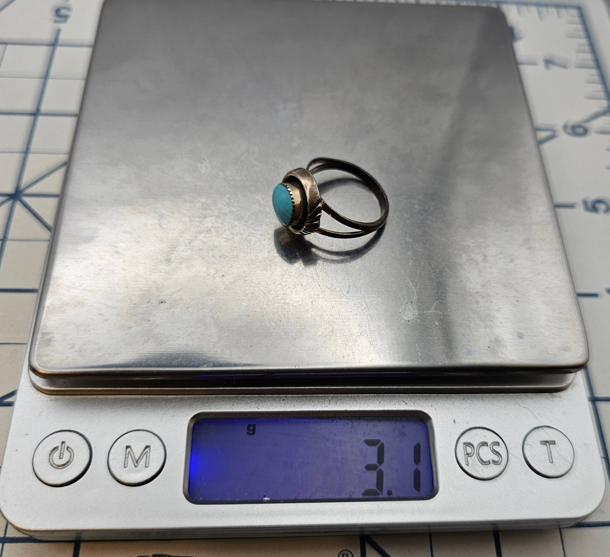 Sterling silver ring crafted by Running Bear, featuring a turquoise stone centerpiece. The ring is marked ‘ ‘ and bears the Running Bear hallmark. It is a size 5.75 and weighs 3.1 grams. The piece shows a classic design with simple silver accents around the vibrant turquoise.
