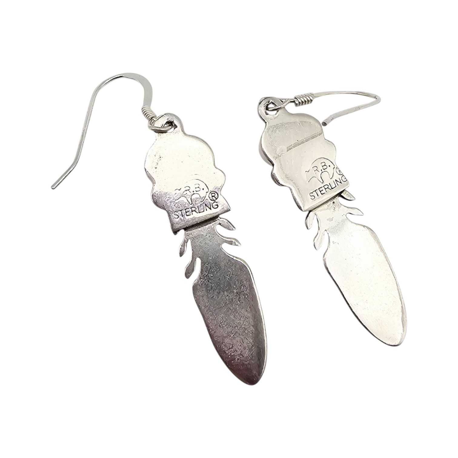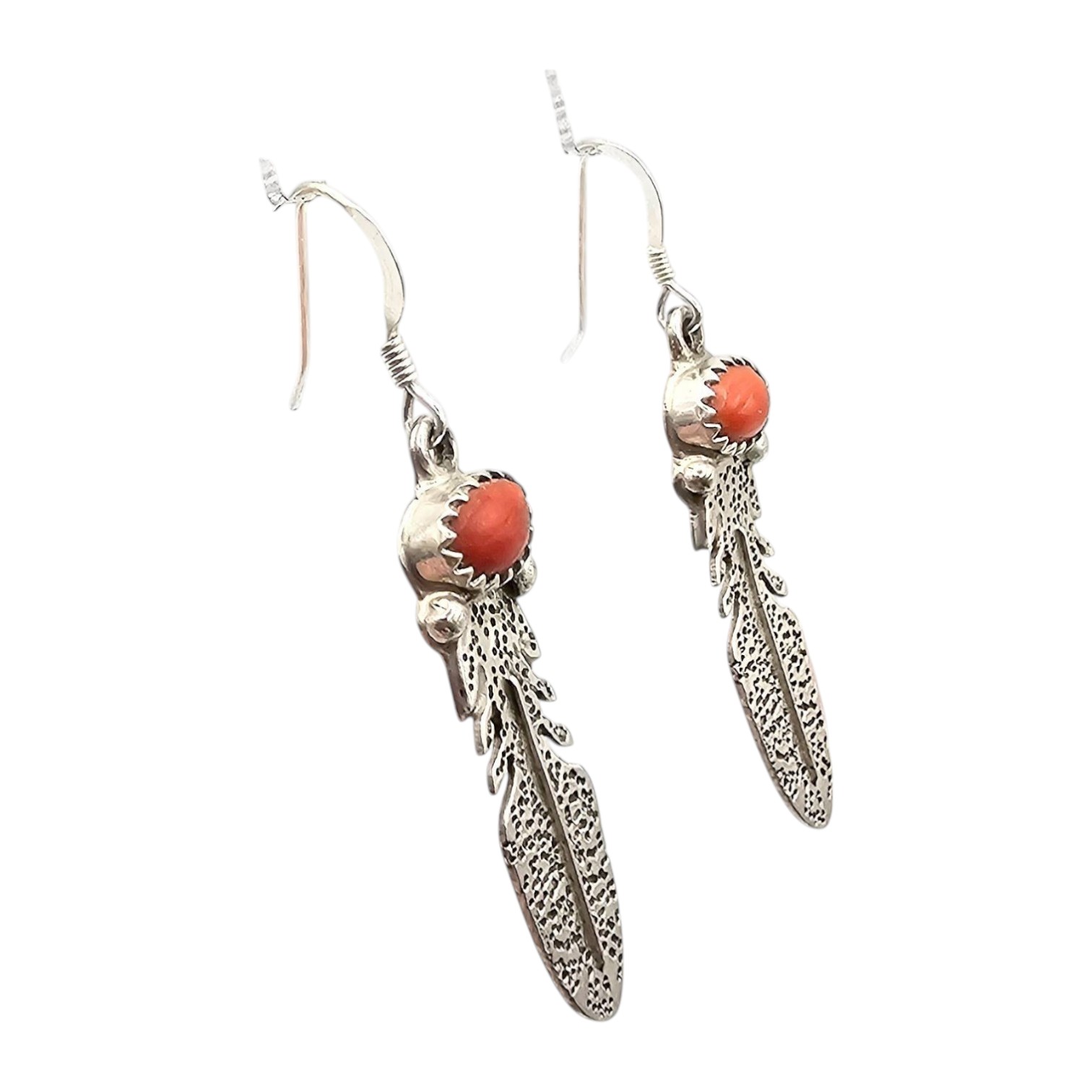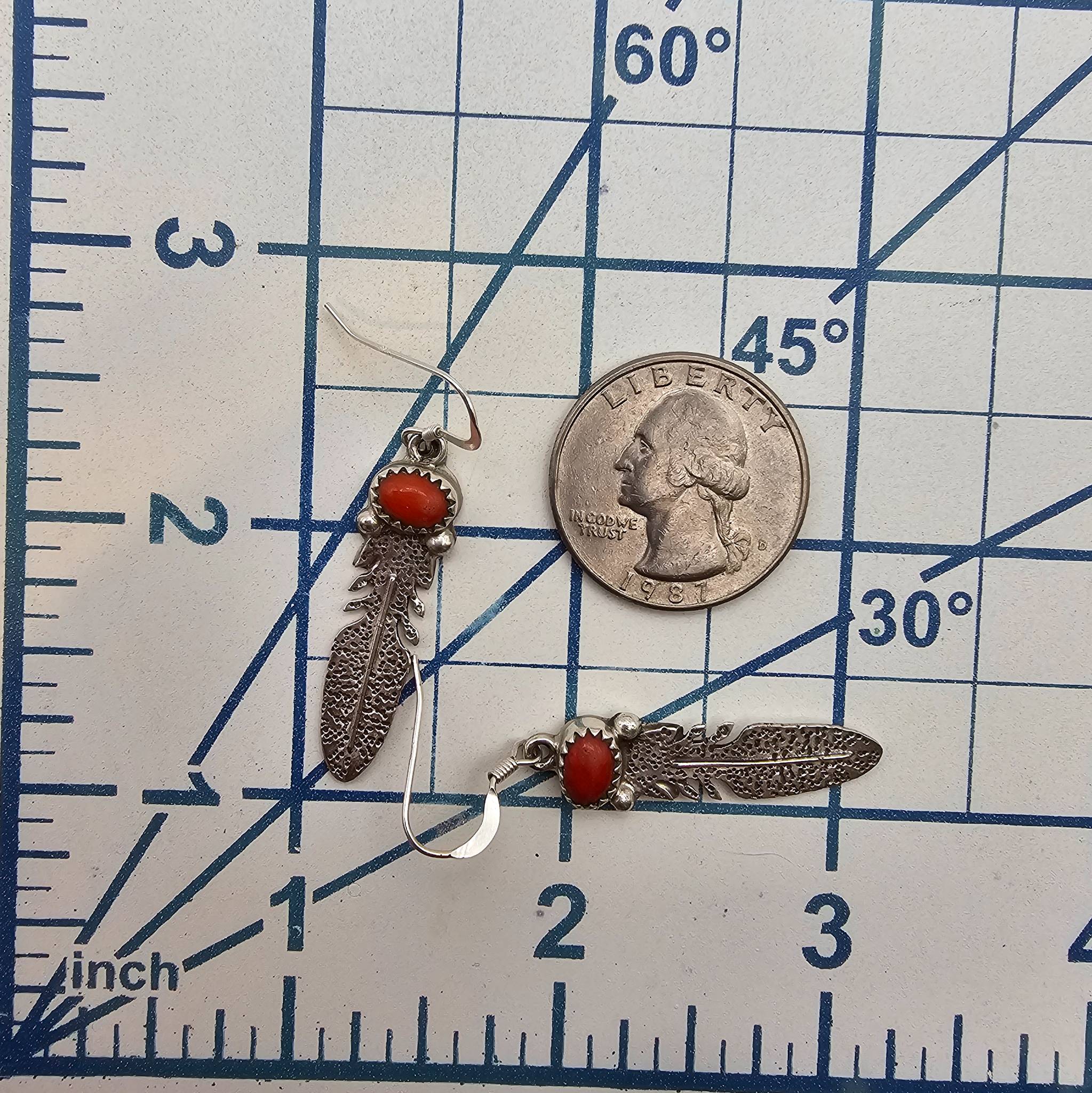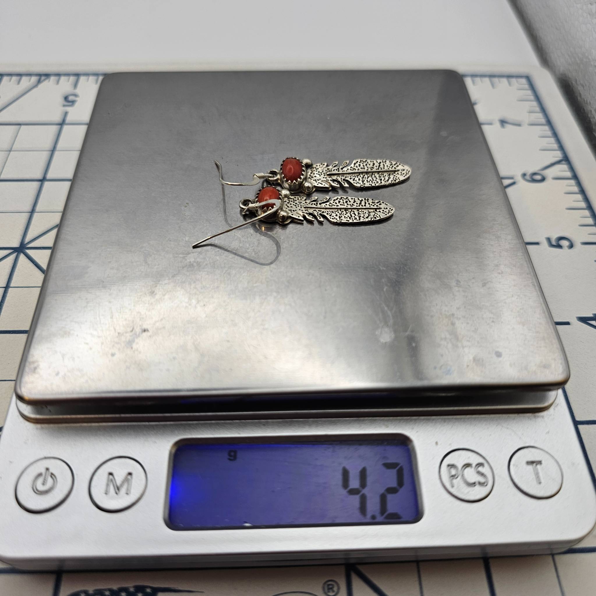 Sterling silver feather earrings by Running Bear, featuring coral cabochon accents. Each earring has a stamped Running Bear hallmark and ‘STERLING’ marking. Total weight of the pair is 4.2 grams. Earrings measure approximately 1.75 inches in length without hooks.