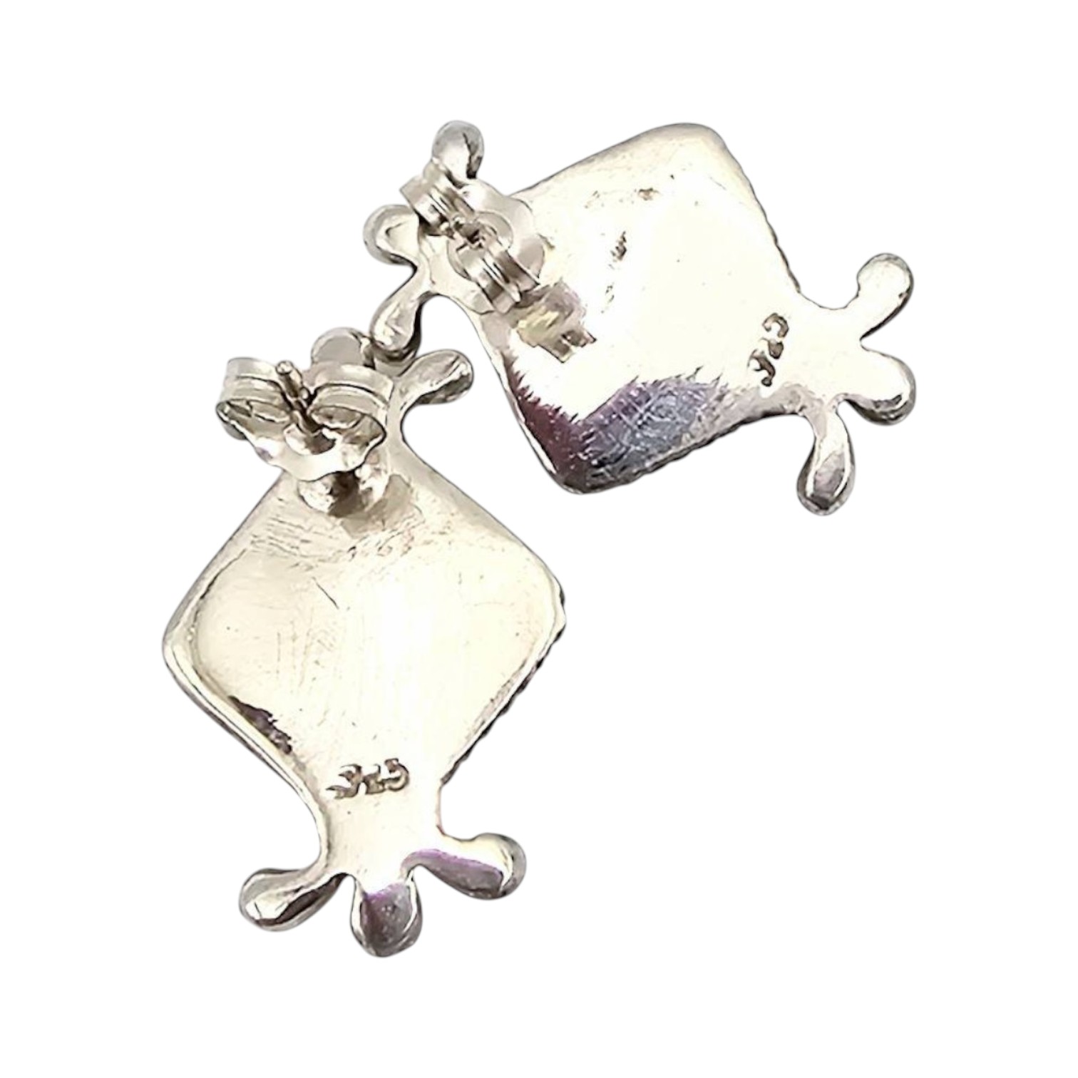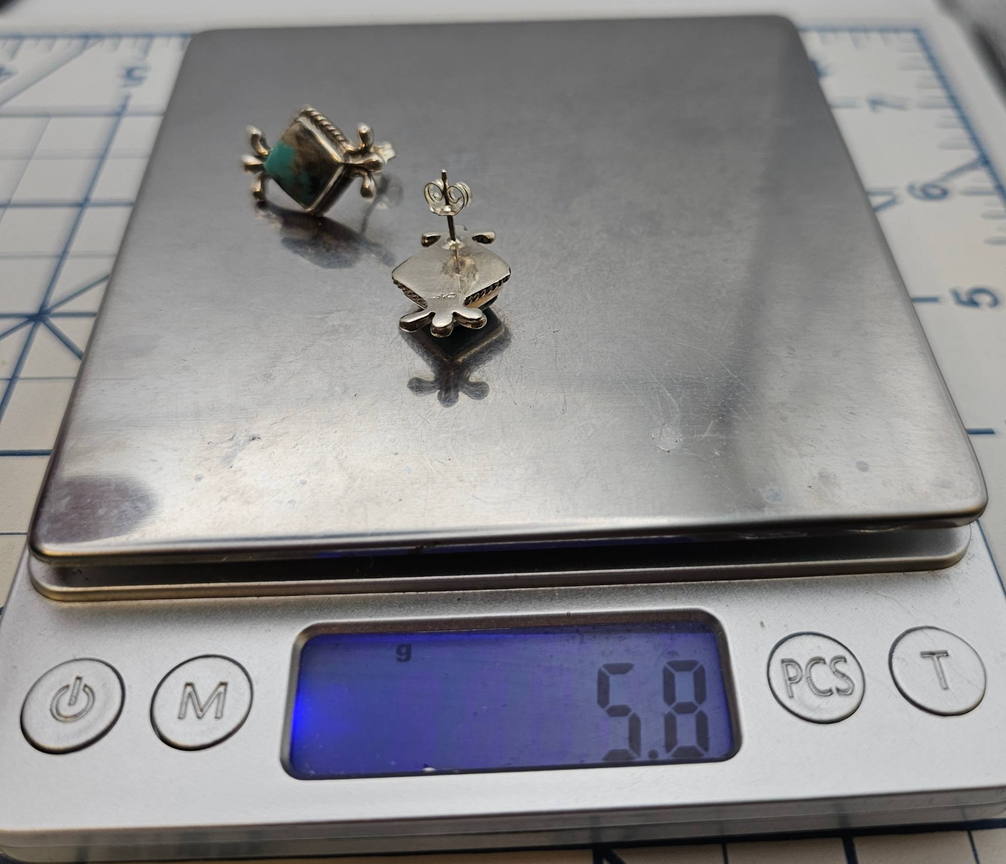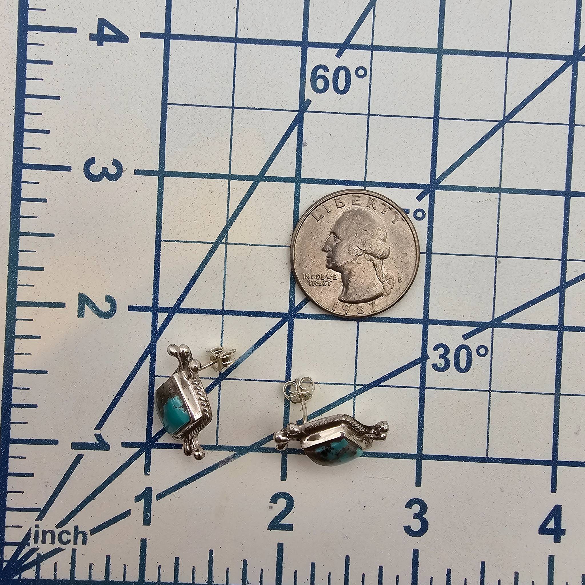 Sterling silver earrings handmade by Navajo artisan Louise Joe. Designed with Kingman turquoise stones set in square bezels surrounded by rope detailing and decorative silver accents. Earrings are marked ‘ ‘ on the back and weigh approximately 5.8 grams in total. Dimensions align with the scale and ruler shown.