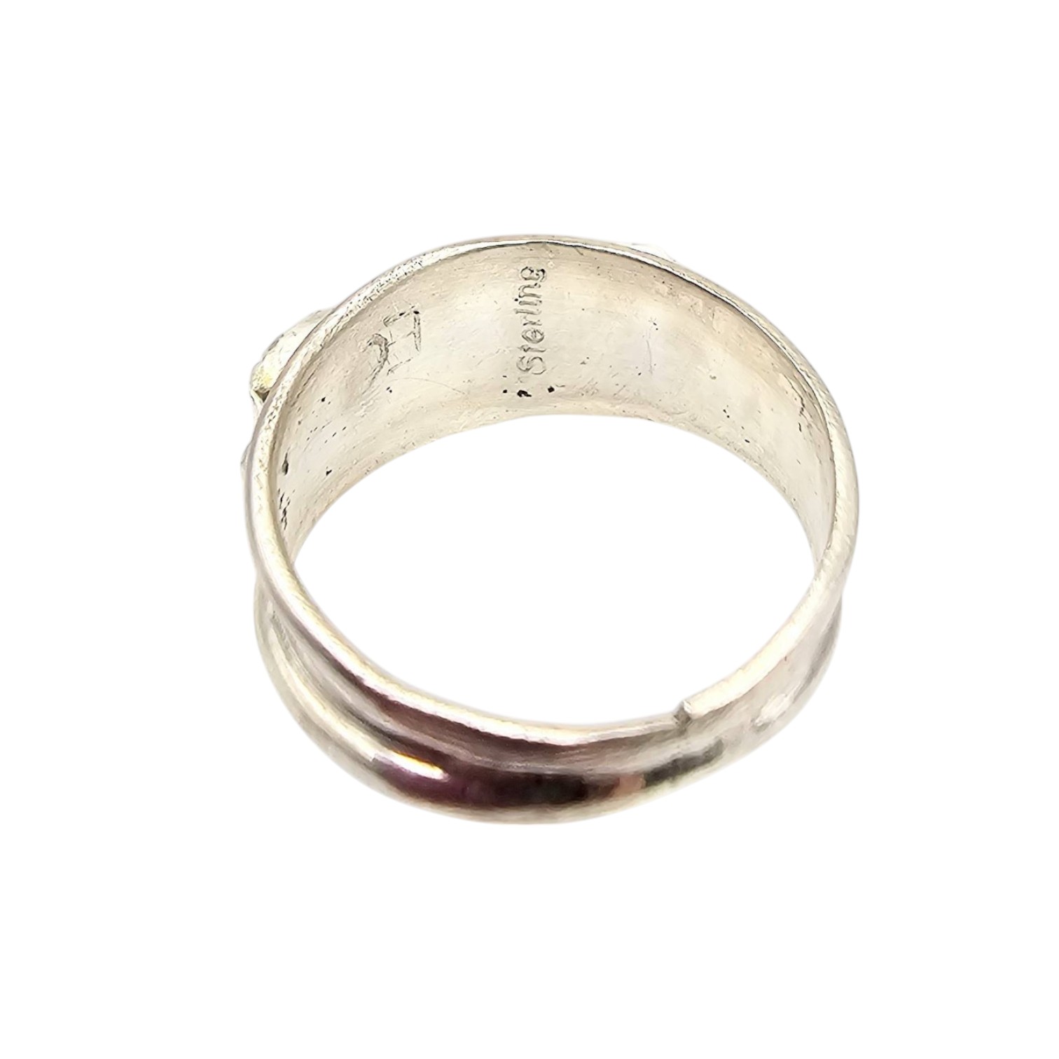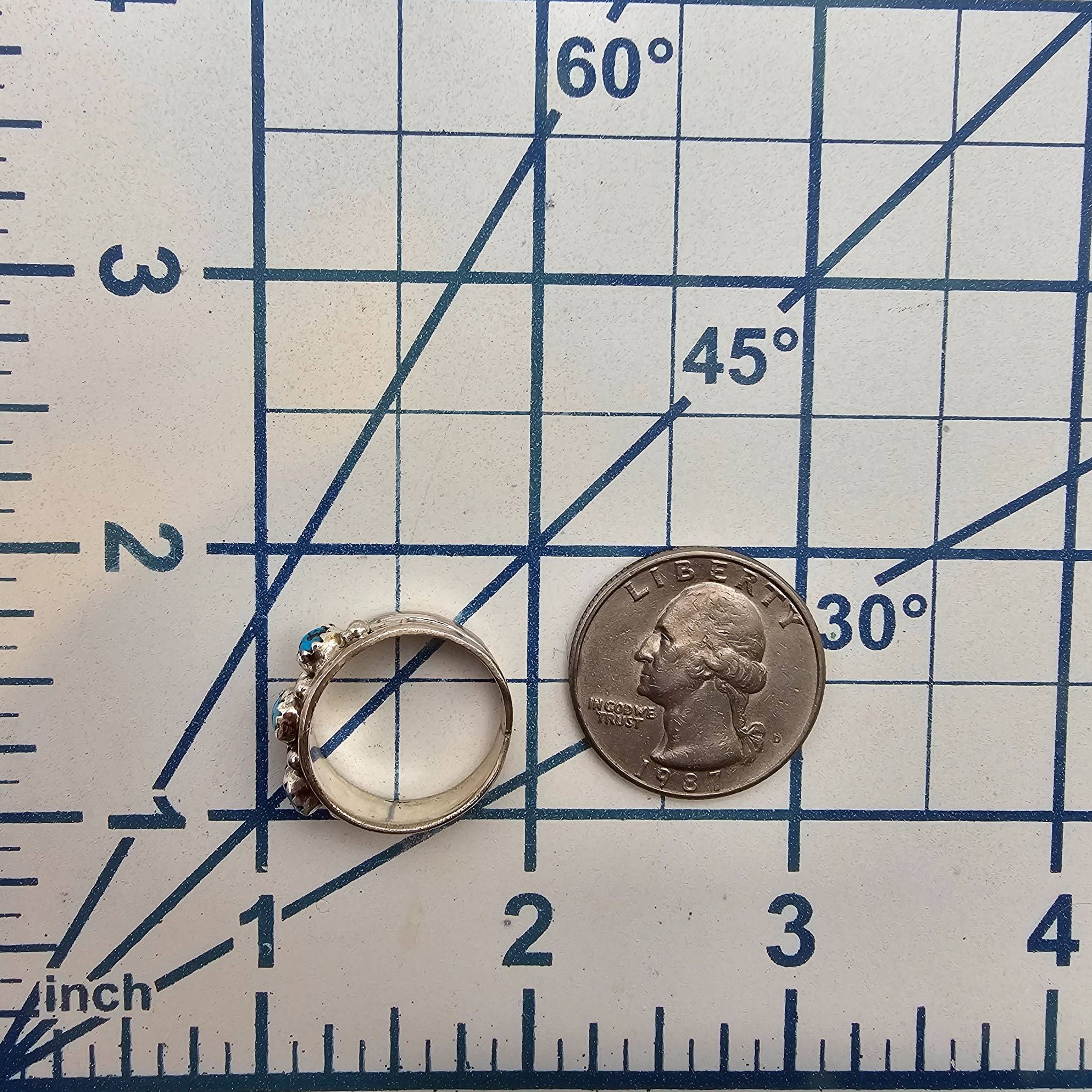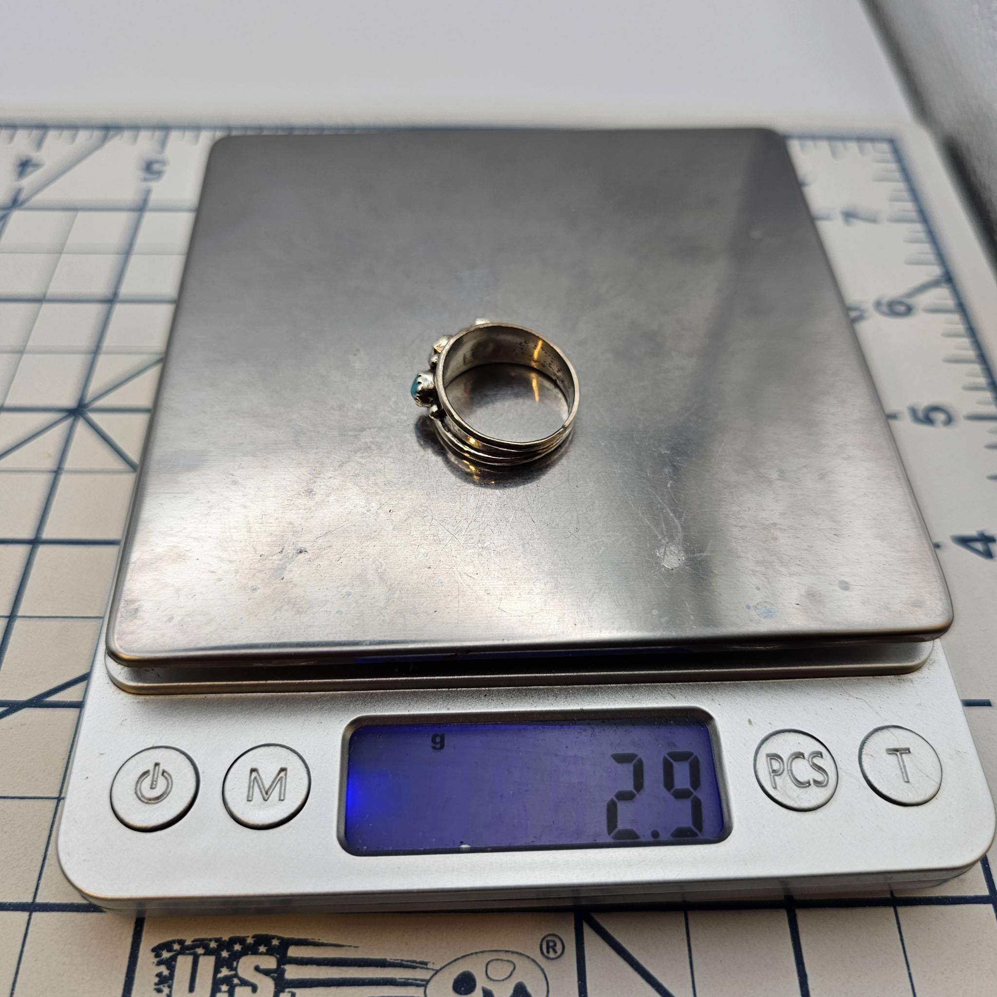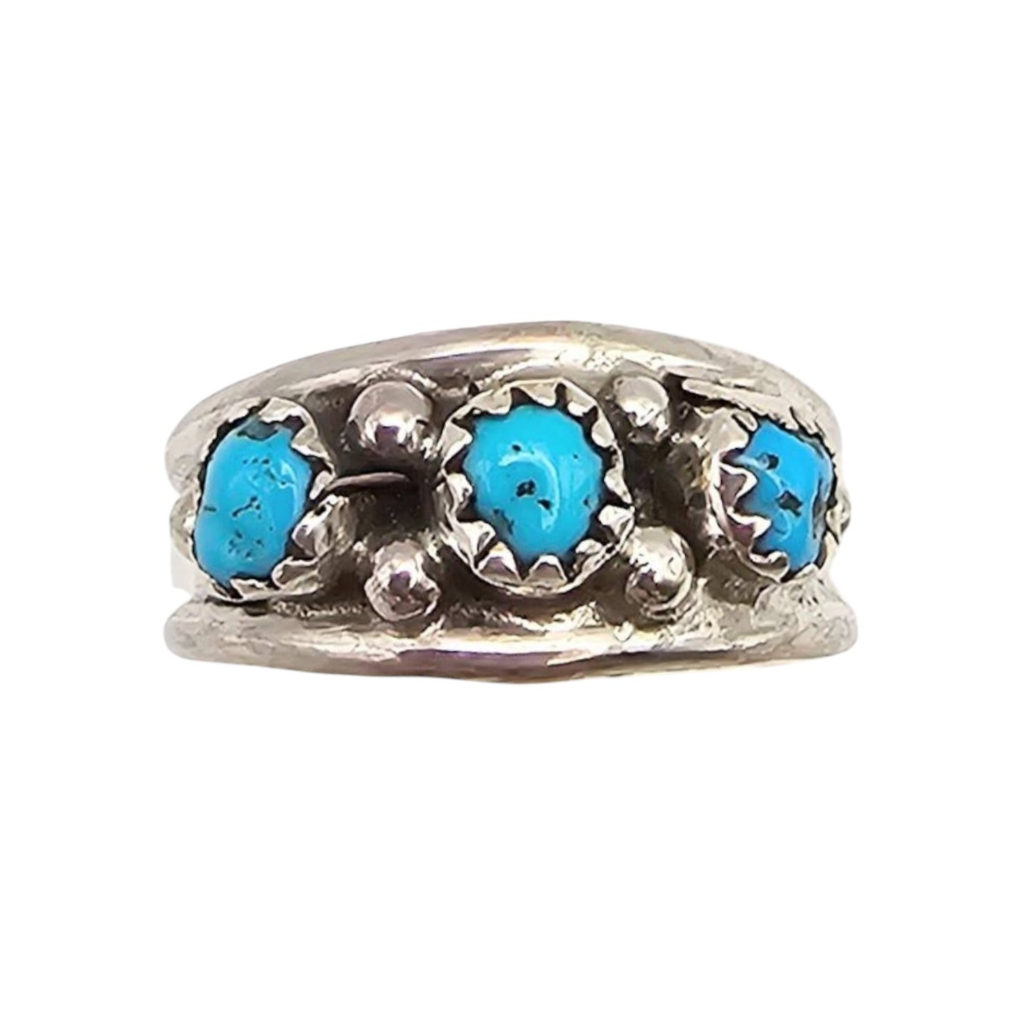 Handcrafted by Elvira Cadman, Navajo artisan, this sterling silver ring features three Kingman turquoise cabochons set in a detailed band. The ring is size 7 and weighs approximately 2.9 grams. A stunning piece for collectors or everyday wear.