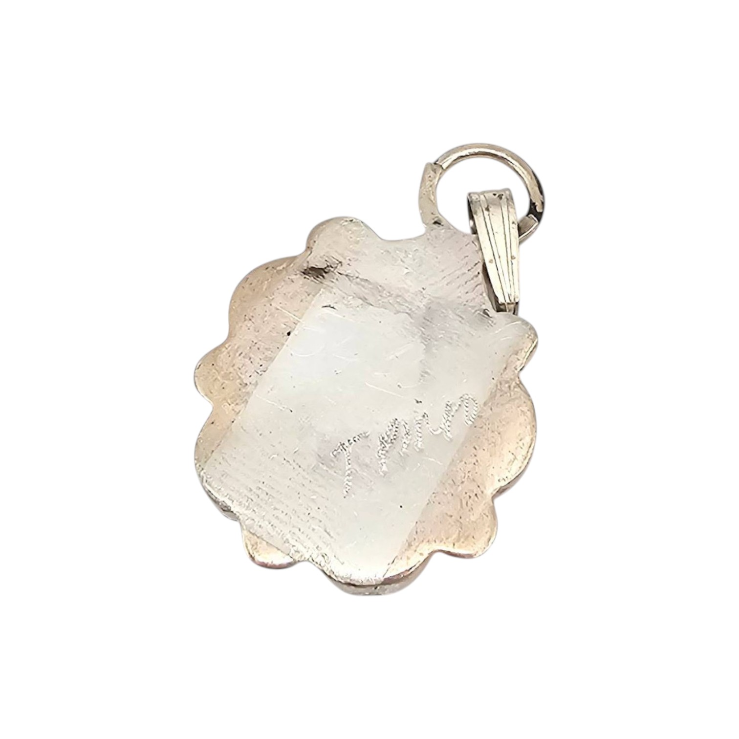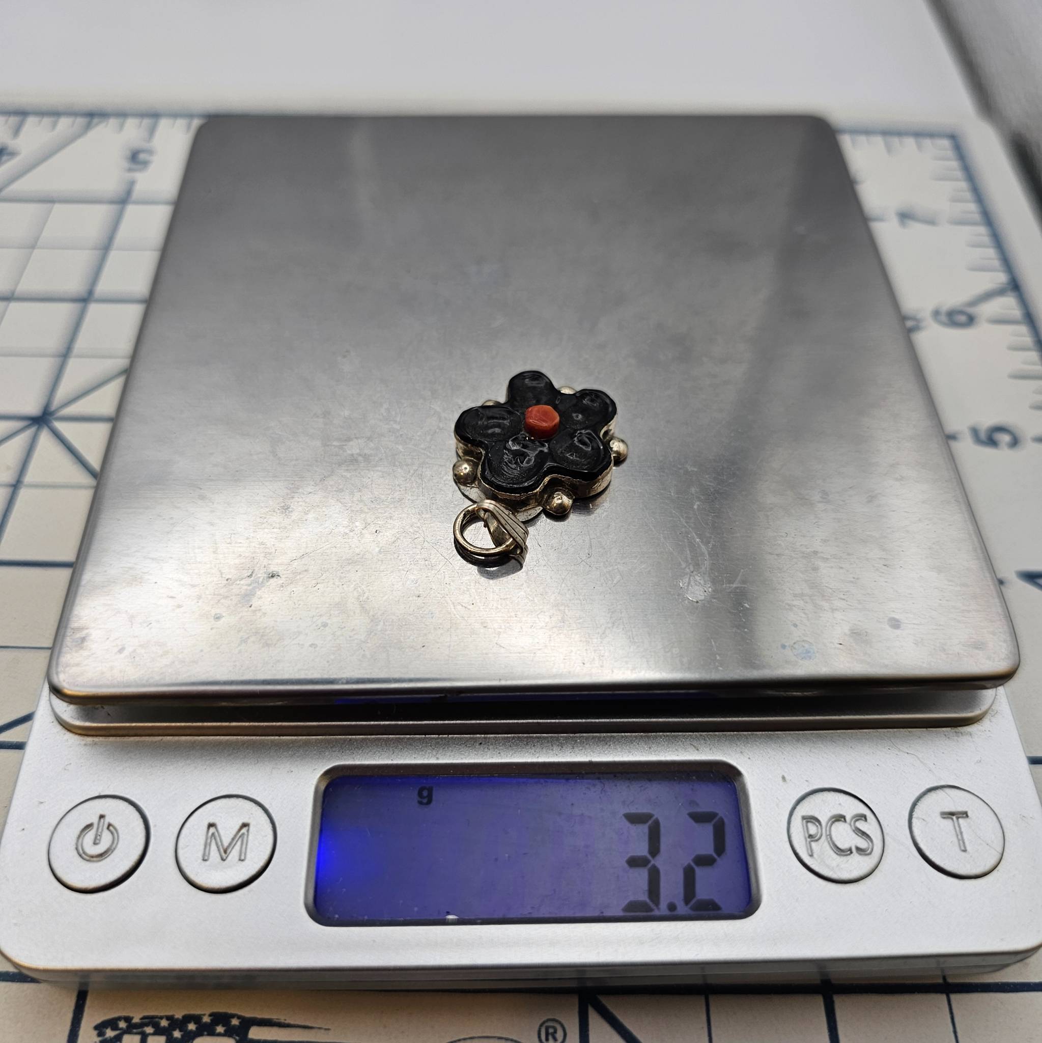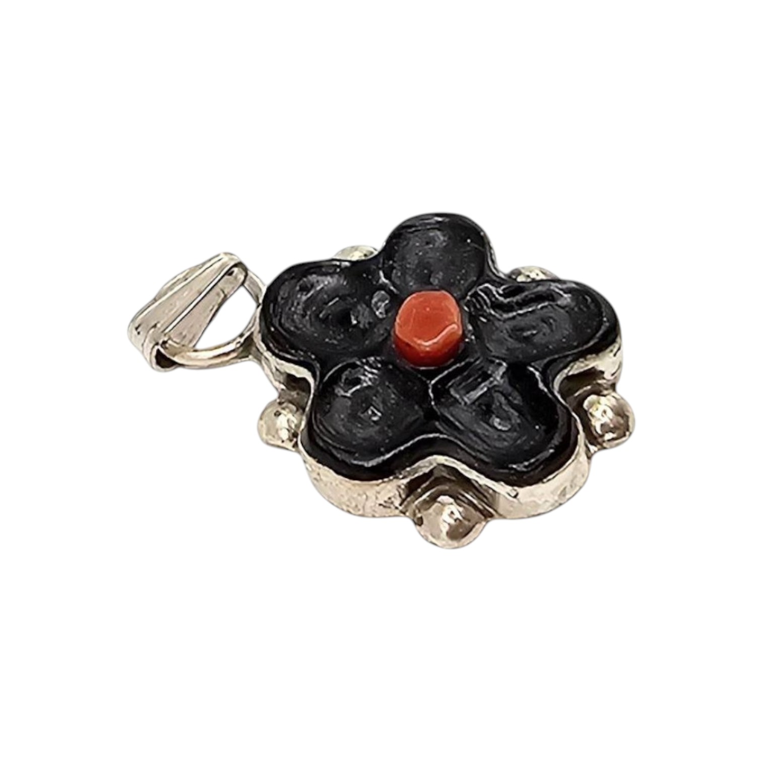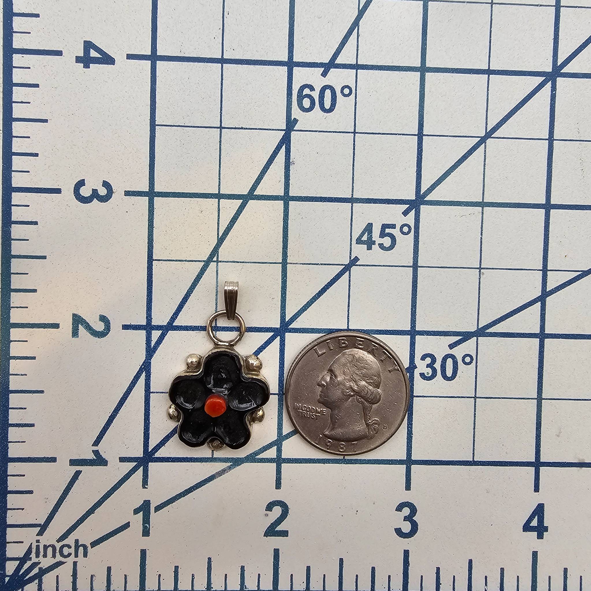 Handcrafted sterling silver pendant by Zuni artisan Tamara Pinto. Features a floral design with black and coral embellishments on its surface. Weighs approximately 3.2 grams and measures slightly larger than a quarter. Includes a bail for attaching to a chain.