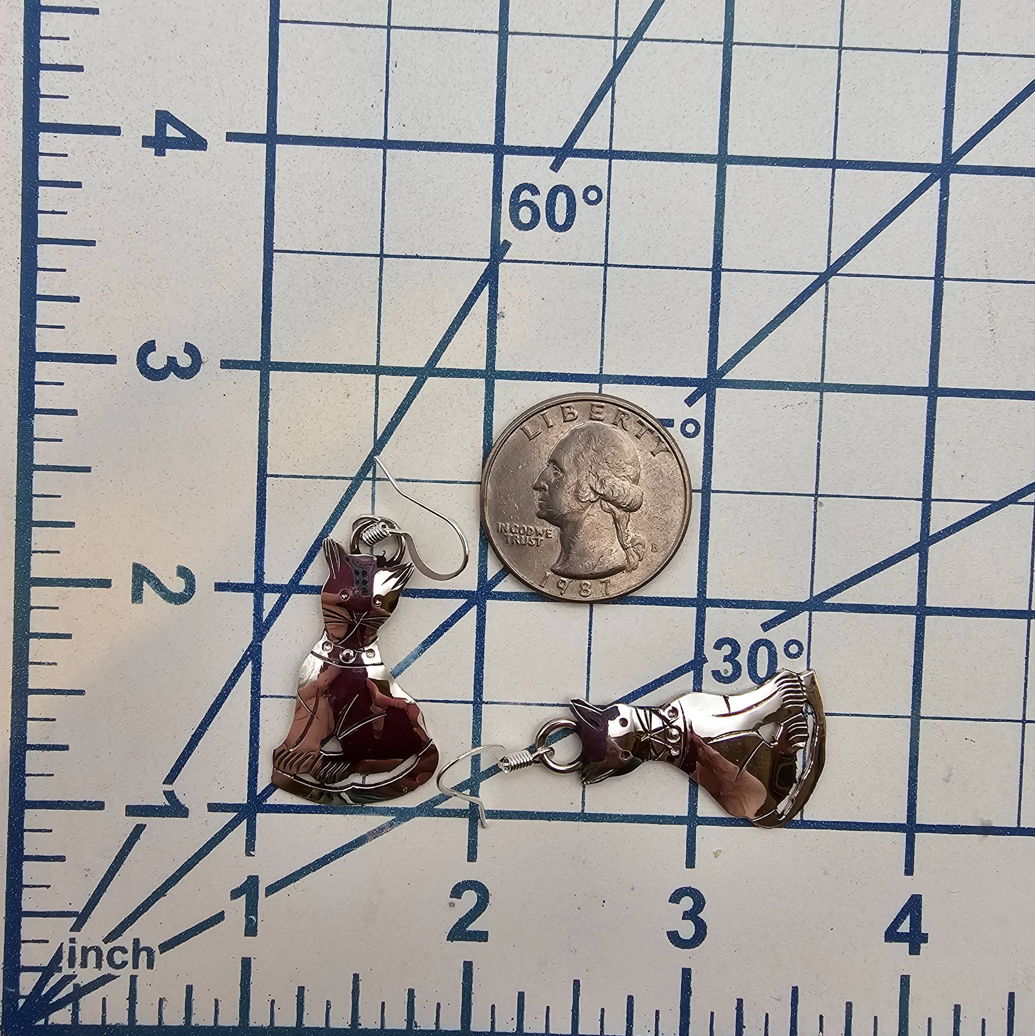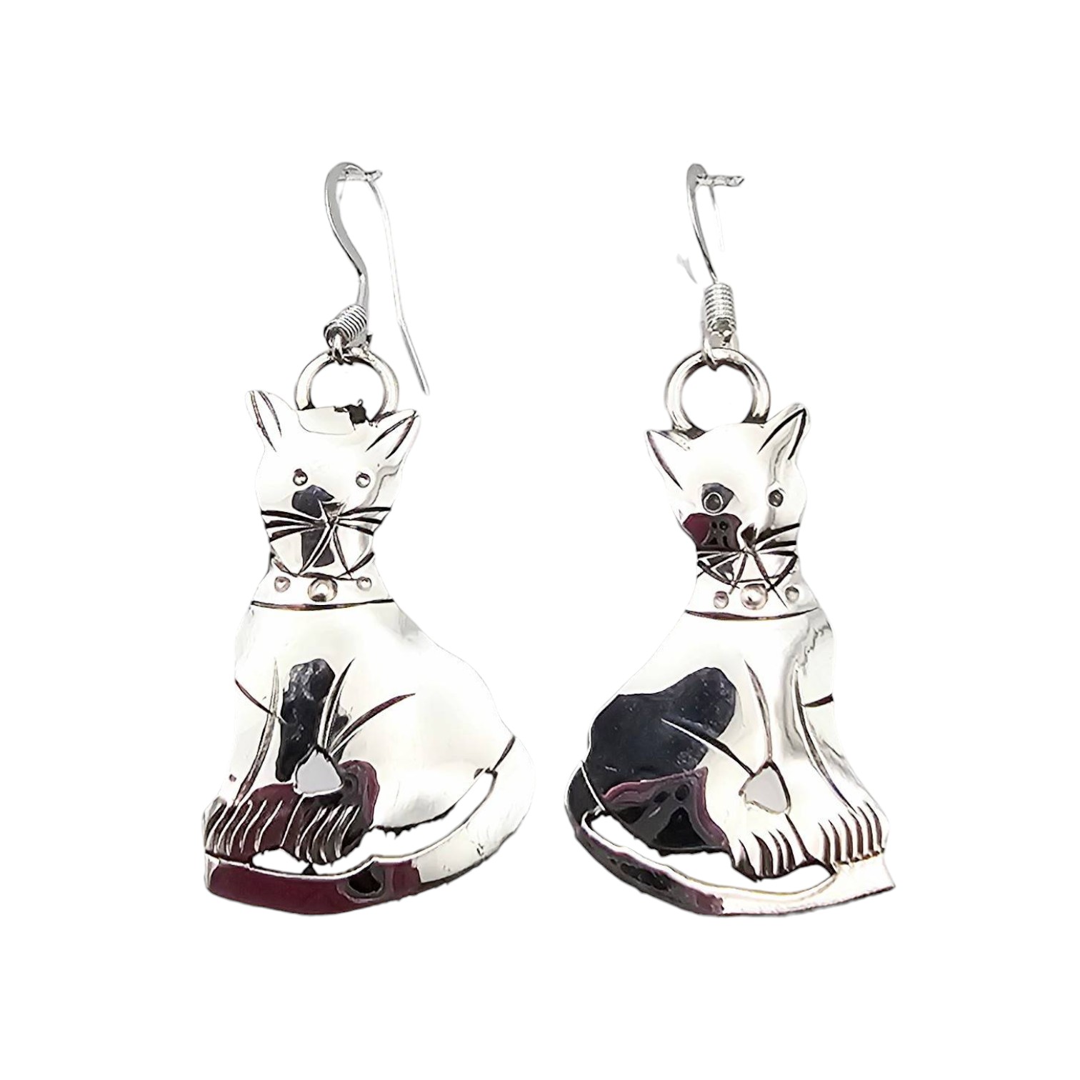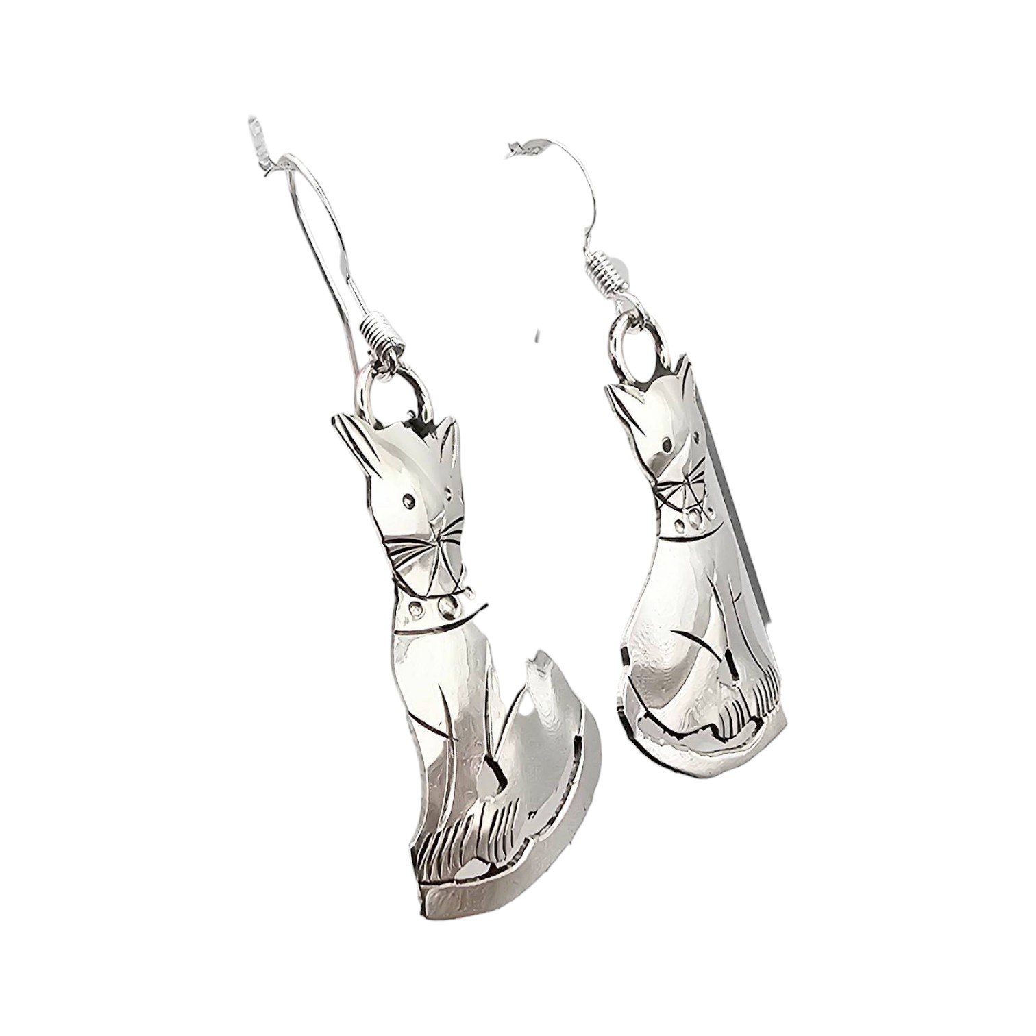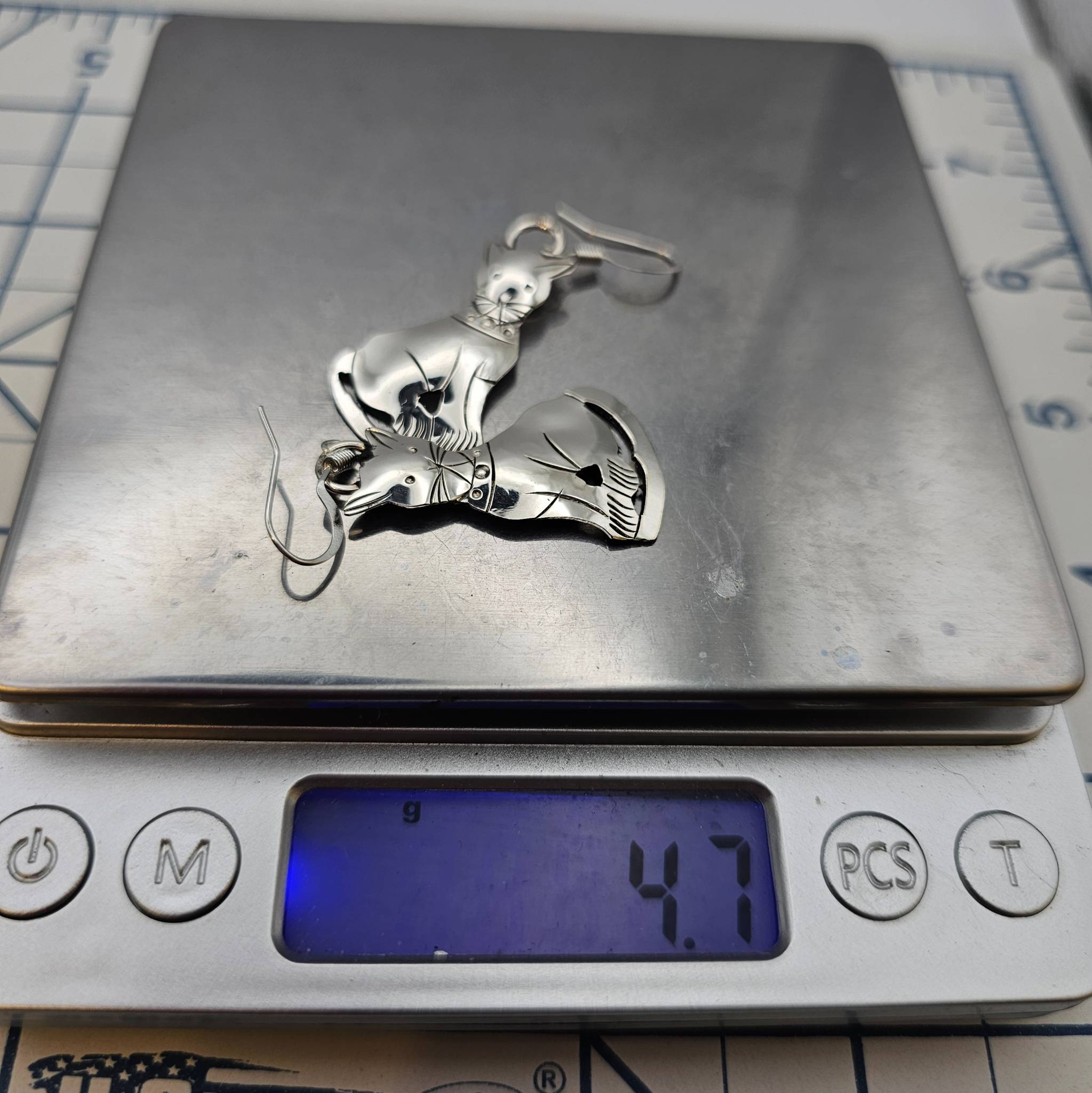 Sterling silver earrings handmade by Navajo artist Louisse Yazzie, featuring cat-shaped designs. Each earring is hallmarked “Sterling” and “LY” on the back. The earrings weigh 4.7 grams as a pair and come with hook-style fastenings. Measurements are shown in reference to a ruler and coin for scale.