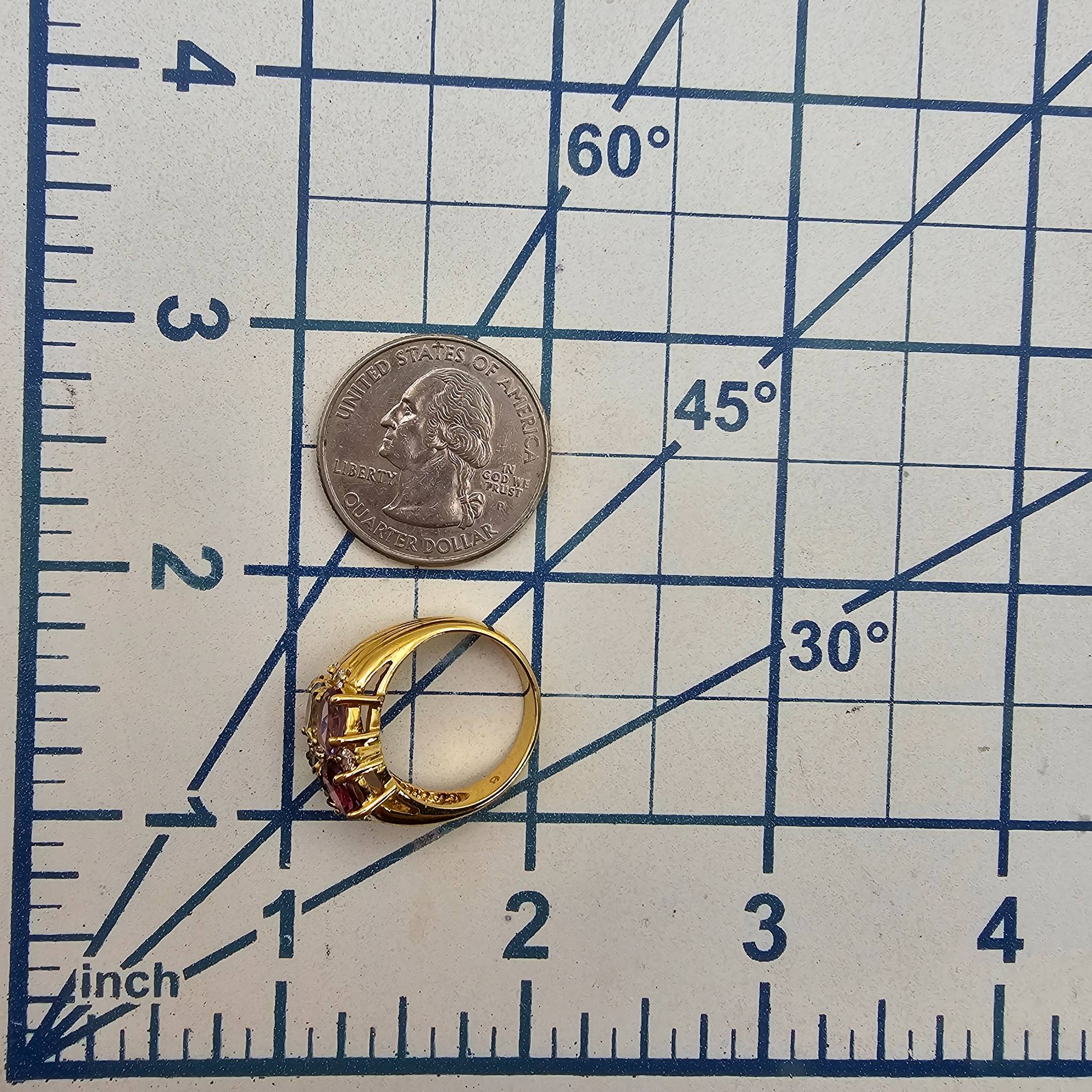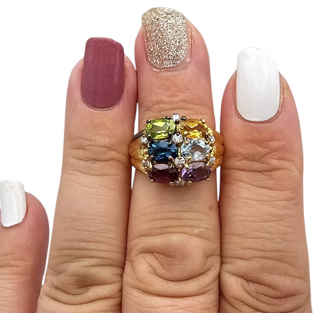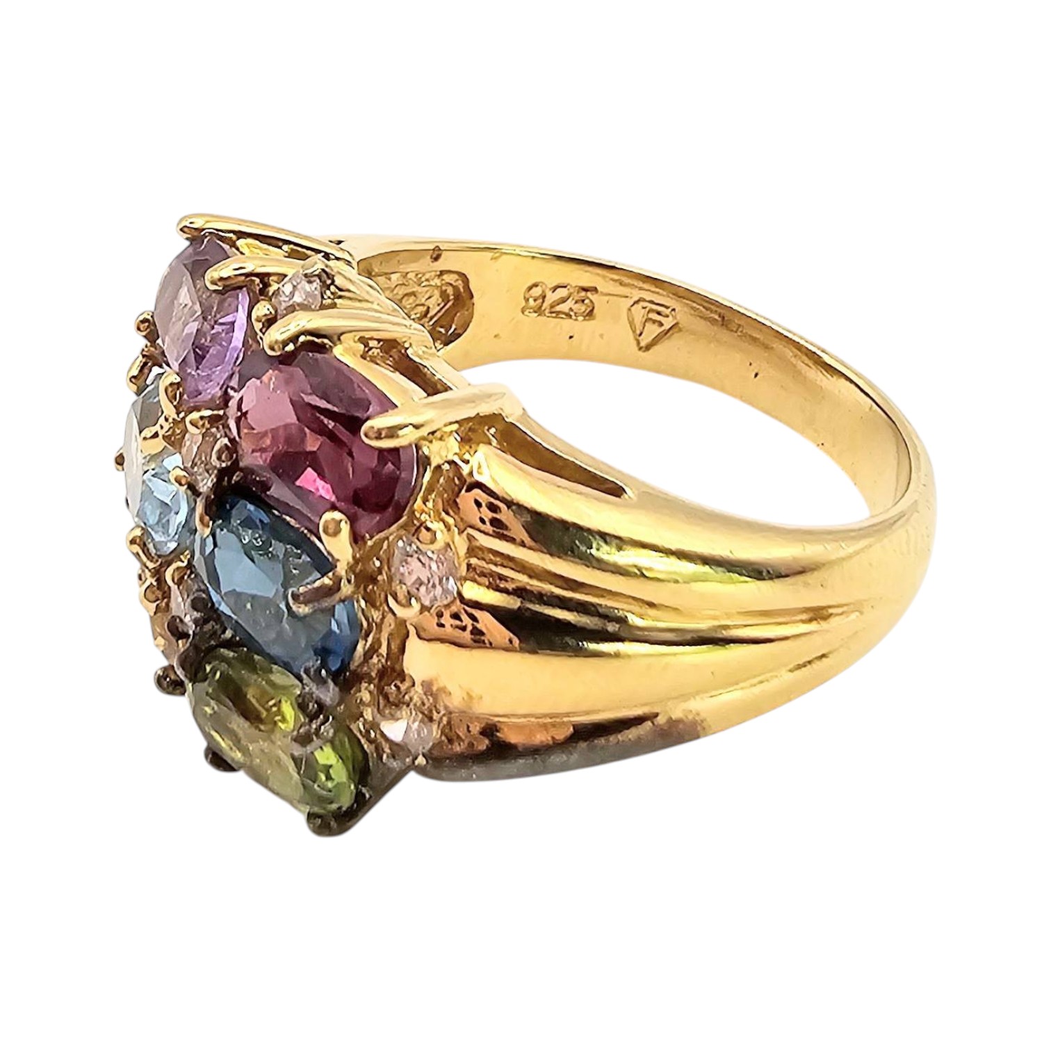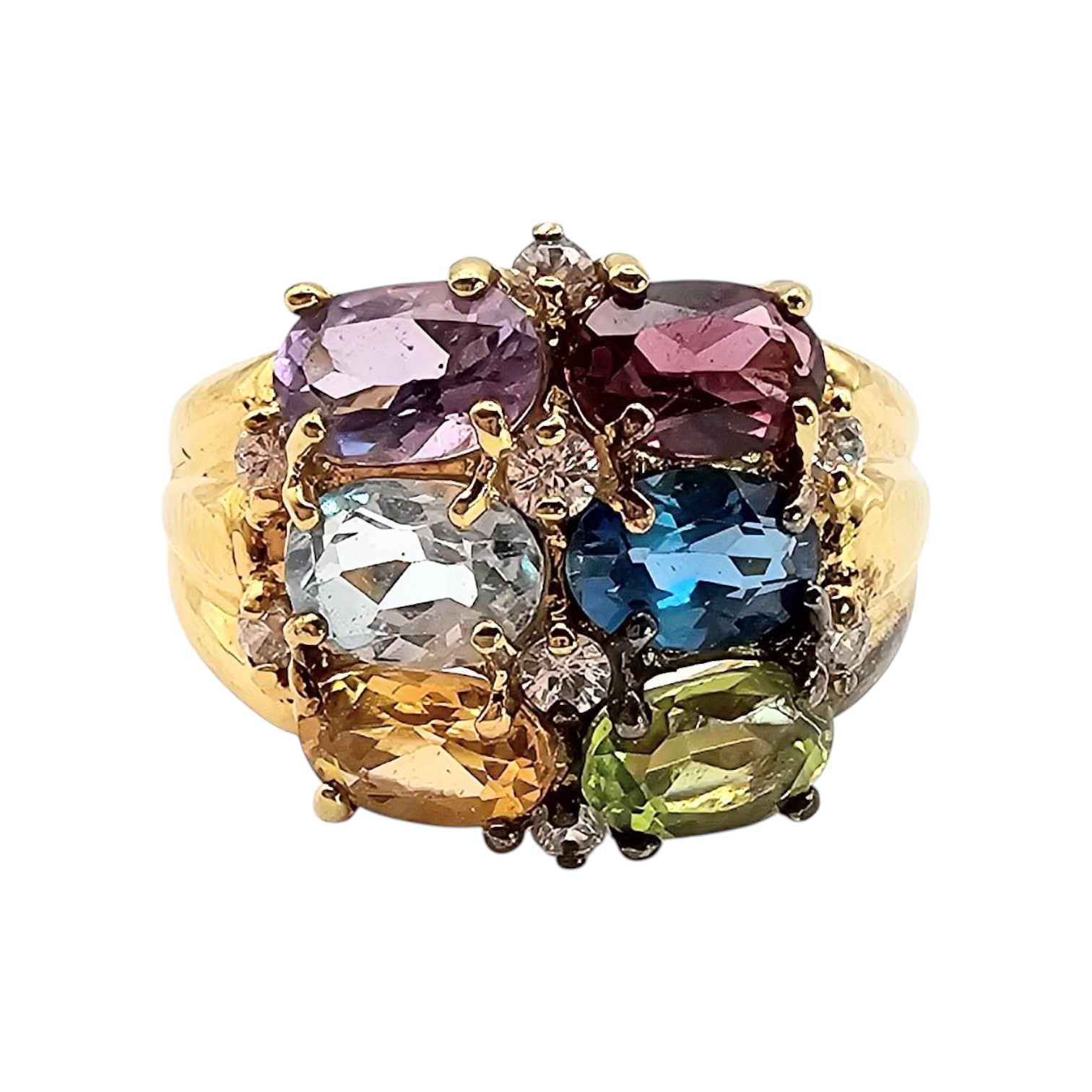 Gold over sterling silver ring featuring multiple gemstones, including amethyst, garnet, blue topaz, citrine, and peridot. The ring has a total weight of 5.1 grams. It is a size 5.75 and is accented with small clear stones. Excellent craftsmanship with vibrant gems.