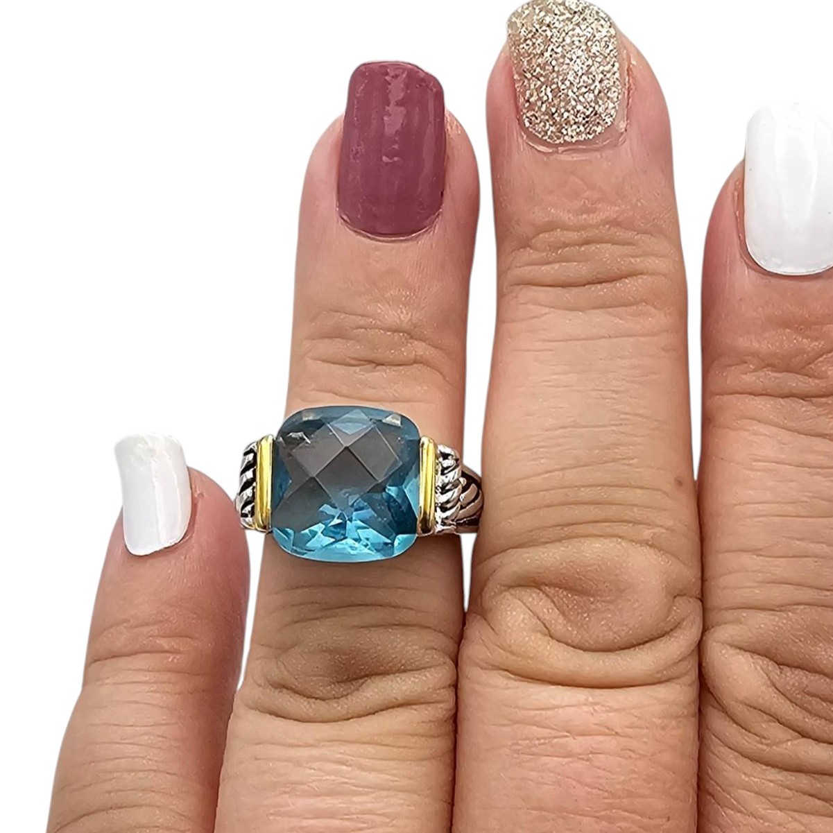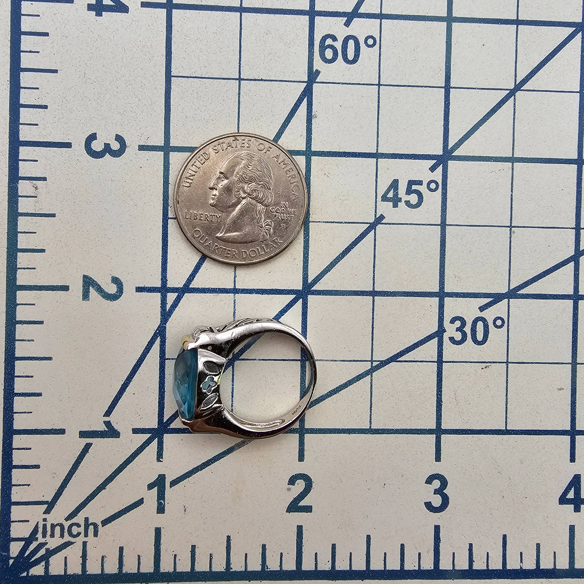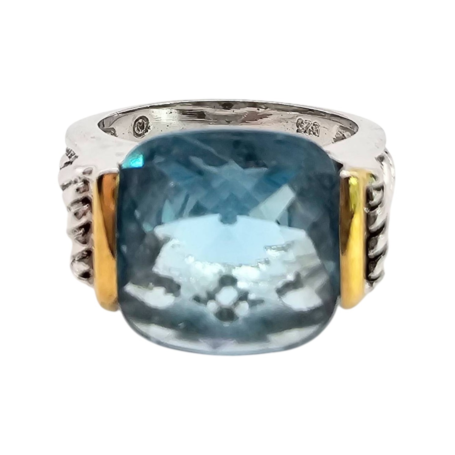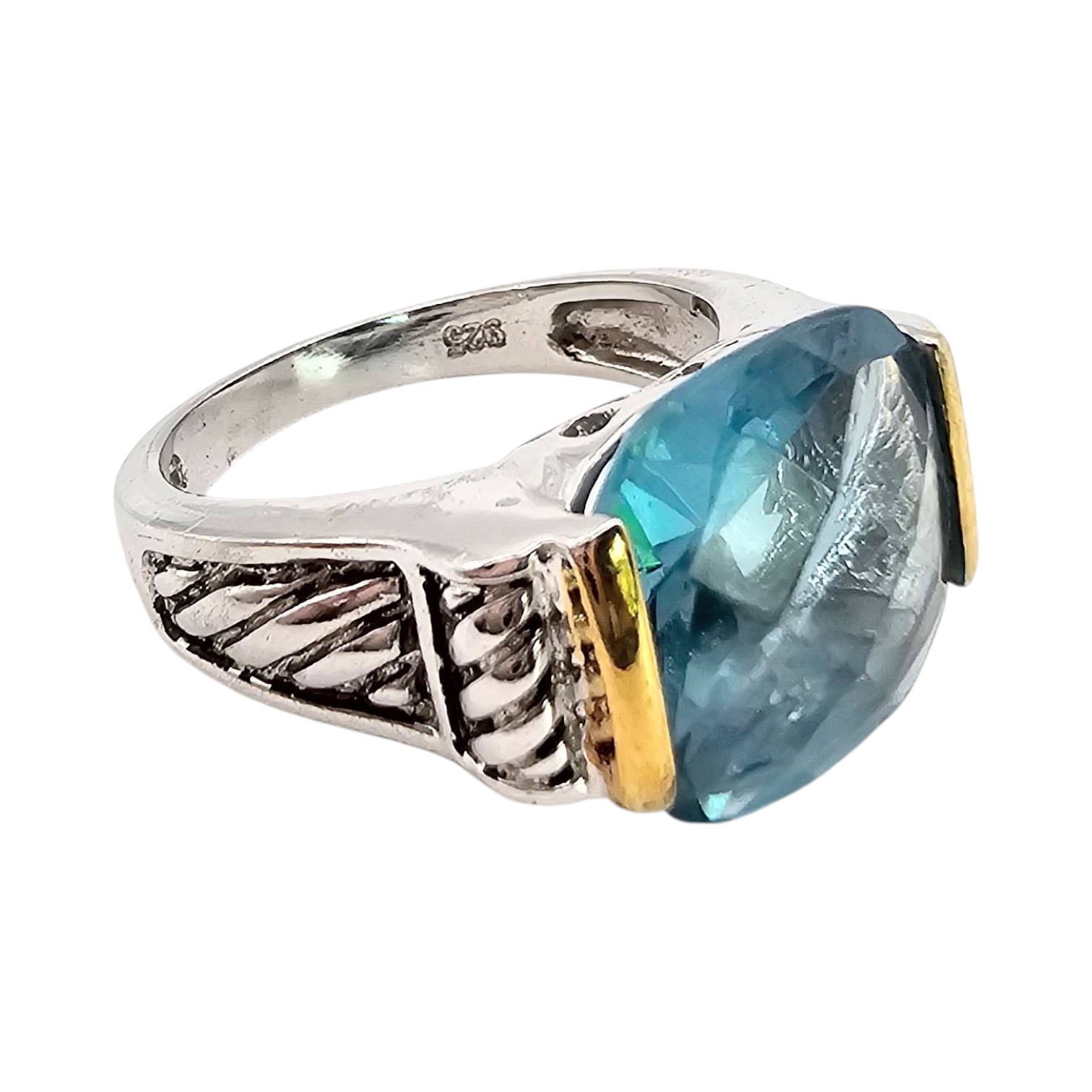 Sterling silver ring with a large blue rhinestone centerpiece. Features gold-tone accents on each side of the rhinestone, along with intricate design details on the band. The ring is size 6 and weighs 6.2g. Suitable for various wear or collection purposes.