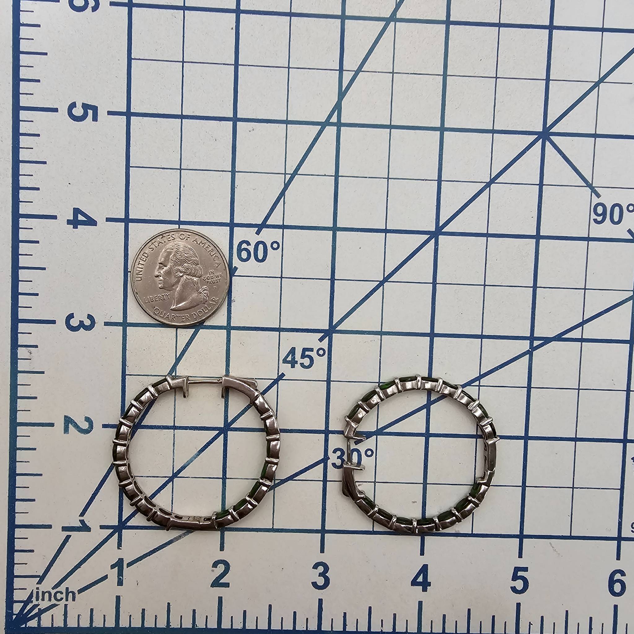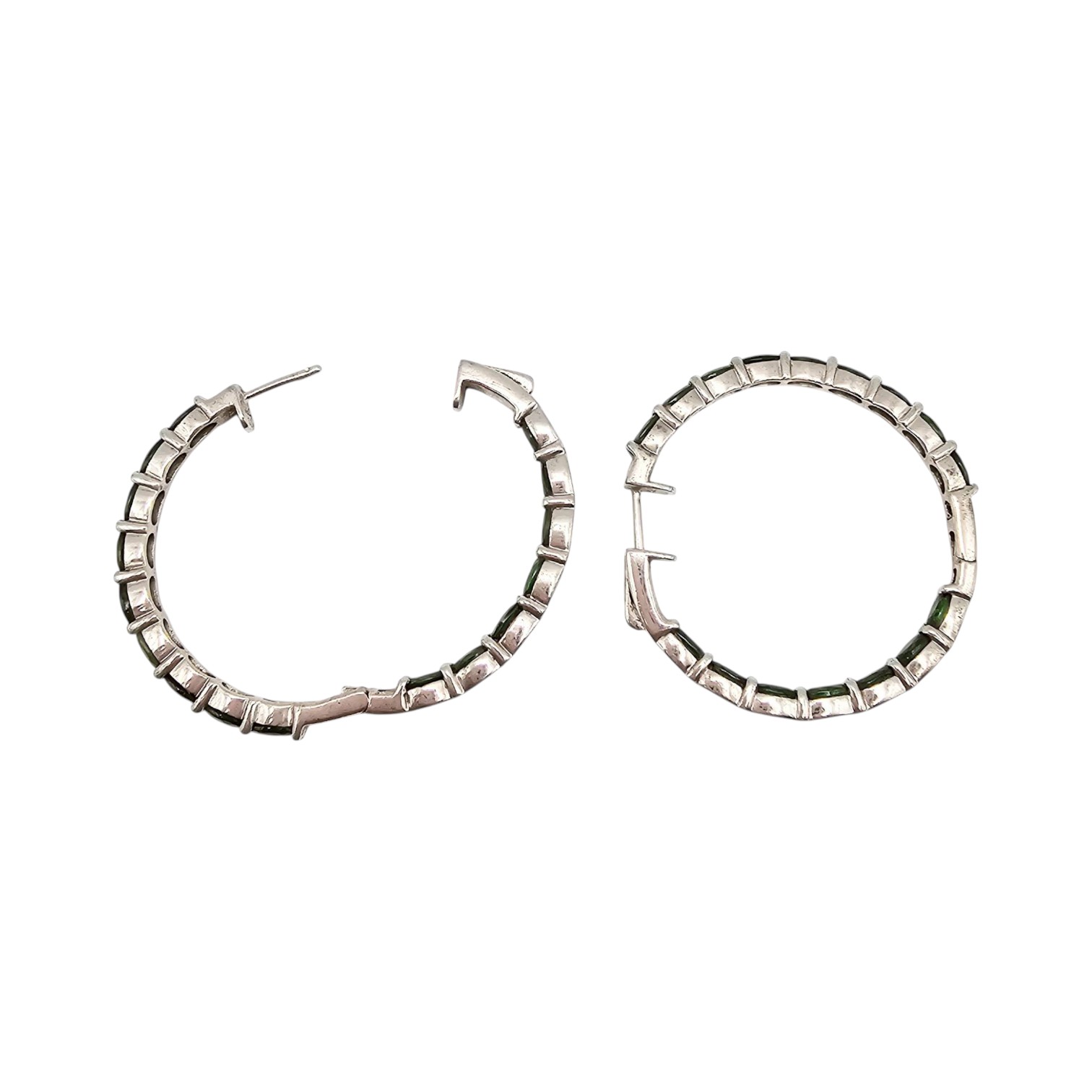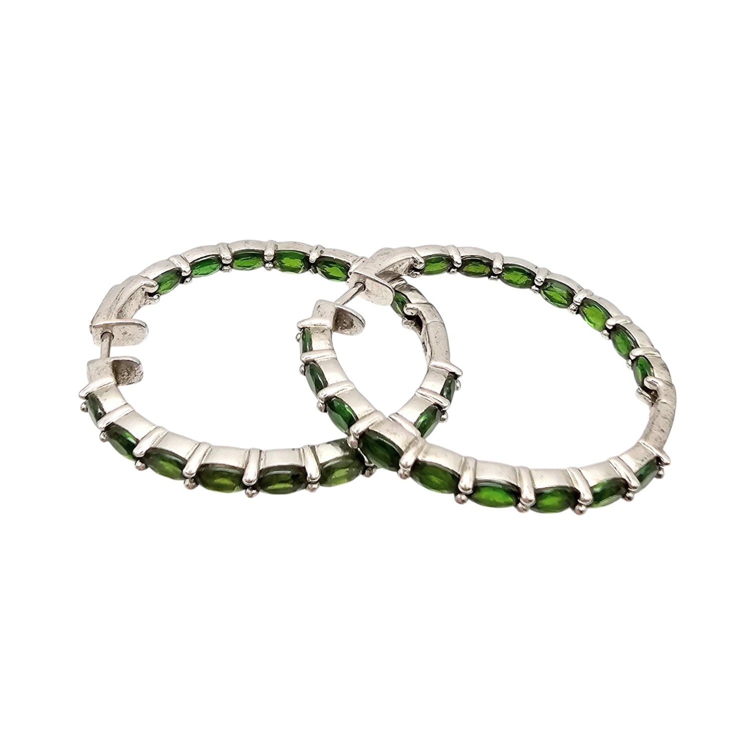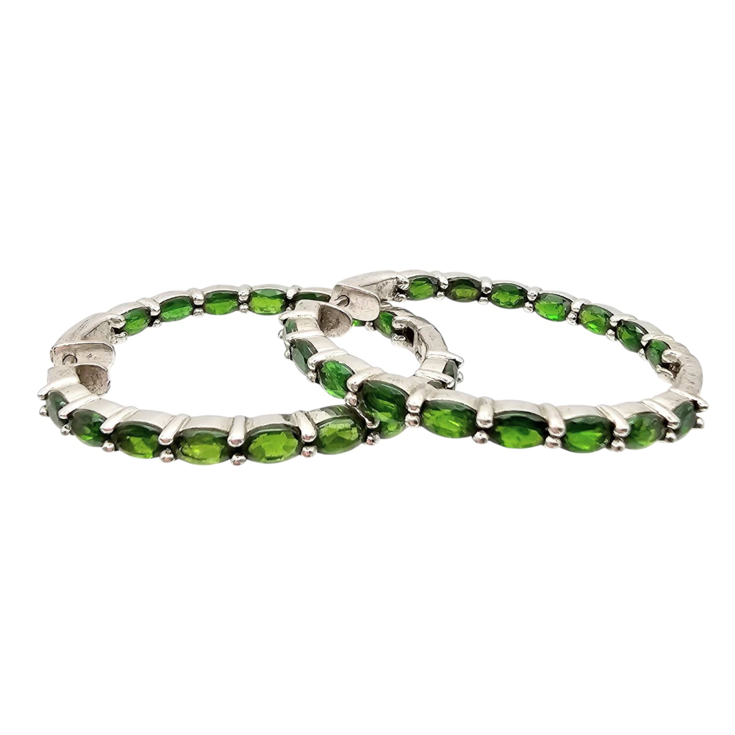 Hoop earrings crafted from sterling silver, set with chrome tourmaline stones. The earrings collectively weigh 12.5 grams. The green stones are oval-cut and securely mounted along the hoops, and the earrings feature latch-back closures for secure wear. Measures approximately 1.5 inches in diameter.