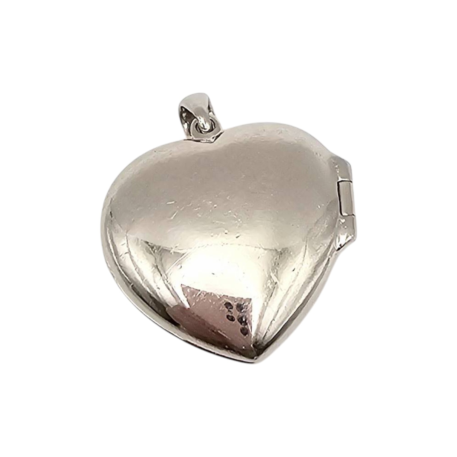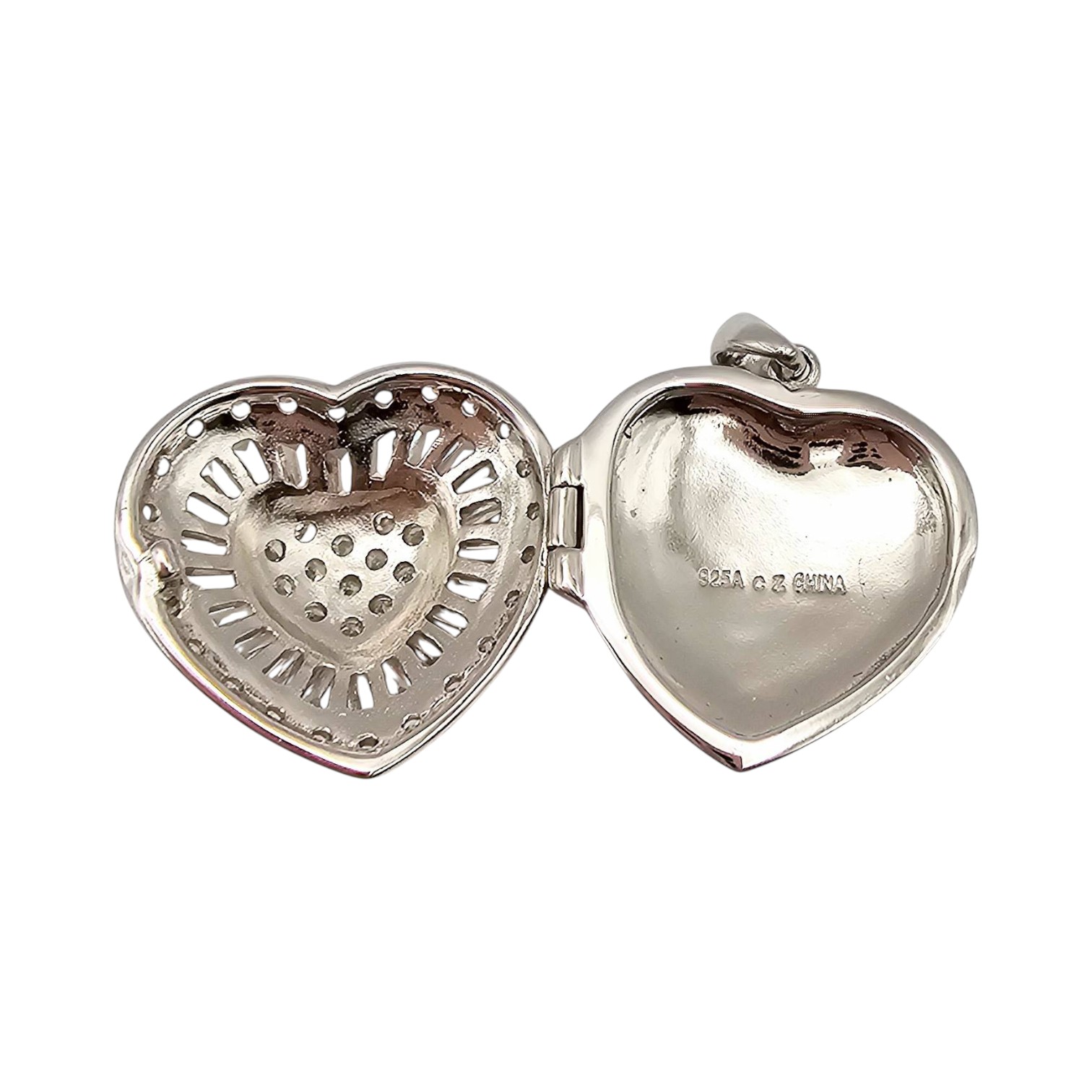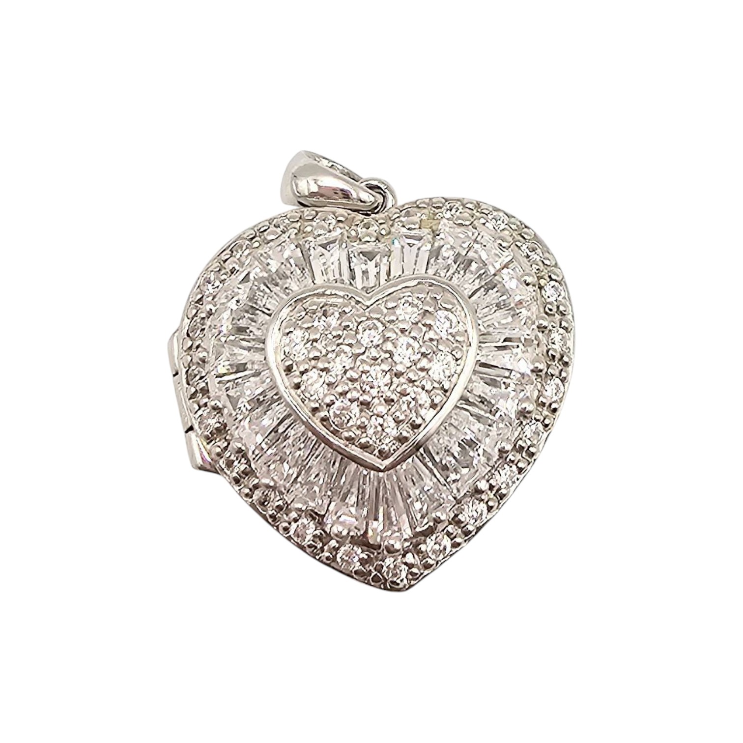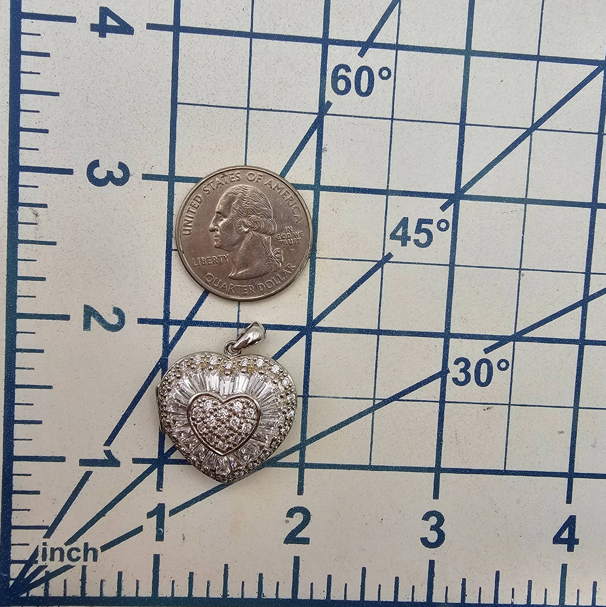 Sterling silver heart-shaped locket pendant with a hallmark, adorned with cubic zirconia stones. Weighs 11.3 grams and features a locket design with an interior compartment for small keepsakes. The pendant measures approximately 1 inch in height, including the bail, and the front showcases a detailed pattern. Back of the locket is polished.