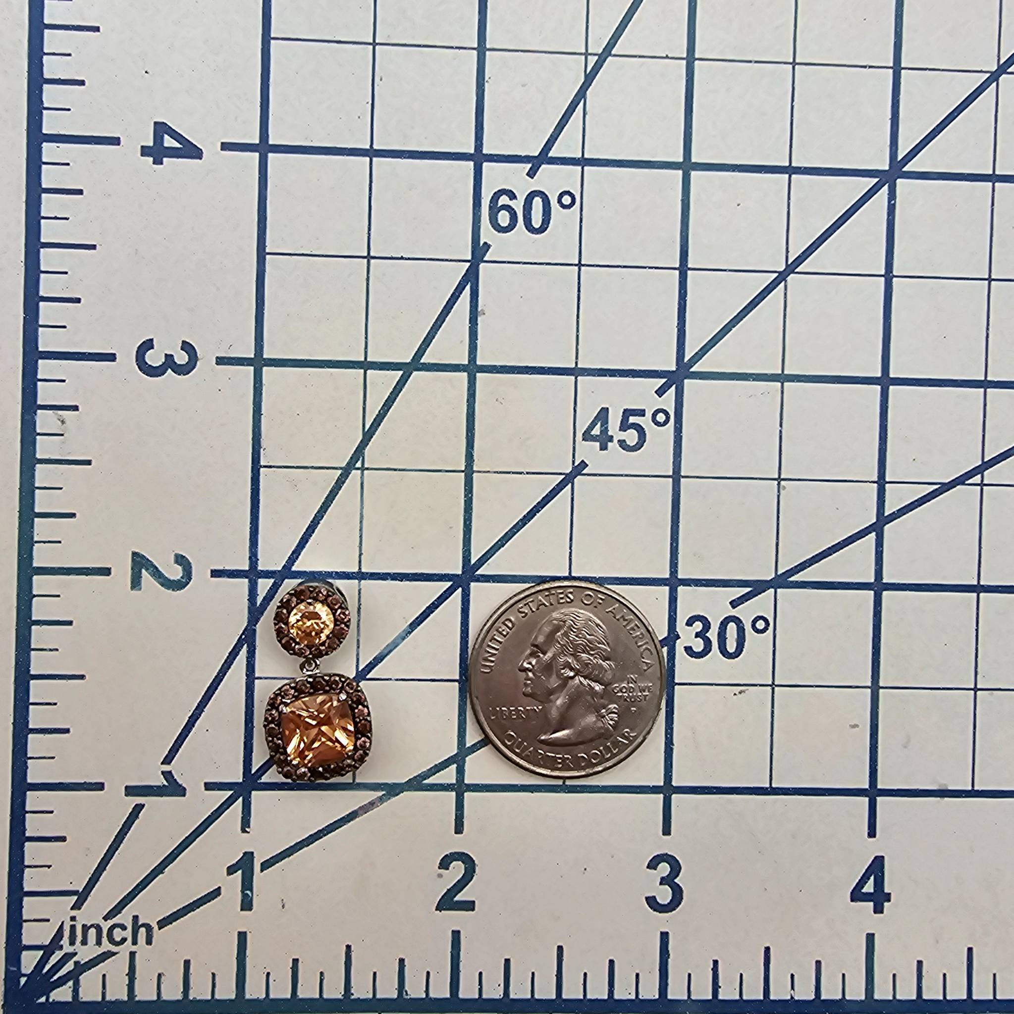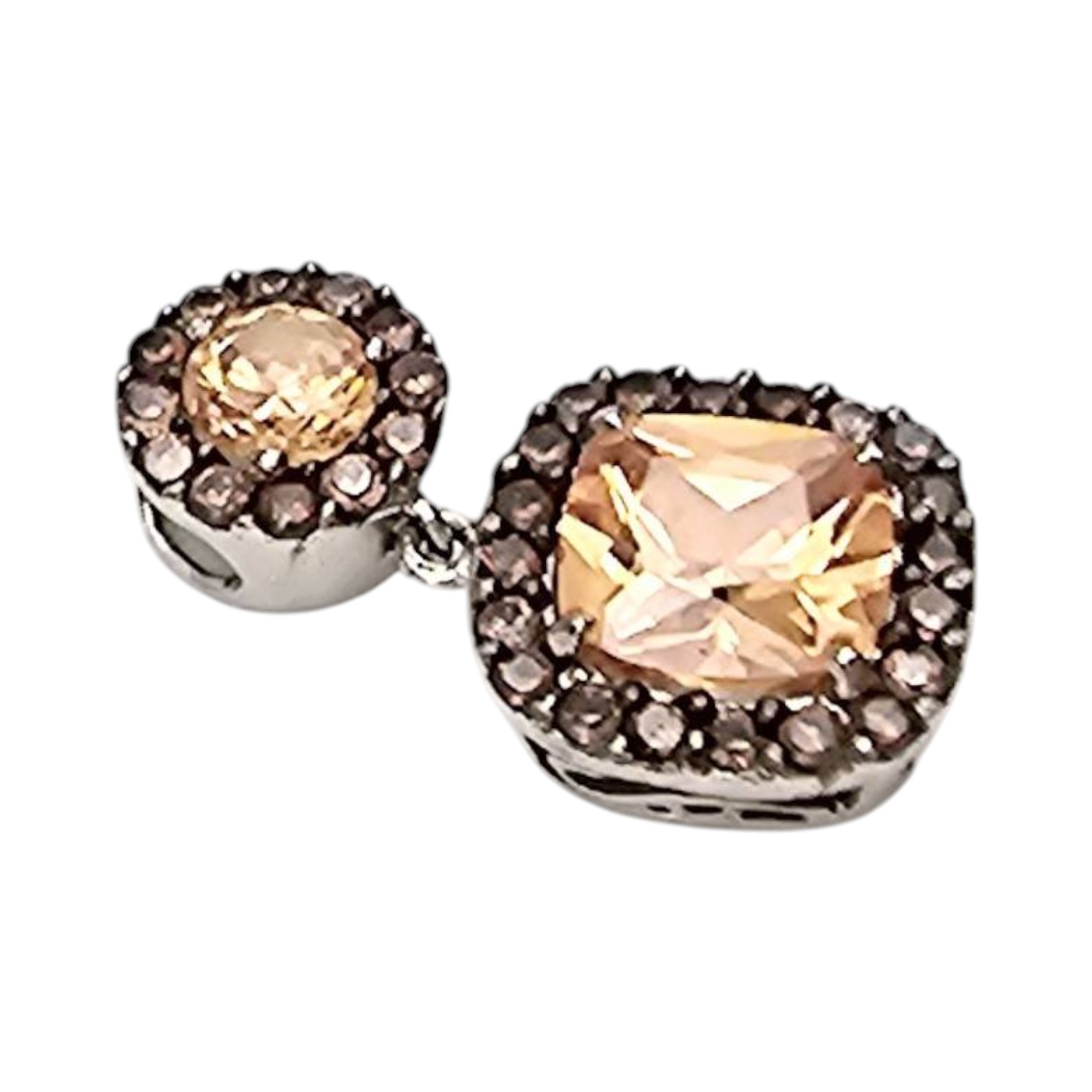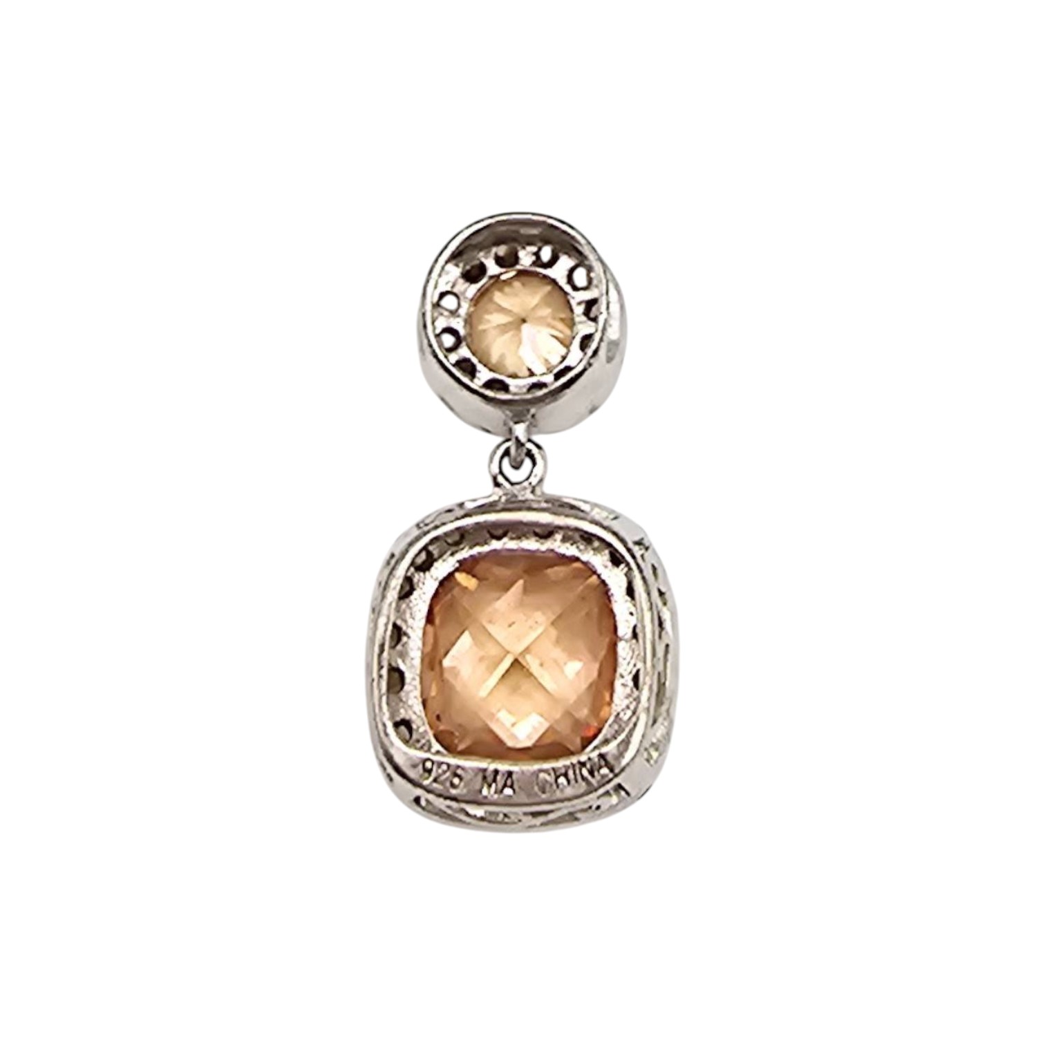 MA sterling silver pendant featuring rhinestones in two sections, with a circular top and a square bottom adorned with peach-colored rhinestones surrounded by smaller accent stones. Weighs approximately 3.3 grams. Marked ‘MA’ on the reverse, confirming sterling silver composition. Measures about 1 inch in length.