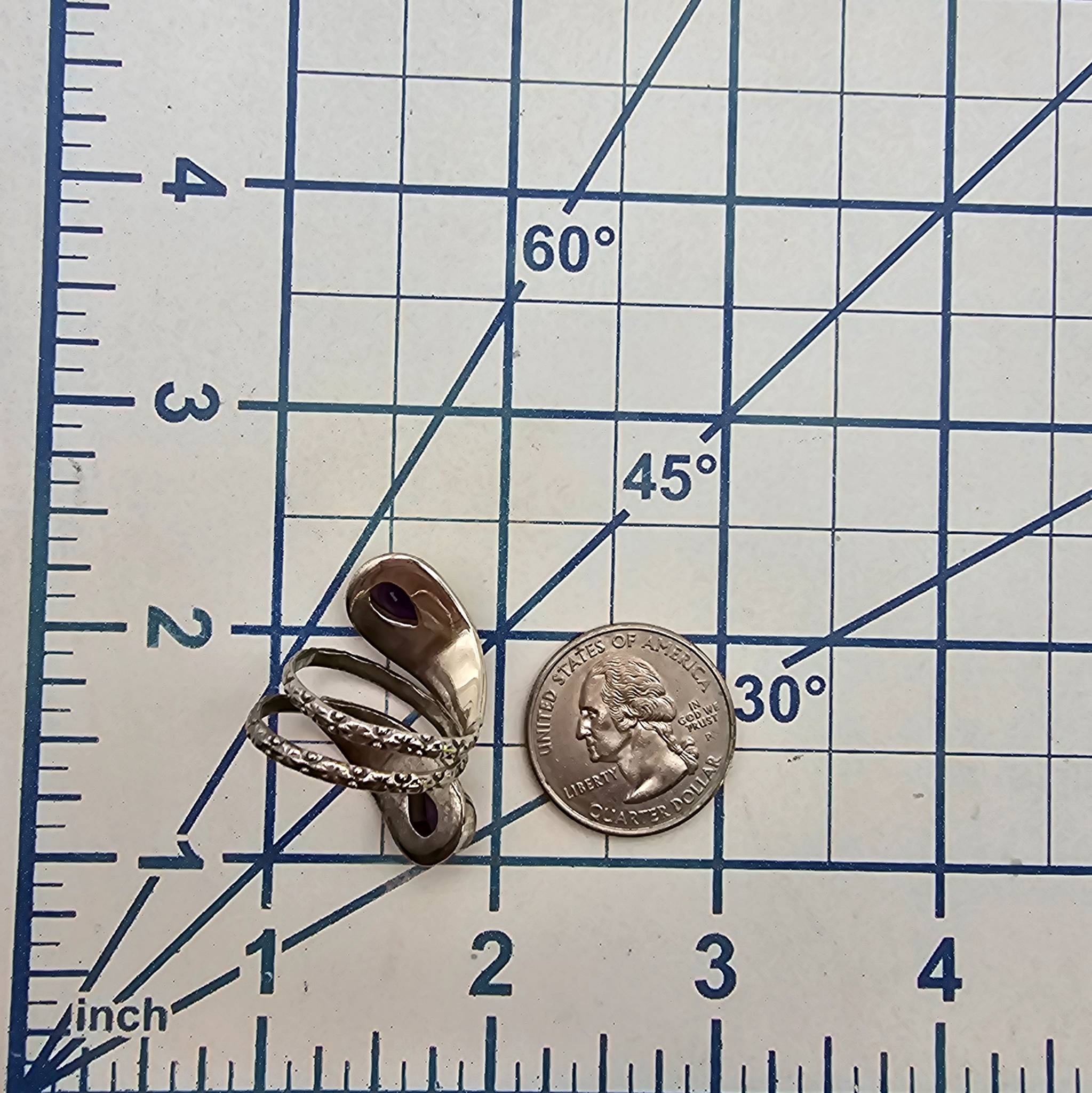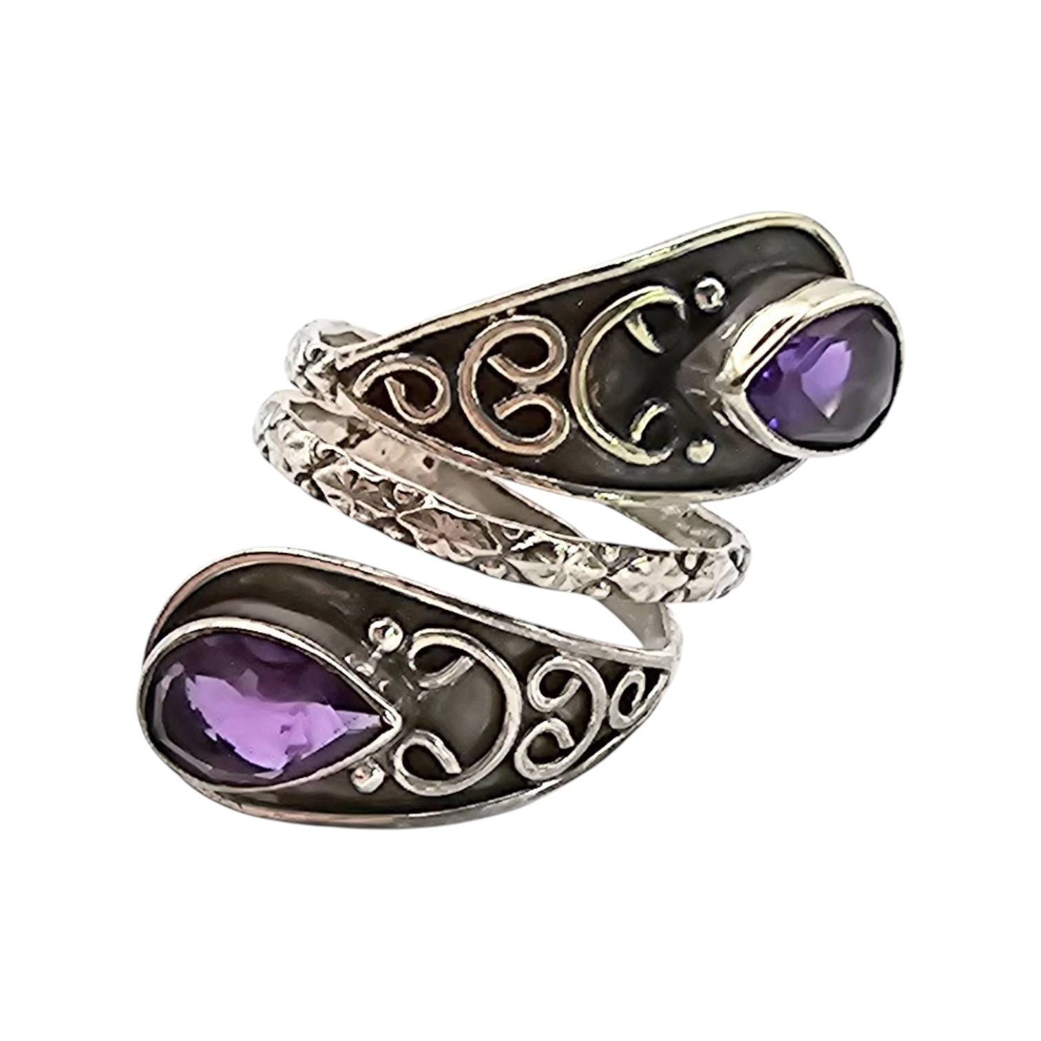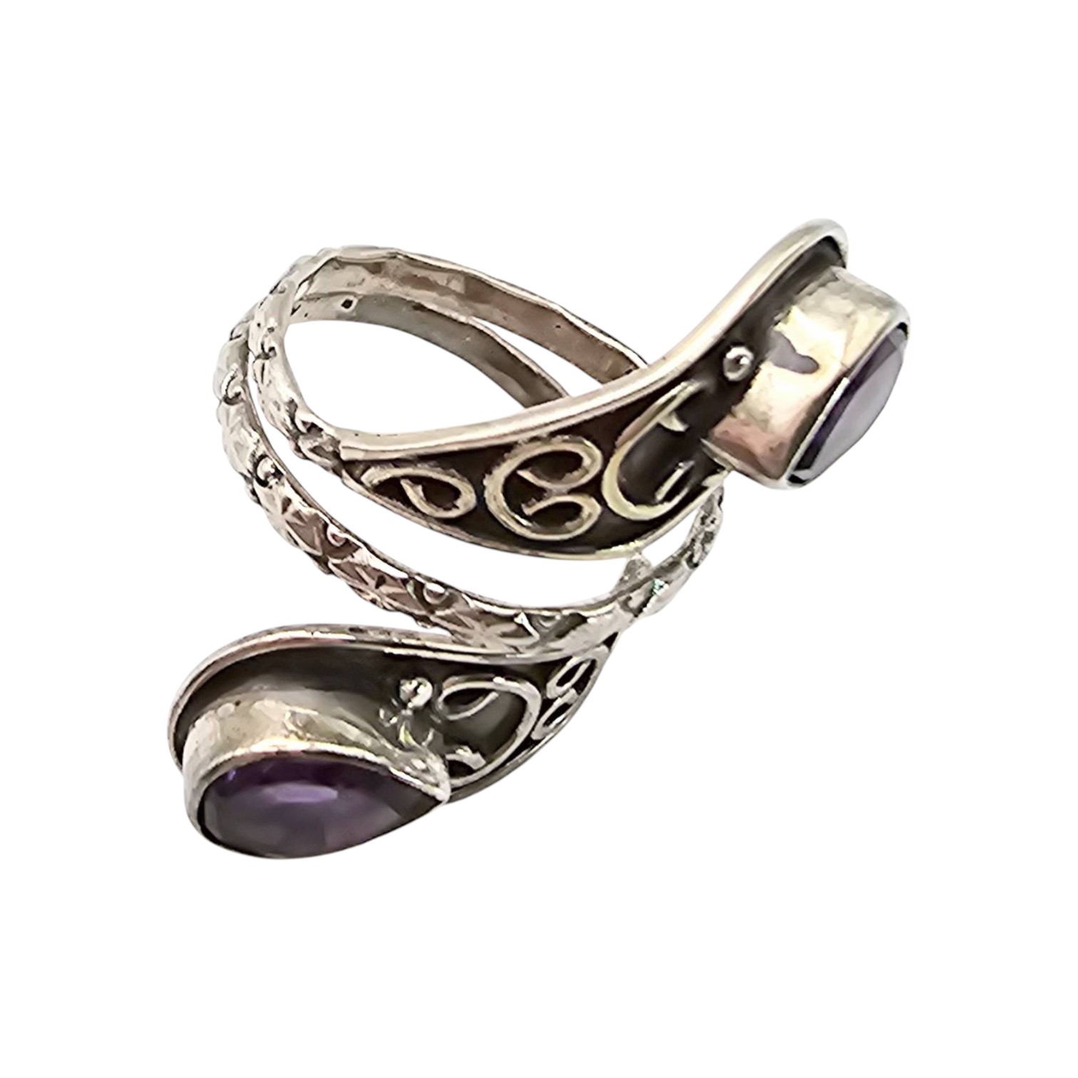Sterling silver wrap ring by PTI featuring decorative scrollwork and two teardrop-shaped faceted amethyst gemstones. Stamped ‘925’ and sized at 6, the ring weighs approximately 6.1 grams. Intricate craftsmanship with a wrap design, combining silverwork with vibrant amethyst stones for elegant appeal.