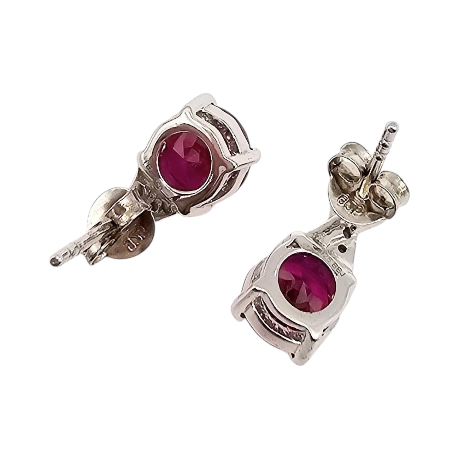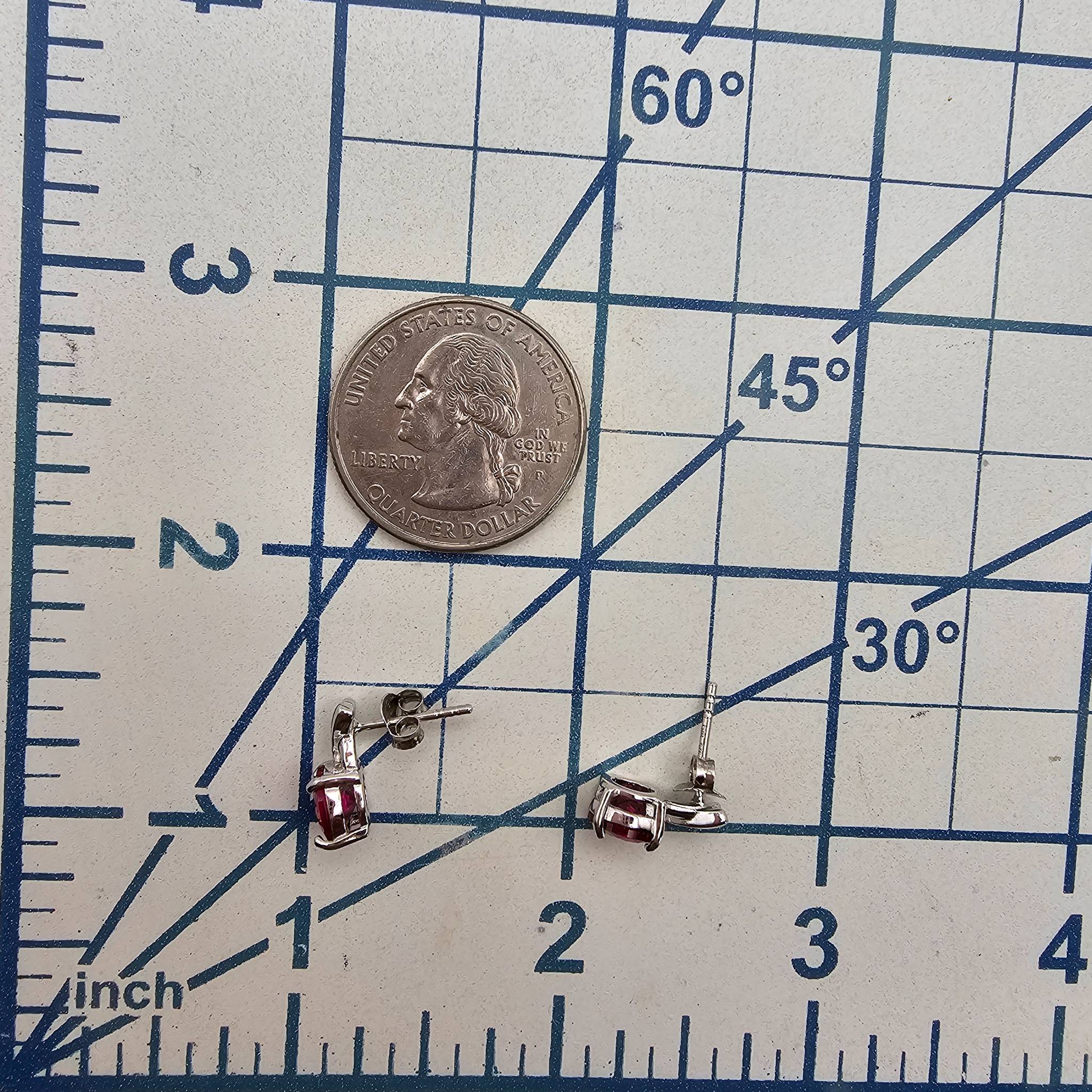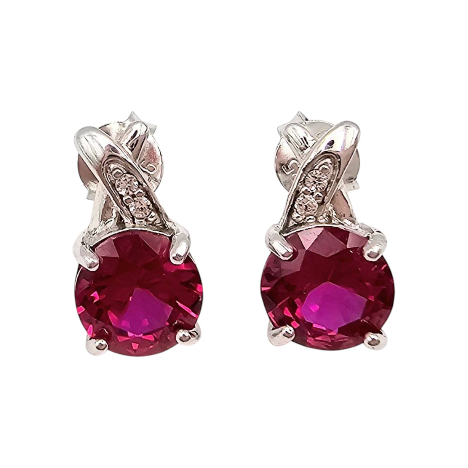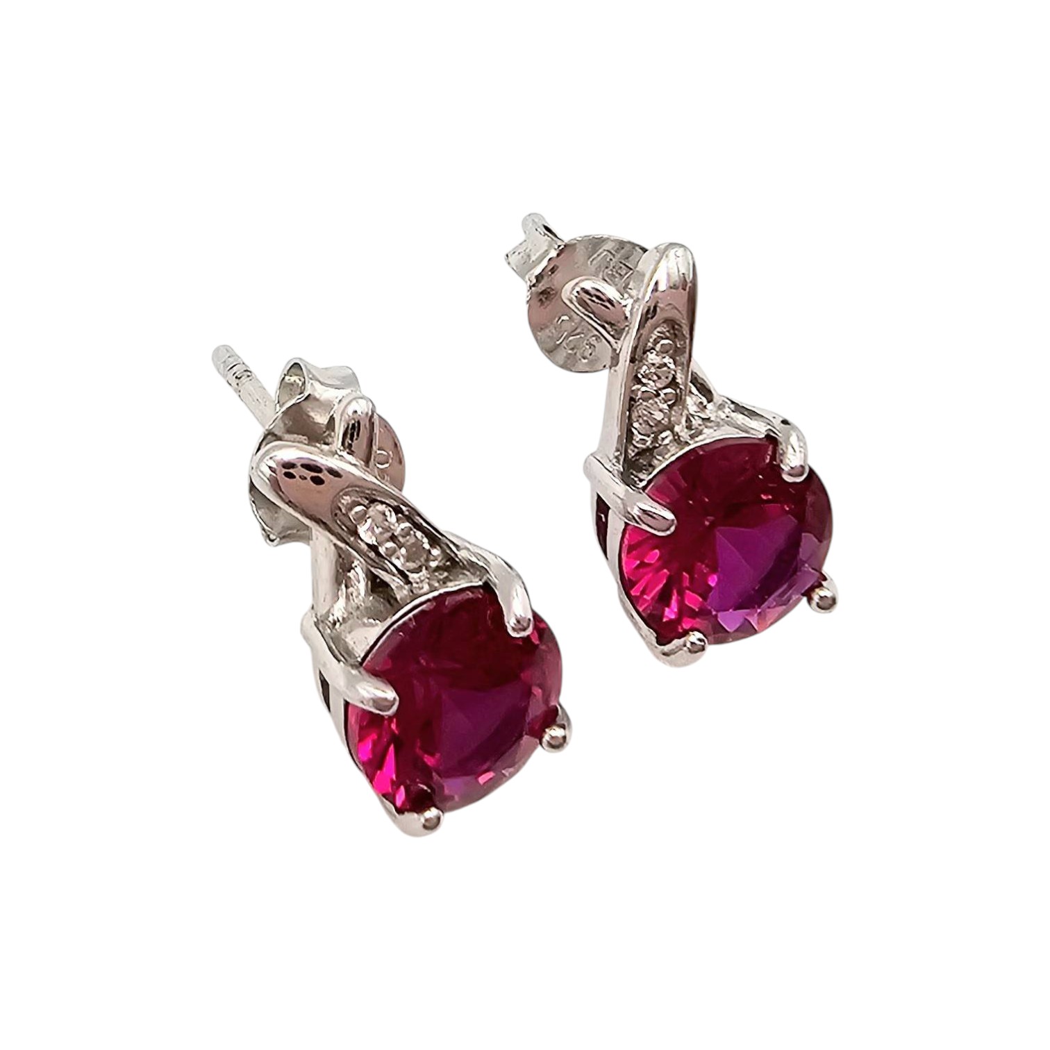 Sterling silver earrings featuring vibrant ruby-colored stones and white topaz accents. Each earring weighs approximately 2.5g and has a classic stud design. The craftsmanship includes secure prong settings and decorative metalwork, combining elegance and durability. Suitable for various occasions.