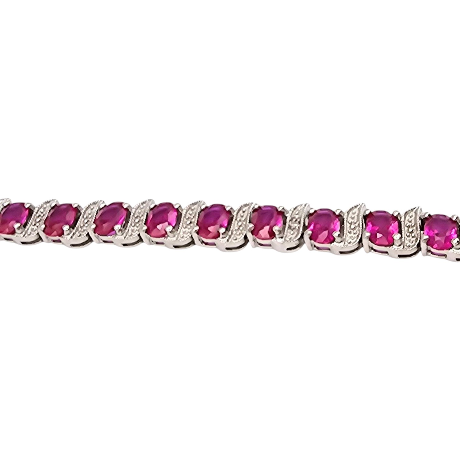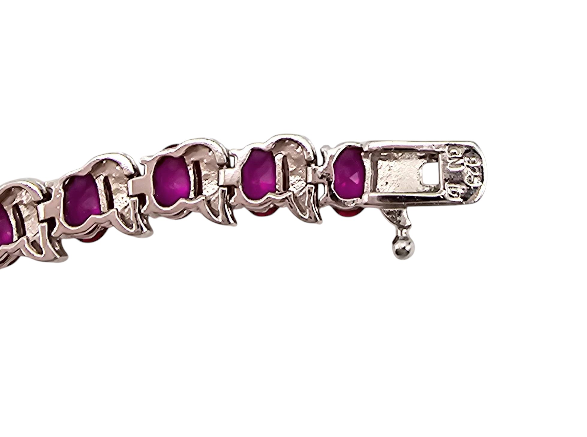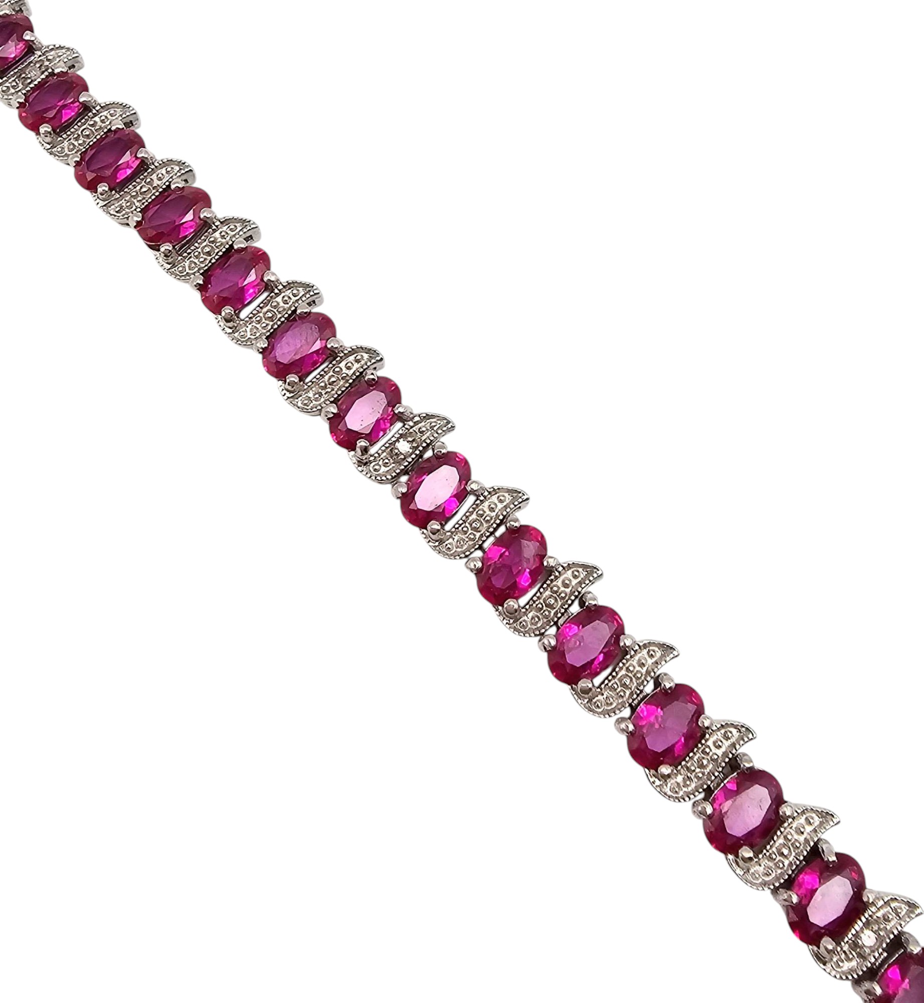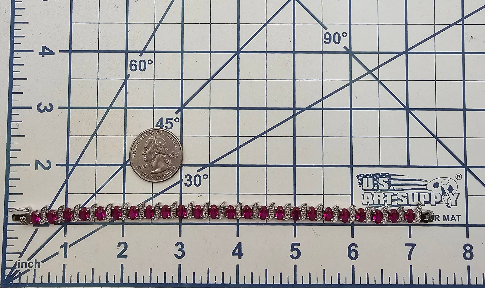 Sterling silver tennis bracelet featuring vibrant ruby gemstones. The bracelet has an approximate weight of 13.2 grams and is secured with a clasp. Designed with alternating ruby stones and silver accents for a sophisticated look. The length is shown to be approximately 7 inches. Ideal for formal or casual occasions.