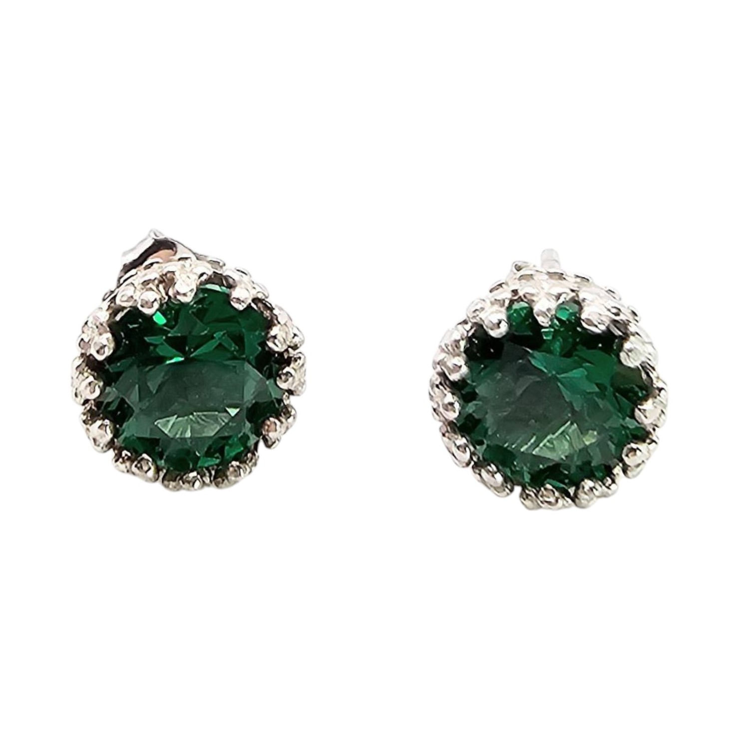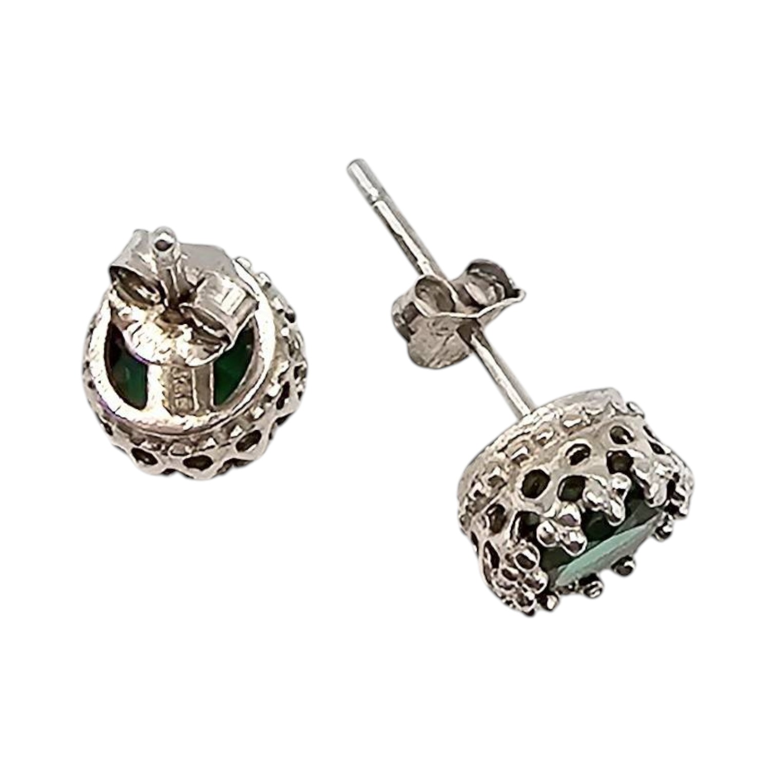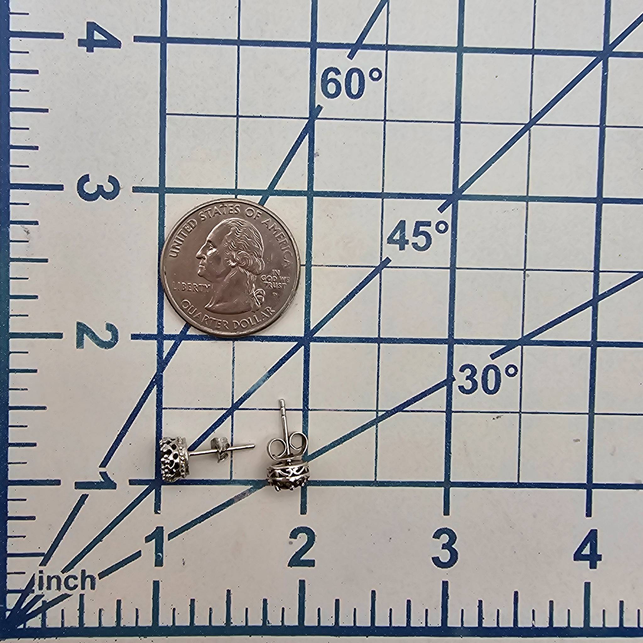 Rhinestone earrings crafted from sterling silver, weighing 1.4 grams. Each earring features rhinestone accents set in an intricate silver design. Includes standard post-back closures for secure wear. Dimensions approximate as seen next to reference scaling.