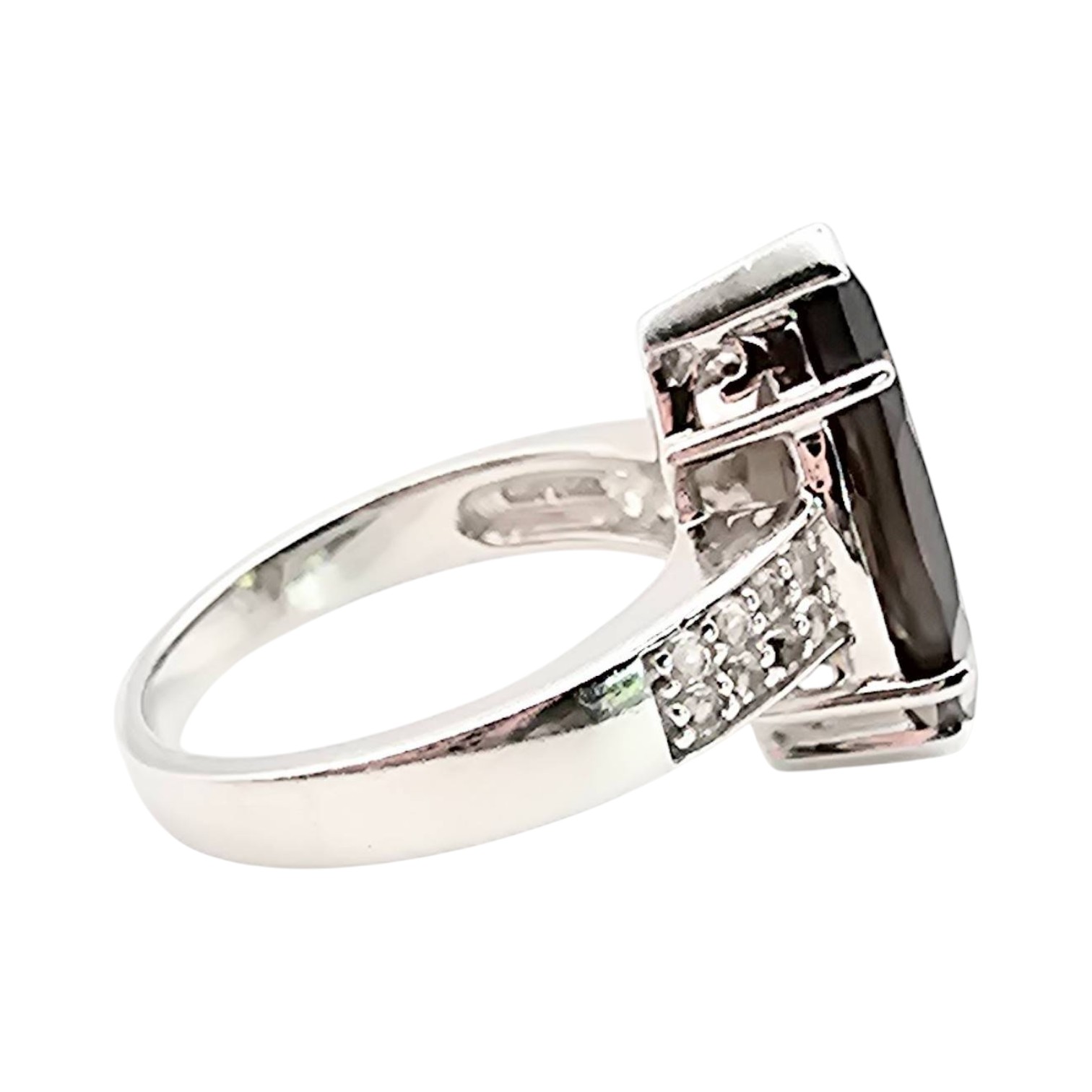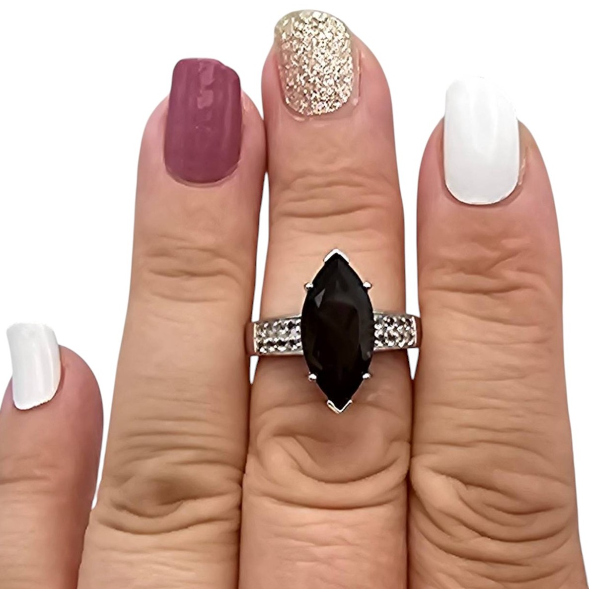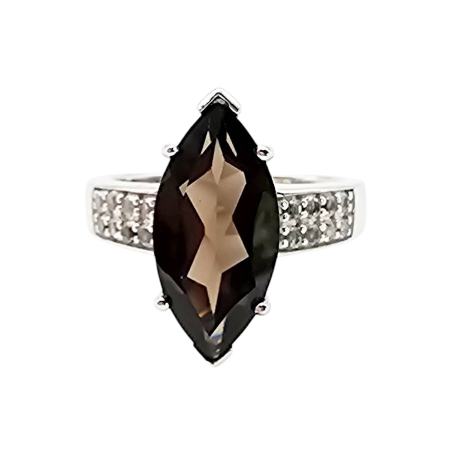 Sterling silver ring featuring a marquise-cut smoky quartz as the centerpiece. The band includes additional details of set stones for added design. Size 6.75 and weighs approximately 5.4 grams. Stylish and elegant, suitable for various occasions.