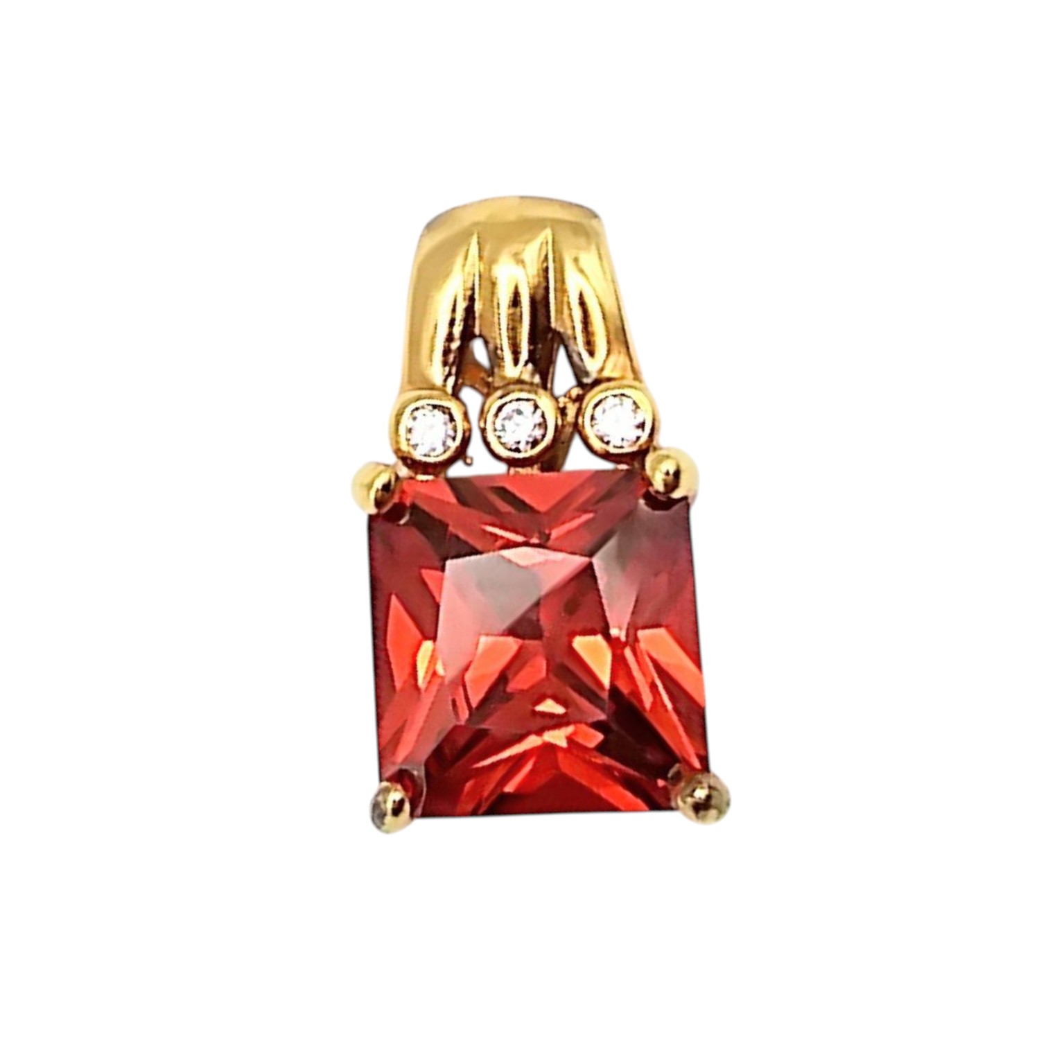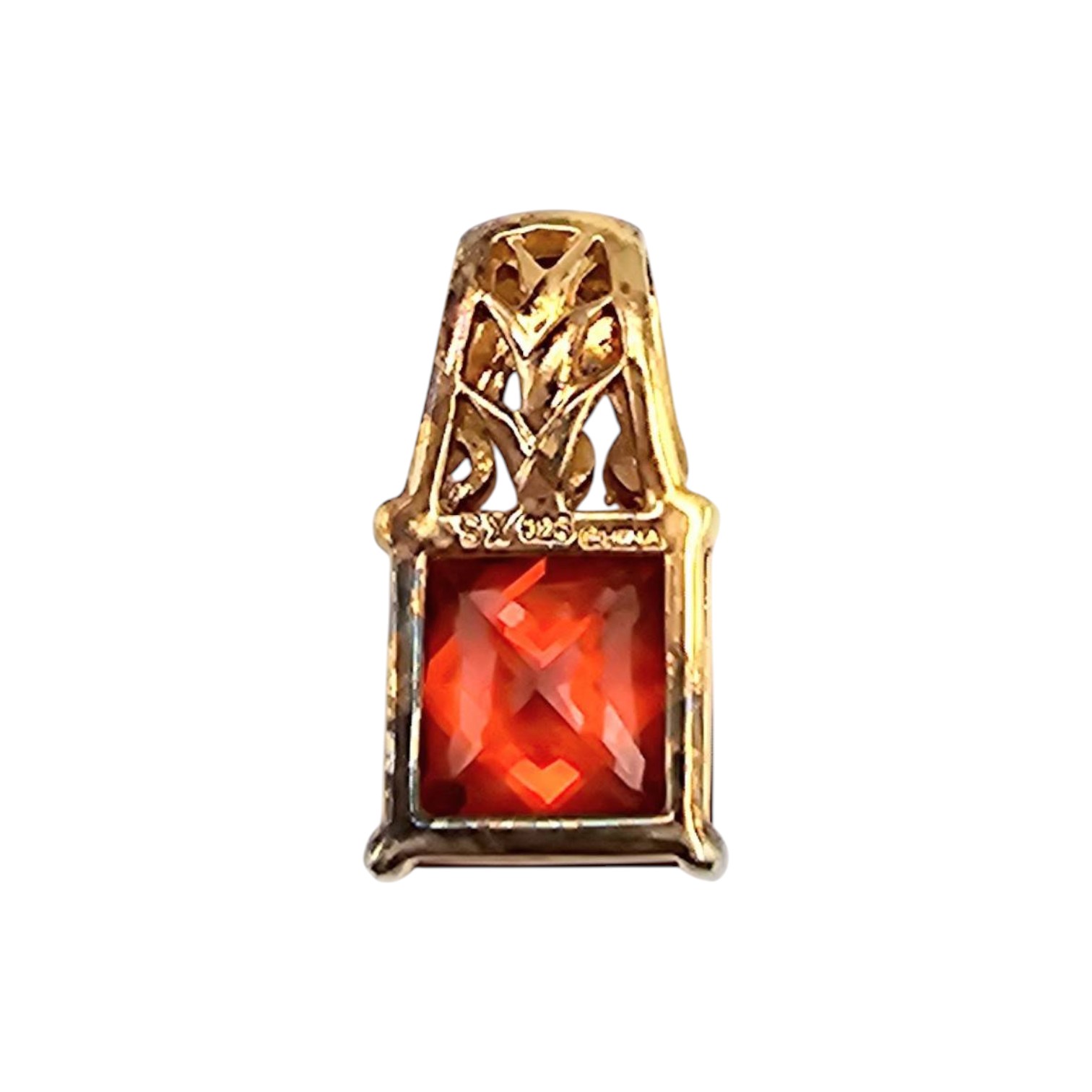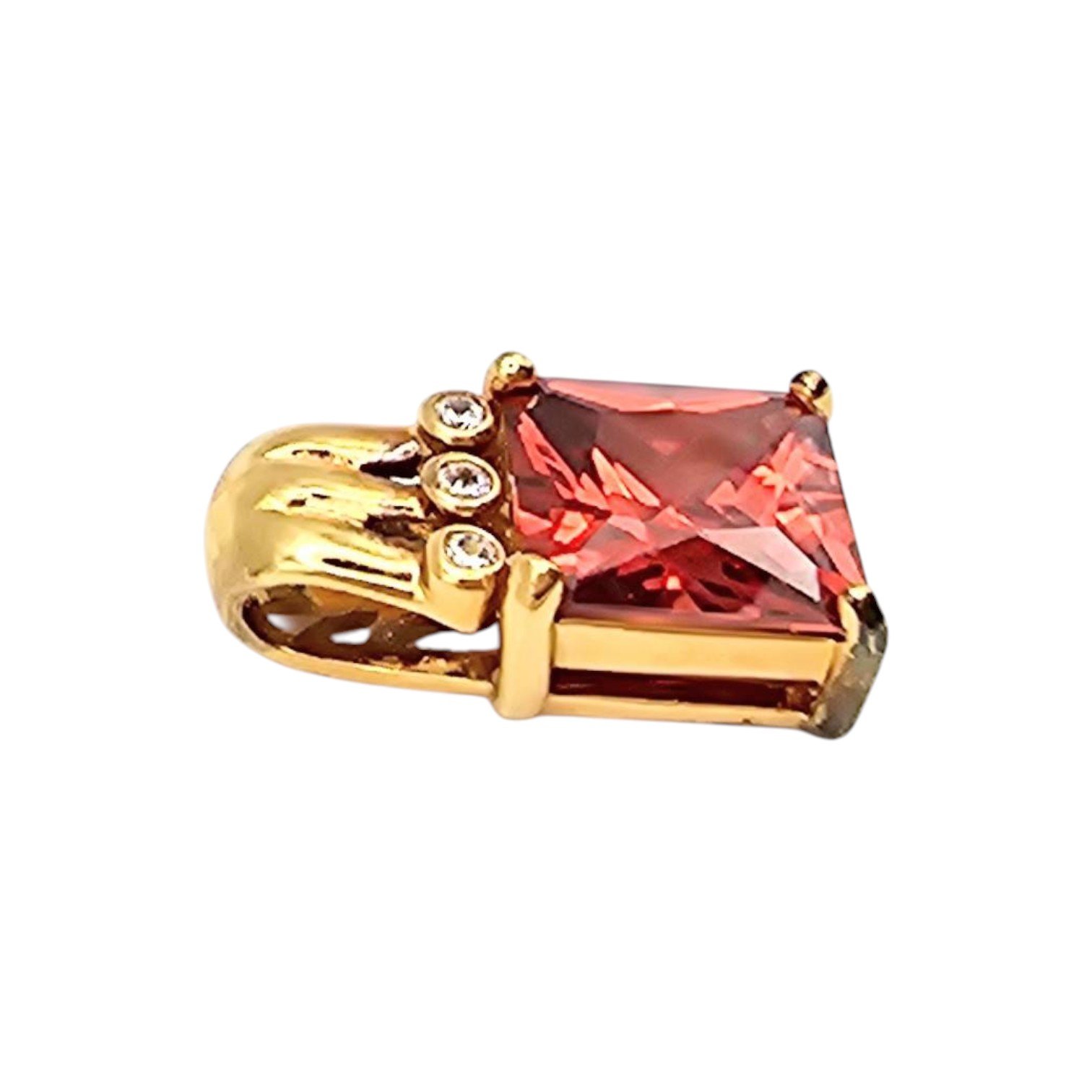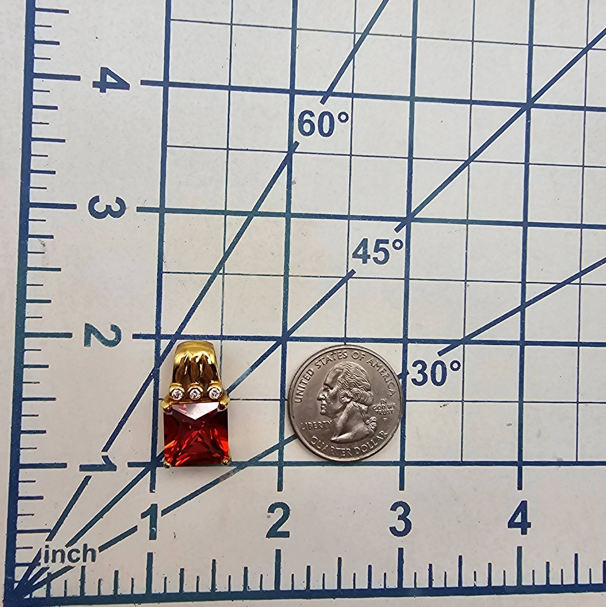 Gold Over sterling silver pendant marked SX, featuring a red rhinestone centerpiece in a geometric shape. Accented with three clear rhinestones on the goldtone bale. Weighs 6.8 grams. Approximately 1.5 inches in length as indicated by scale. Suitable as a pendant for a chain.