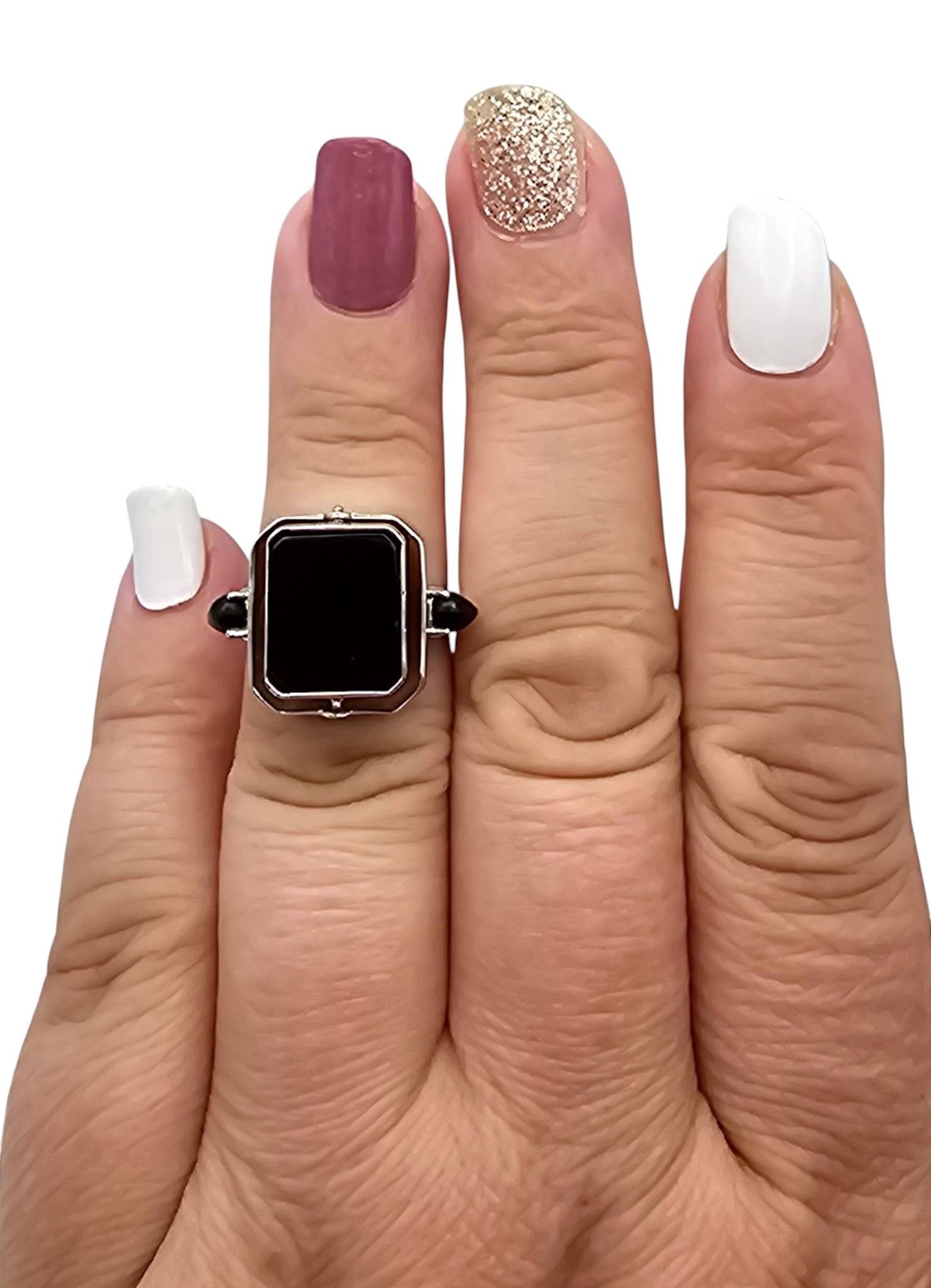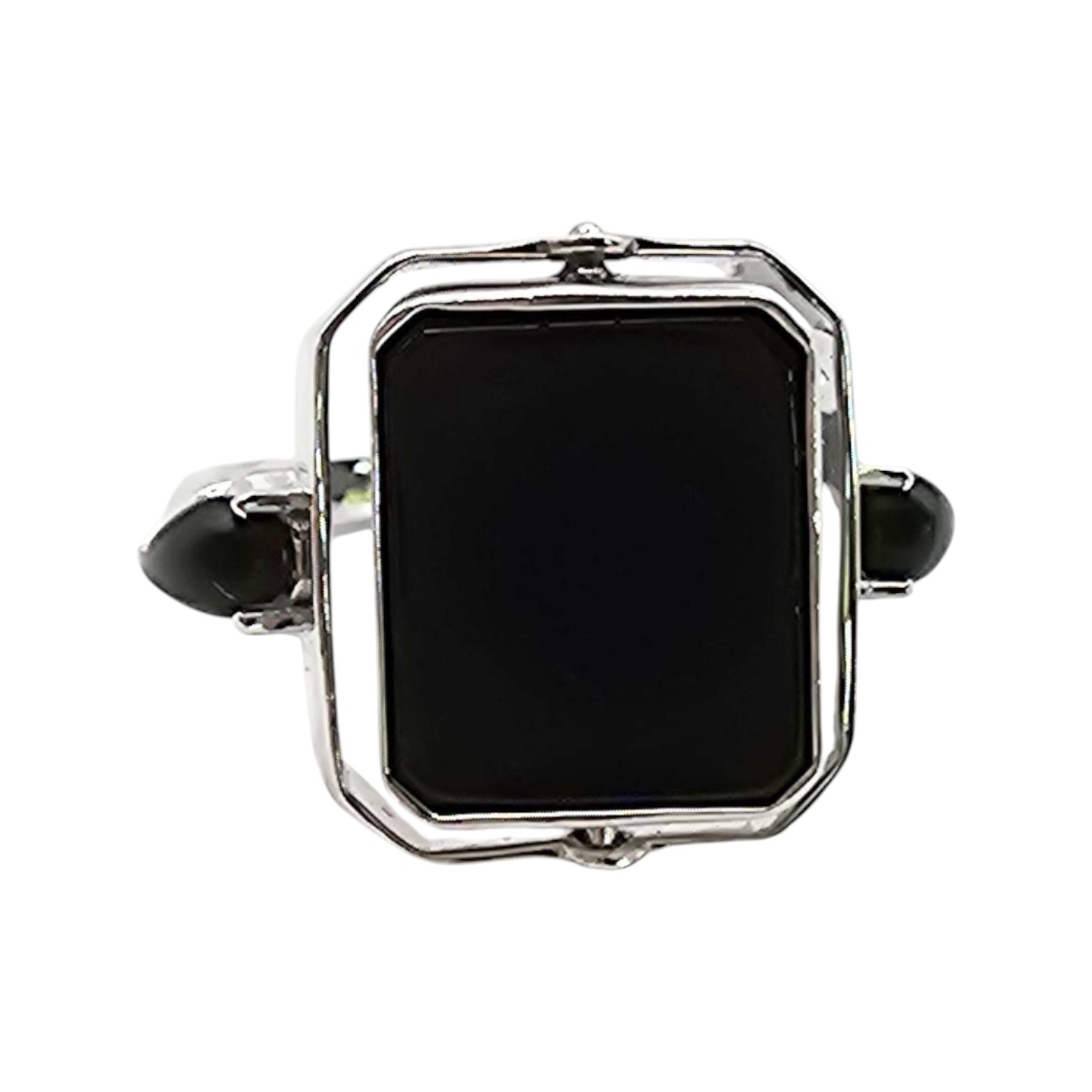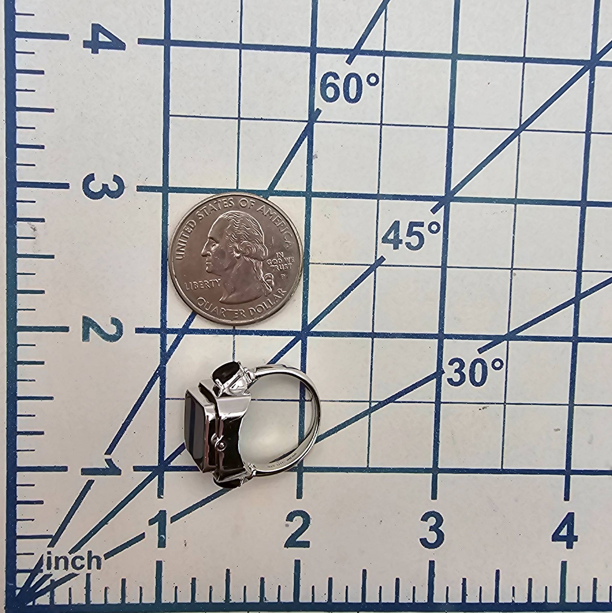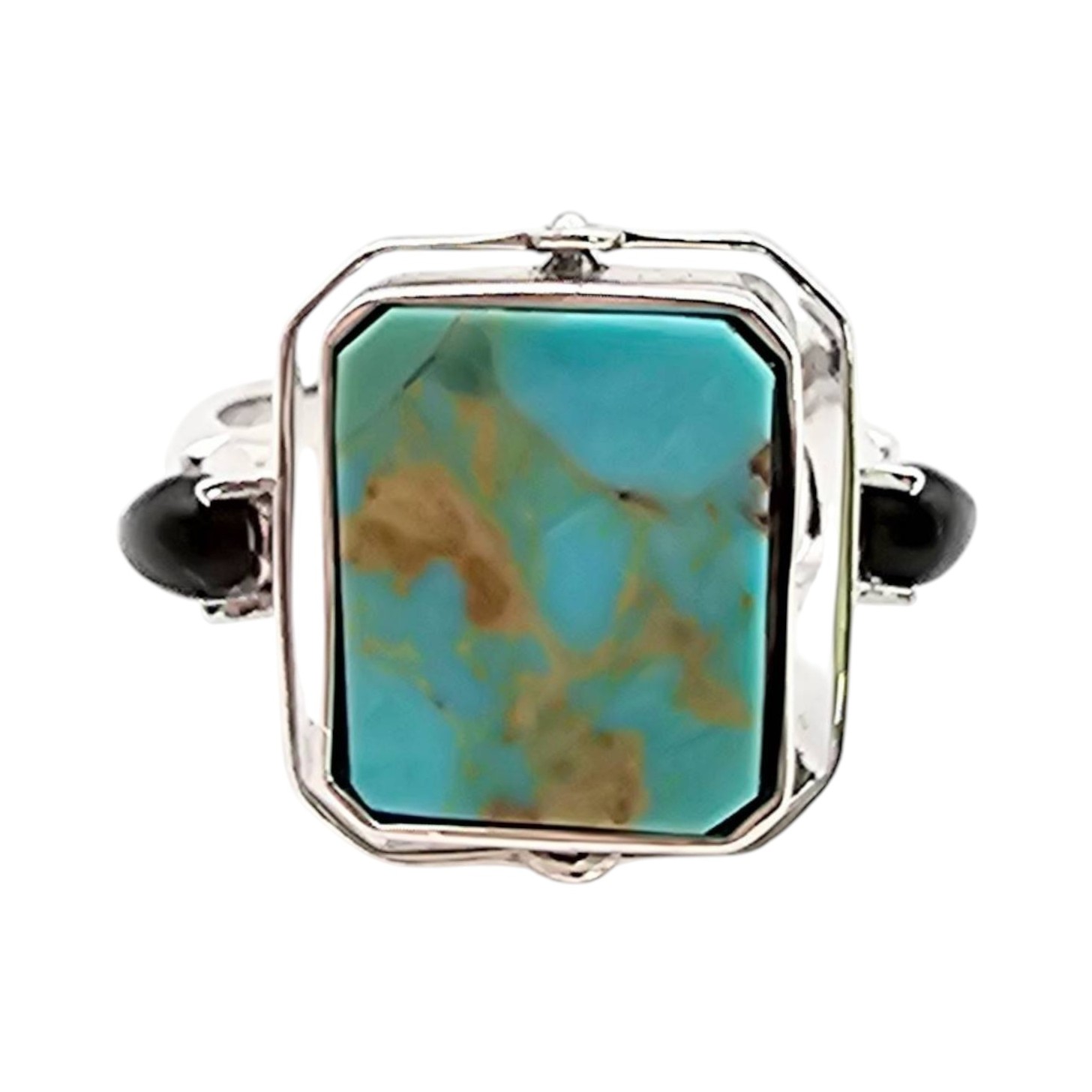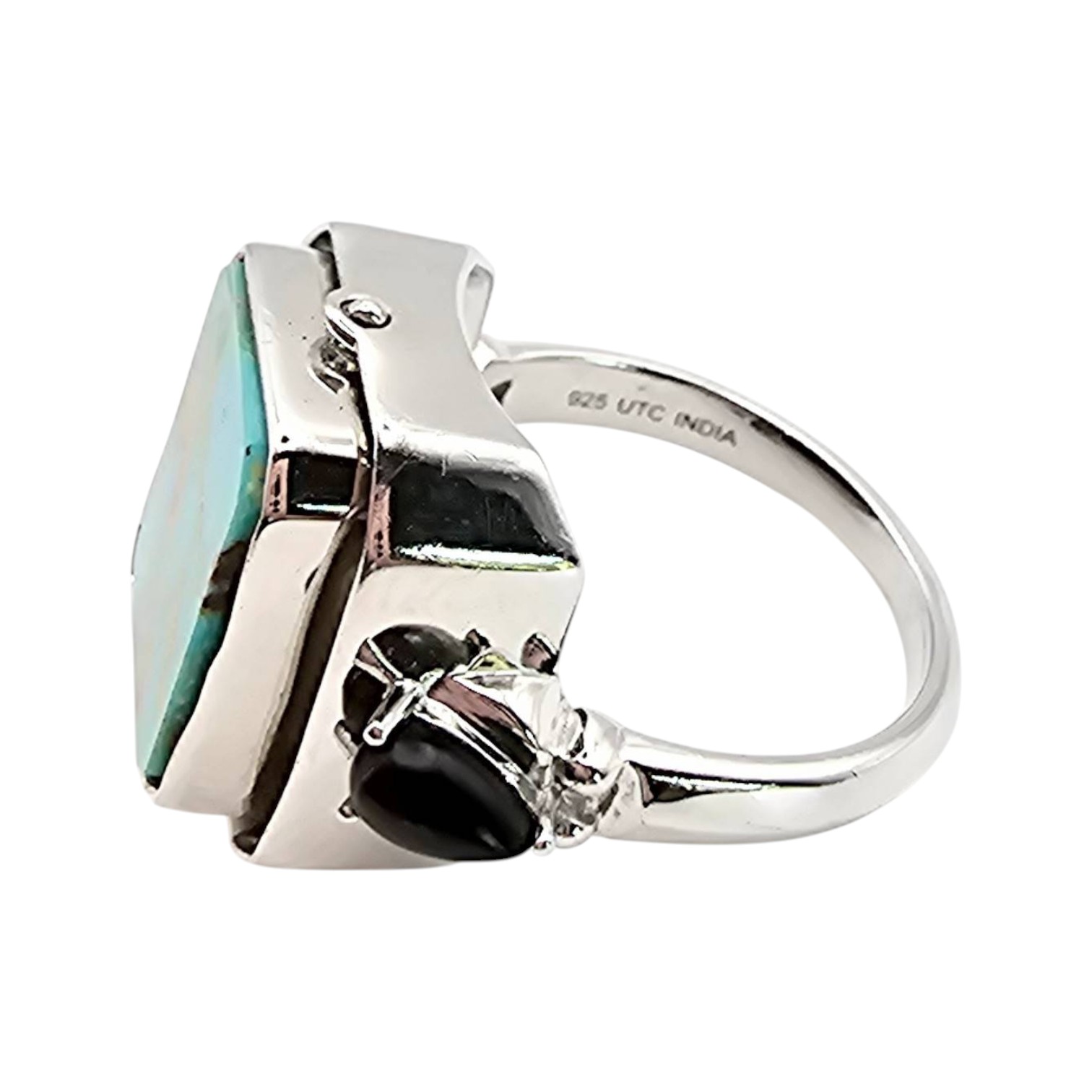 Sterling silver reversible ring featuring a square onyx on one side and a square turquoise stone on the other. The band includes accent details and is marked ‘925 UTC India’ to indicate sterling silver craftsmanship. The ring size is 6 and it weighs 6.1 grams, making it a versatile accessory. Excellent for collectors or wearers of unique jewelry.