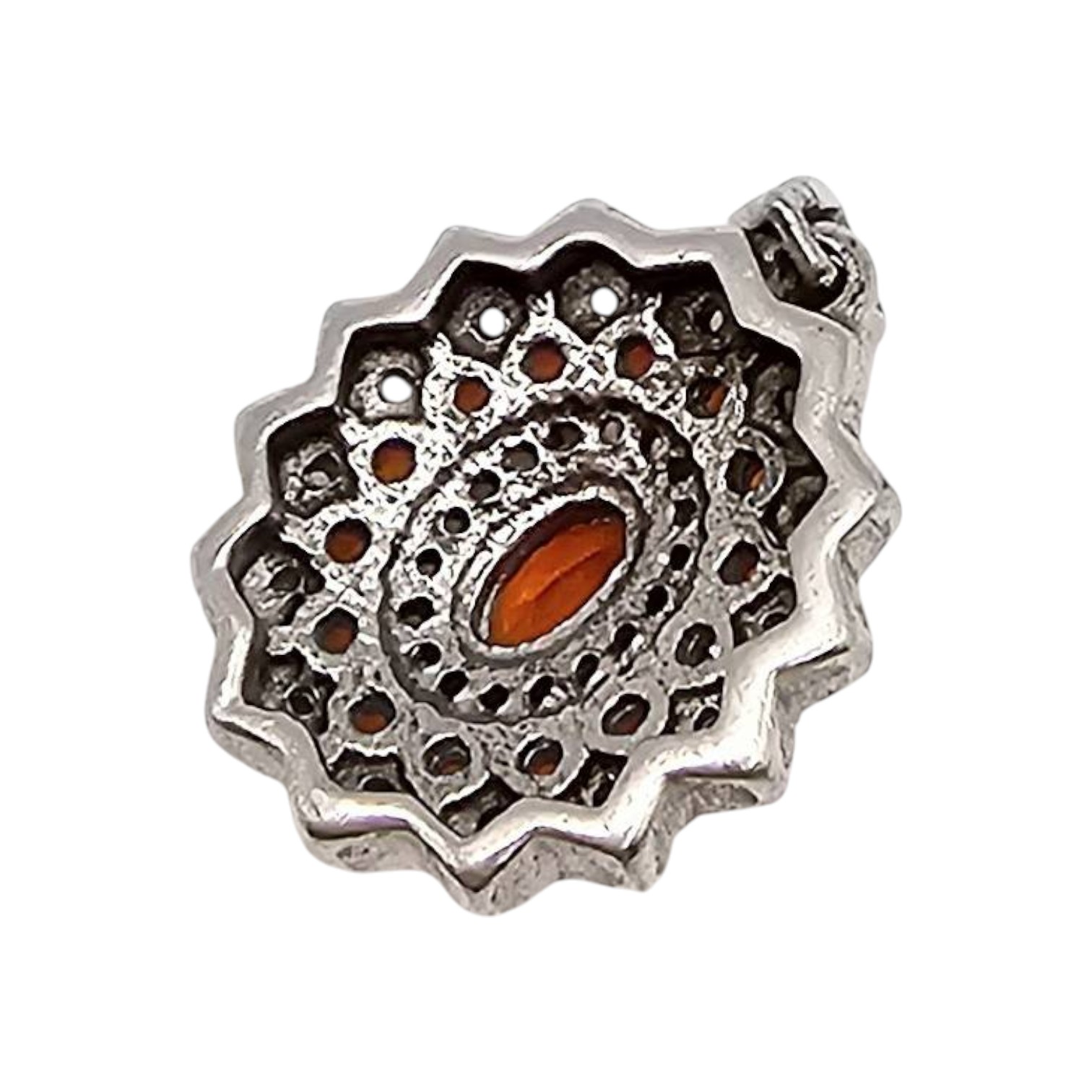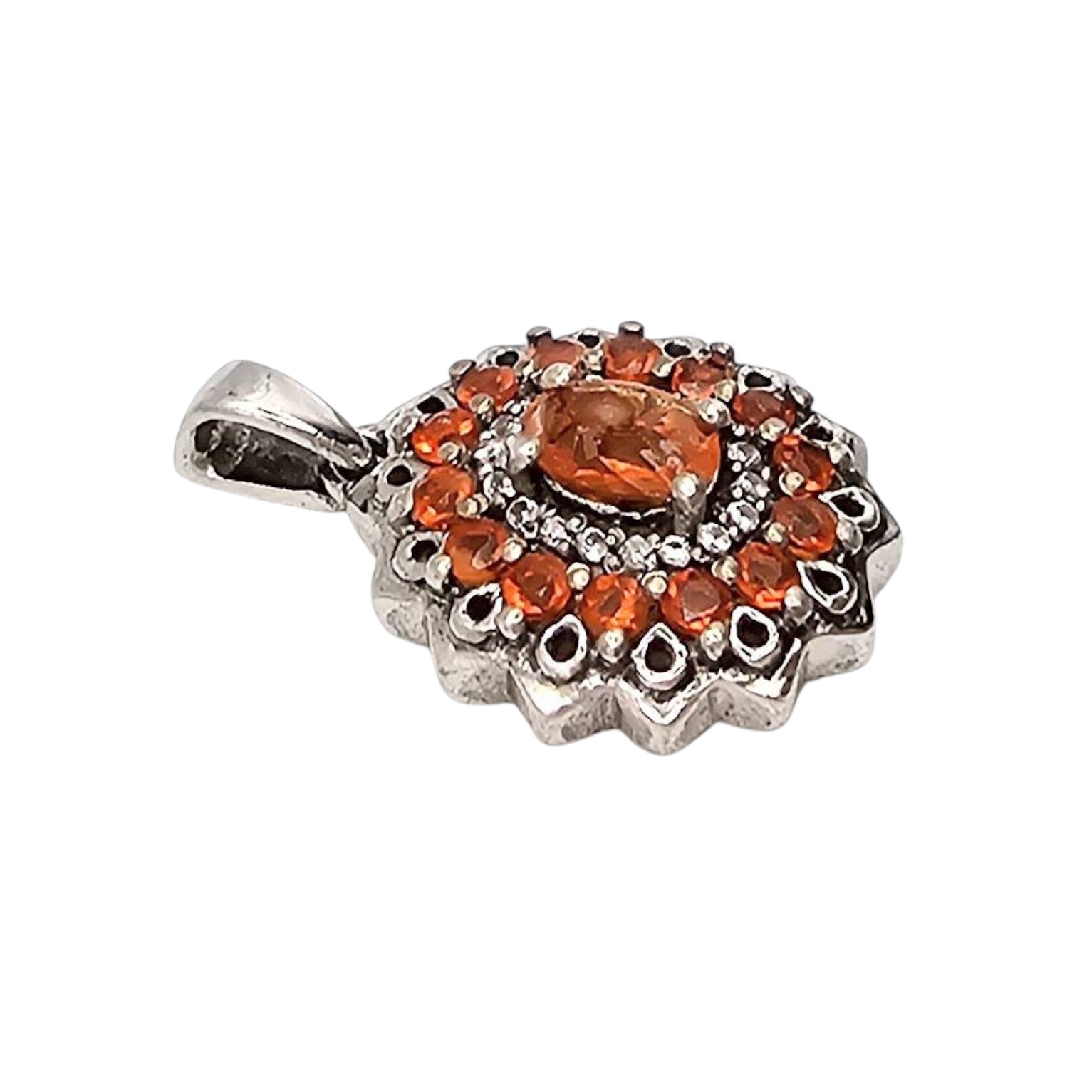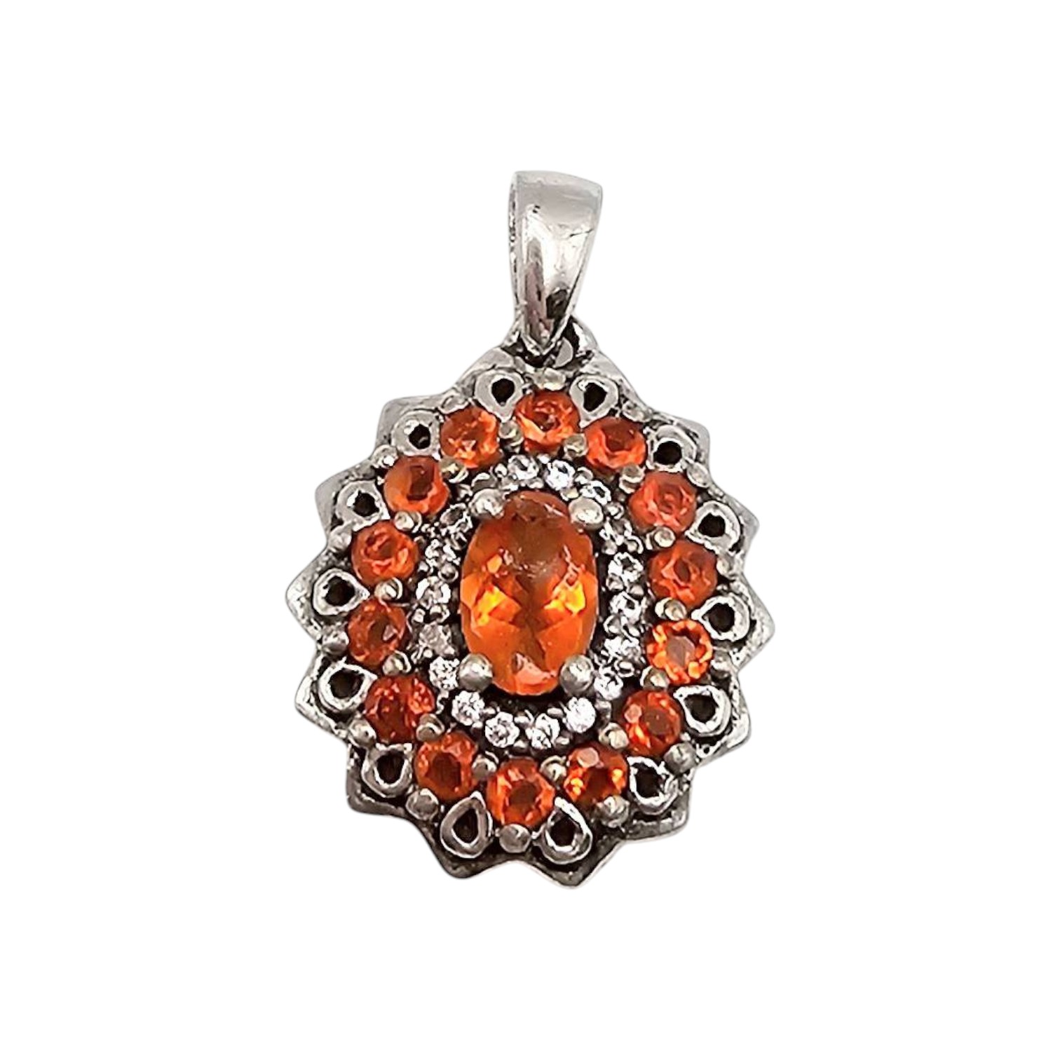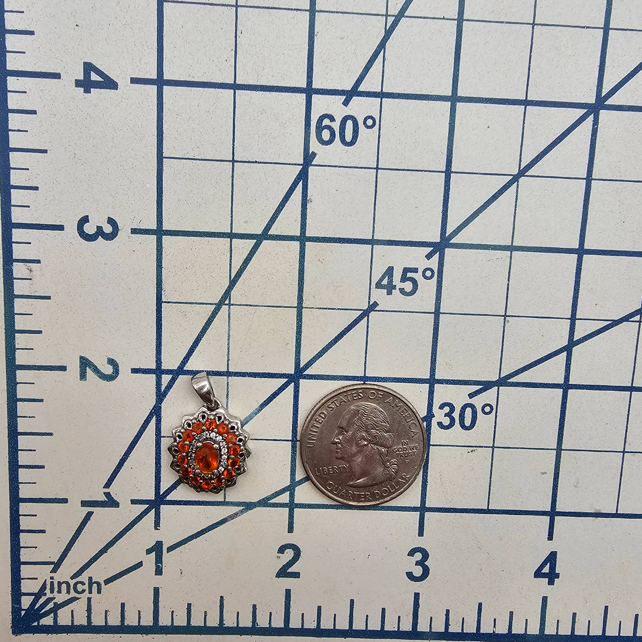 Sterling silver pendant featuring orange rhinestones surrounded by a detailed setting. The central orange stone is oval-shaped, accented by a pattern of smaller rhinestones. The pendant weighs 3.7 grams and is compact in size, as shown in the image with measurement markings. Back of the piece is decorative, showcasing pierced metalwork.