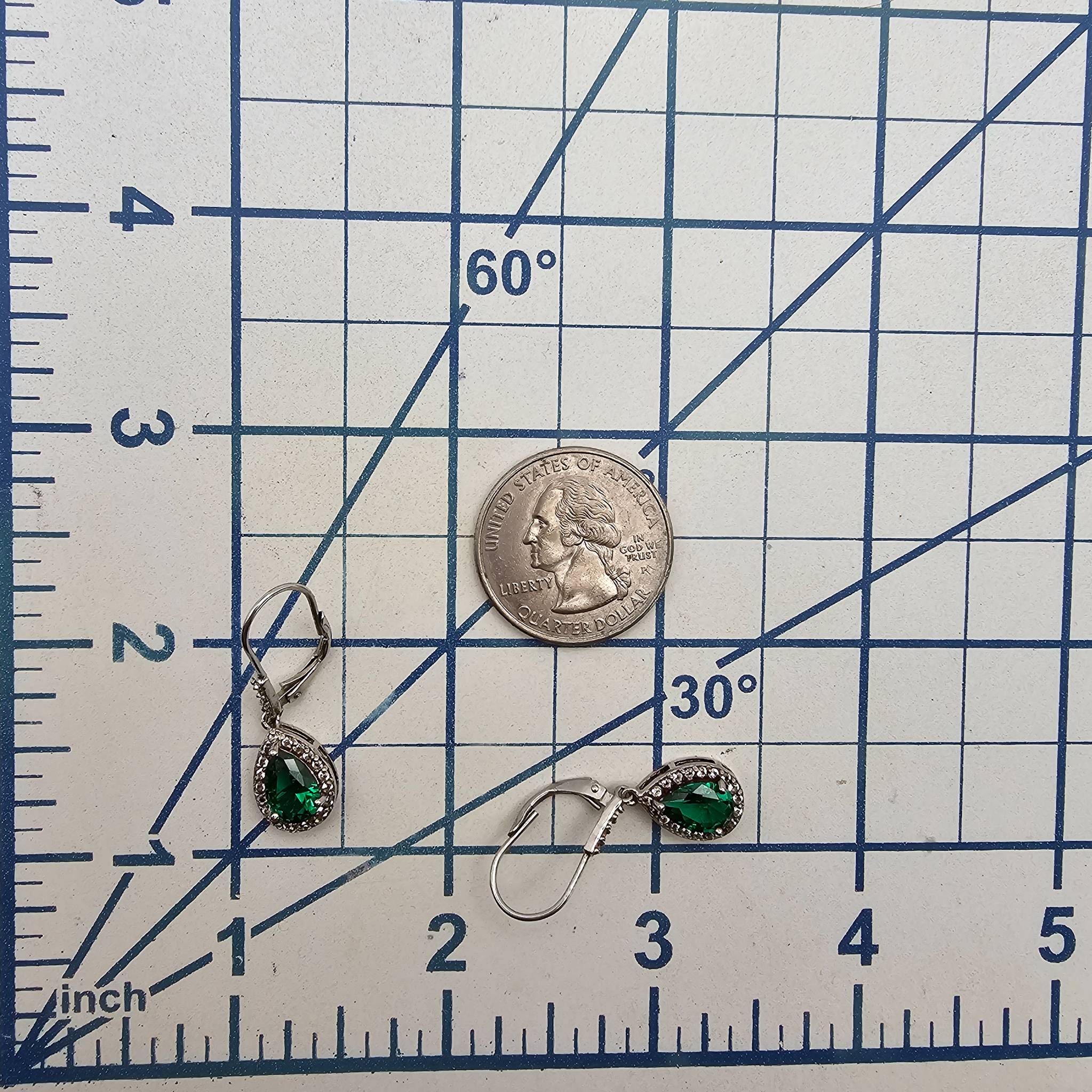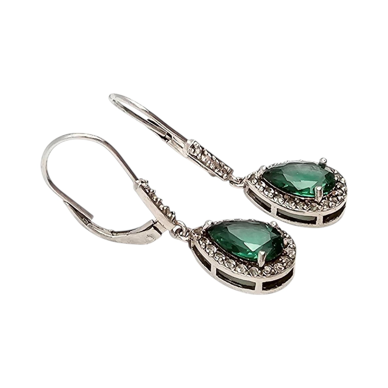 FAS sterling silver drop earrings featuring green rhinestone centerpieces surrounded by small clear rhinestones. The earrings weigh approximately 3.5 grams and have lever-back closures for secure wear. They are marked with ‘FAS’ for authenticity.