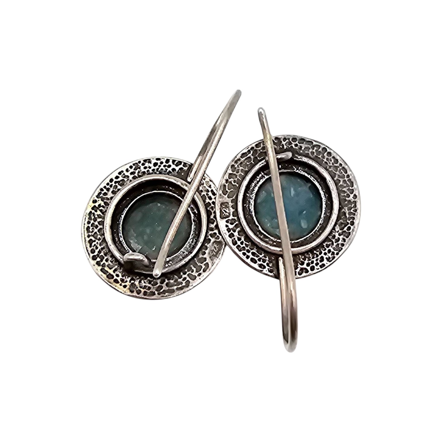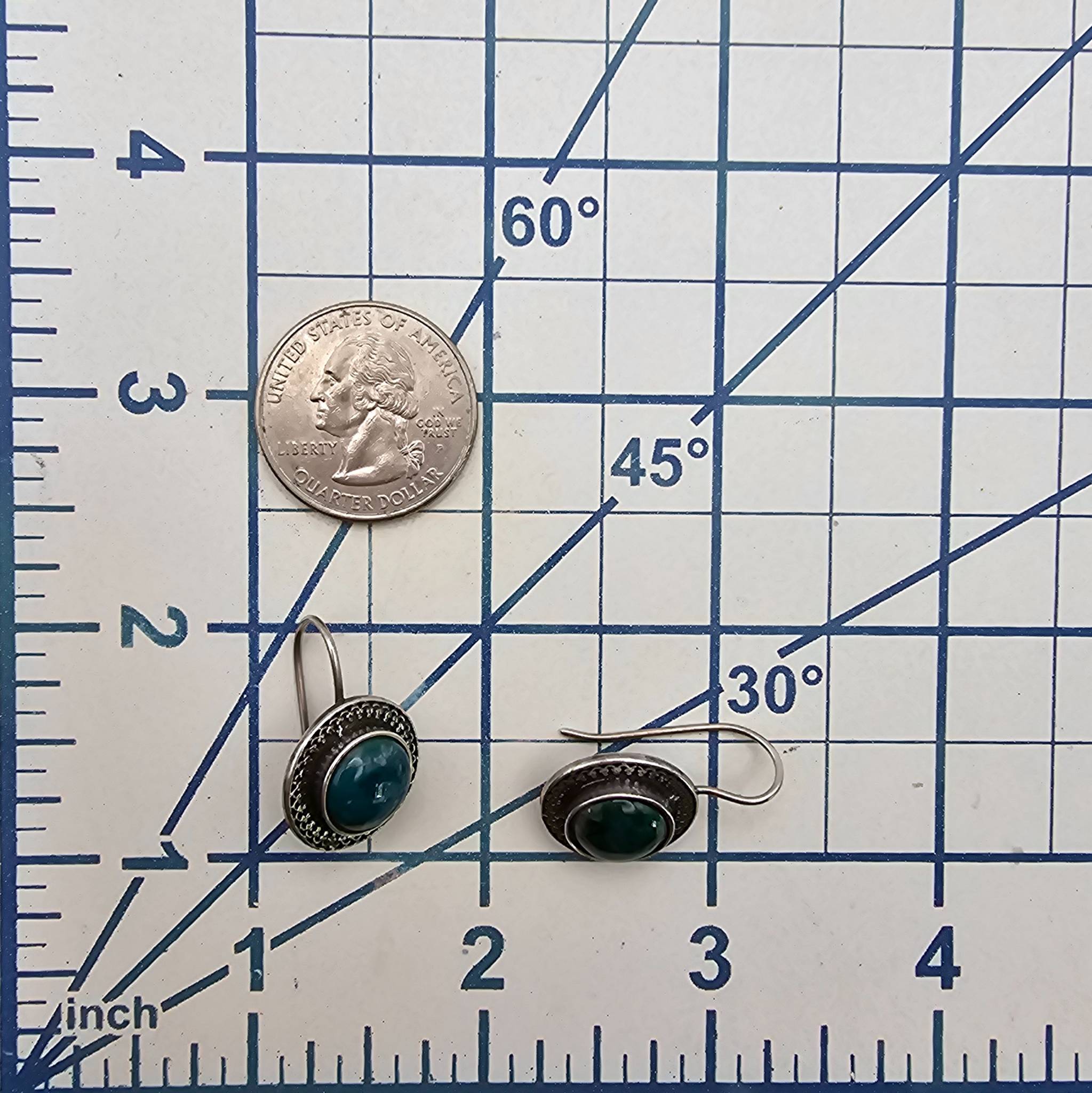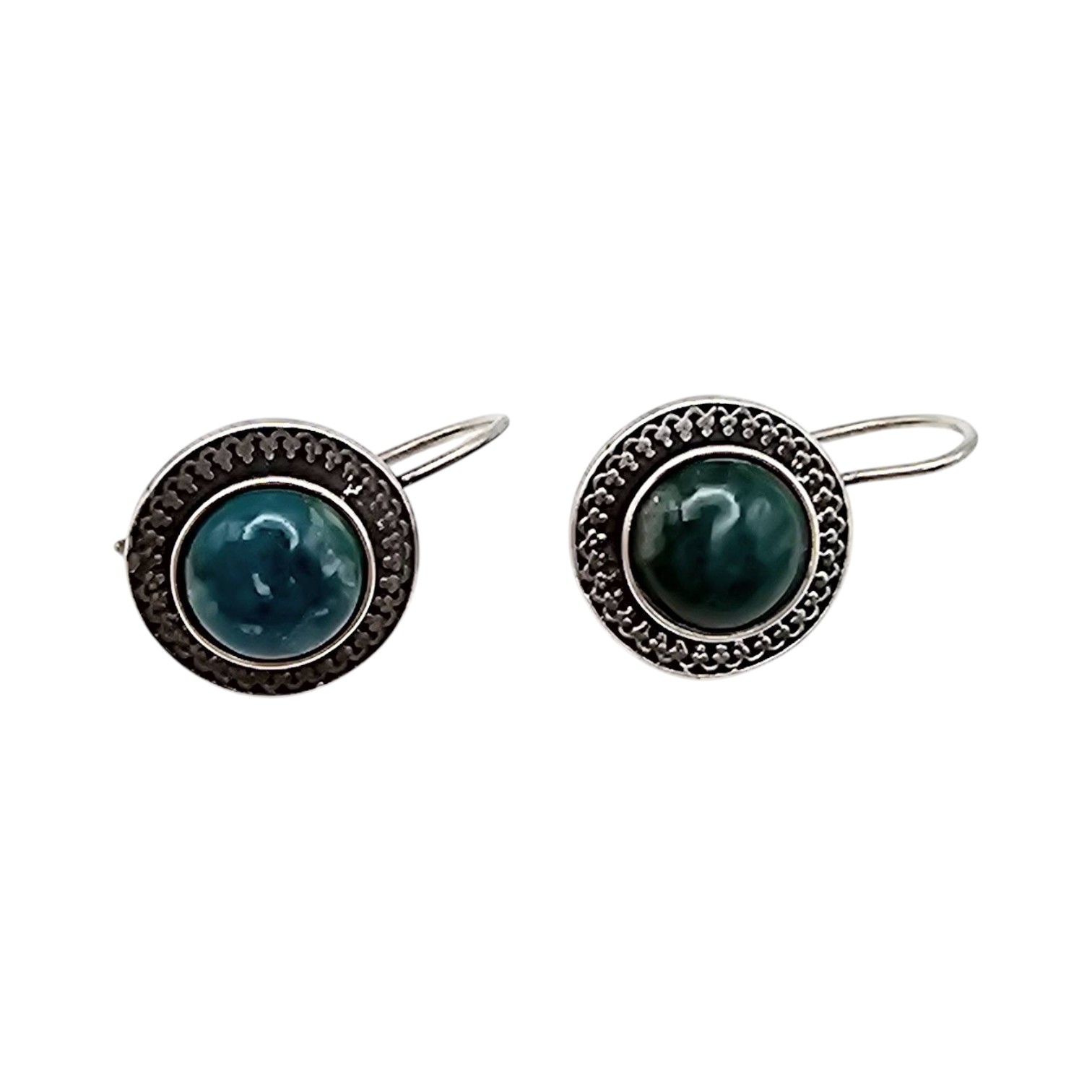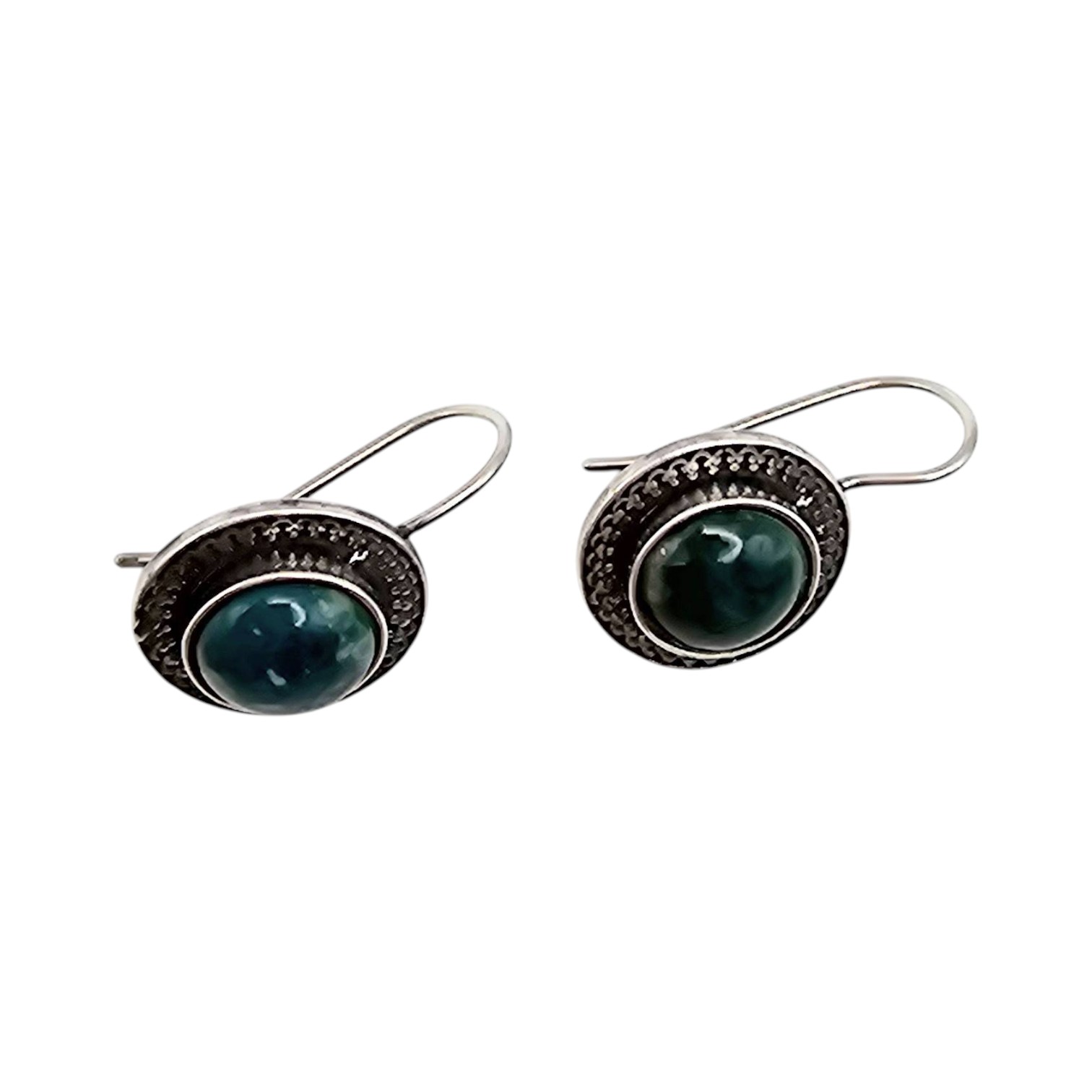 Sterling silver earrings featuring natural stone cabochons as the centerpiece. Each earring has a textured silver border surrounding the stone. The pair weighs 6.9 grams. The design includes hook-style fastenings. Suitable for pierced ears. Condition appears consistent with light wear.