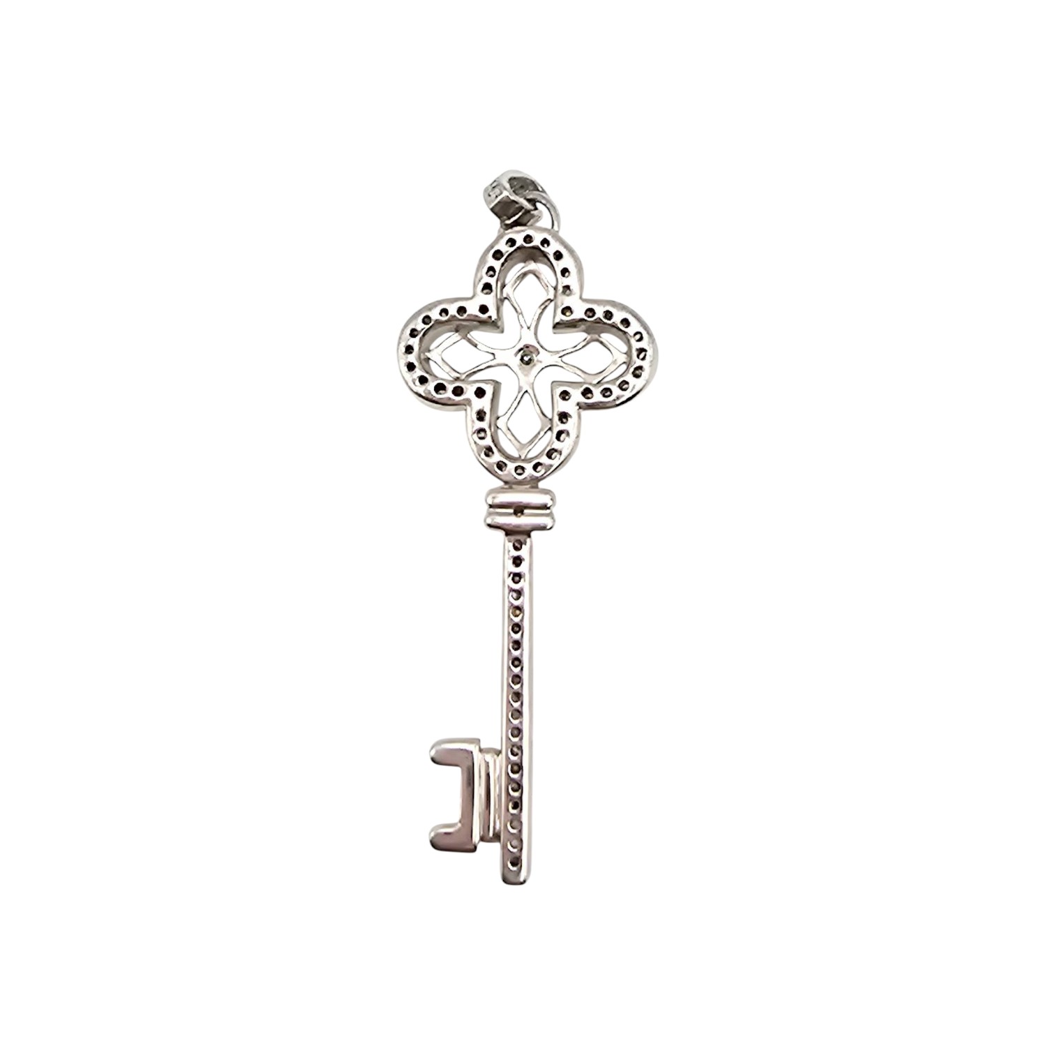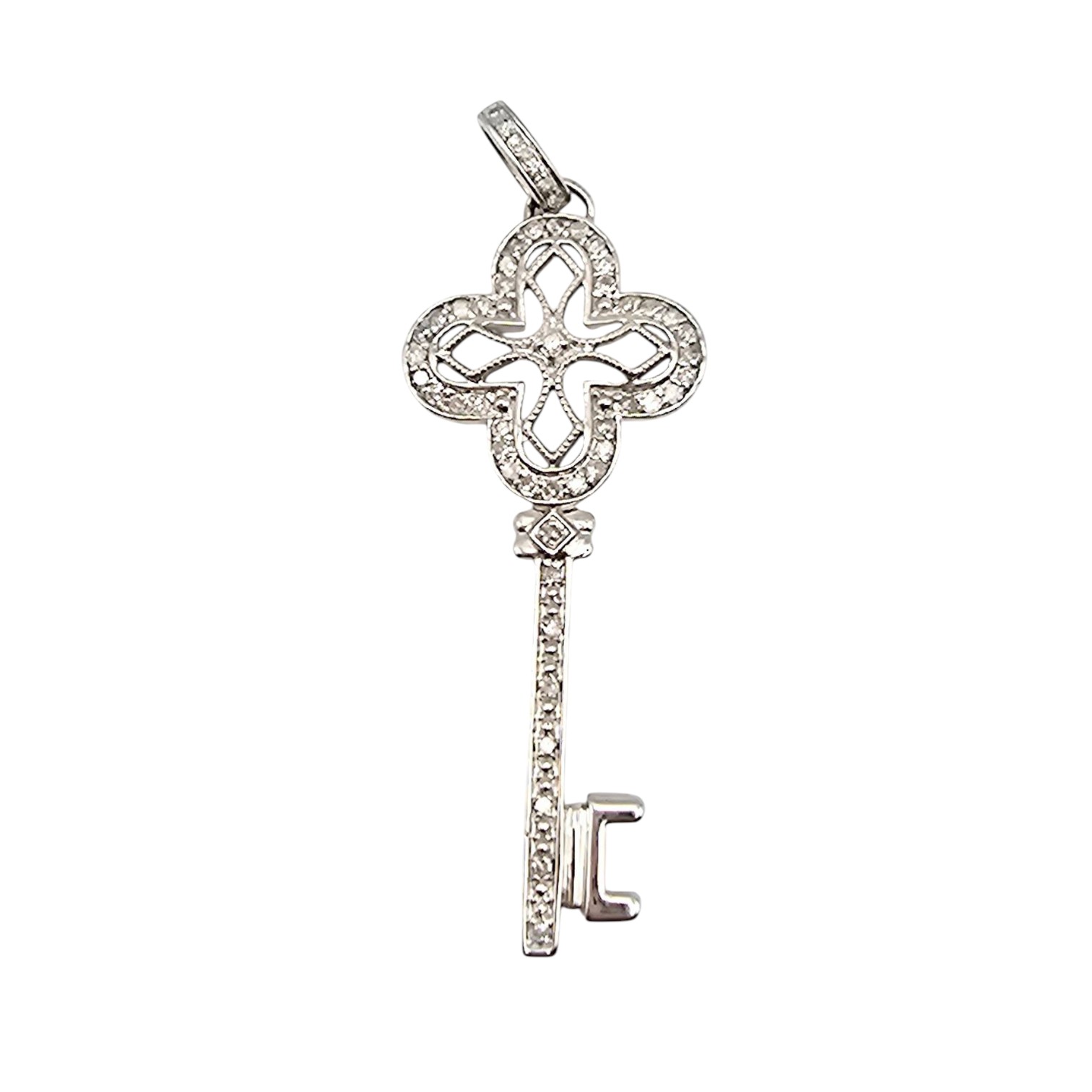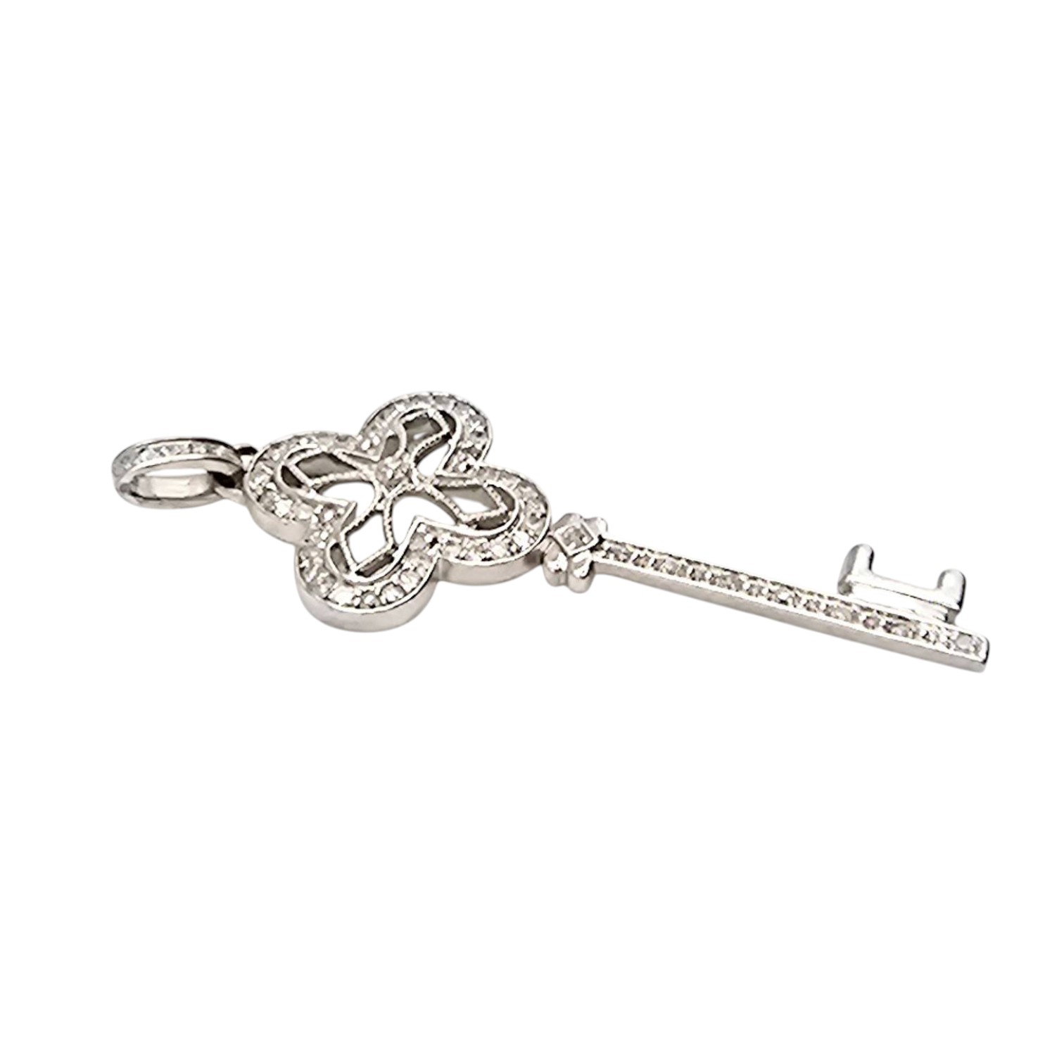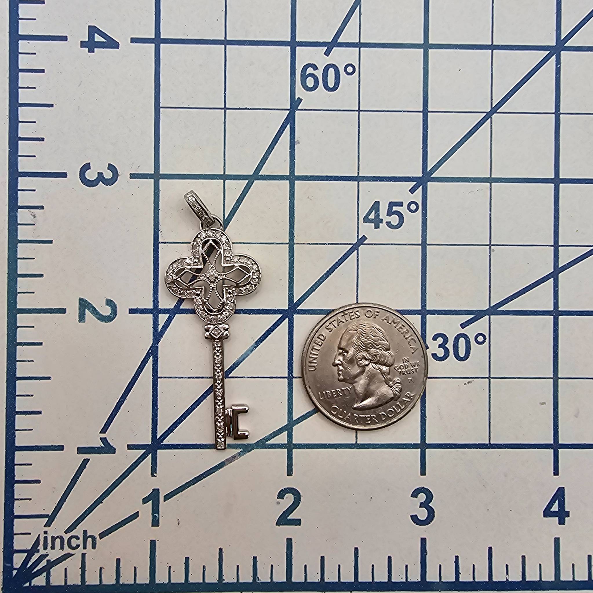 Sterling silver key-shaped pendant featuring diamond accents and a delicate, icy design. The pendant measures approximately 3 inches in length with a detailed clover-like top and a diamond pave pattern adorning both the shaft and edges. Includes a bail for attachment to a chain or necklace. Condition appears excellent with minimal signs of wear.