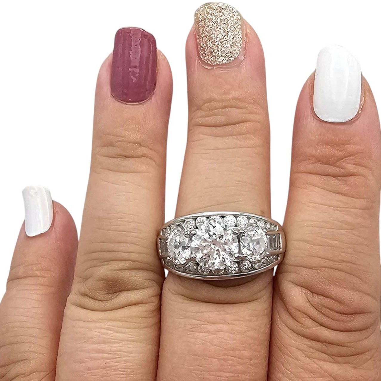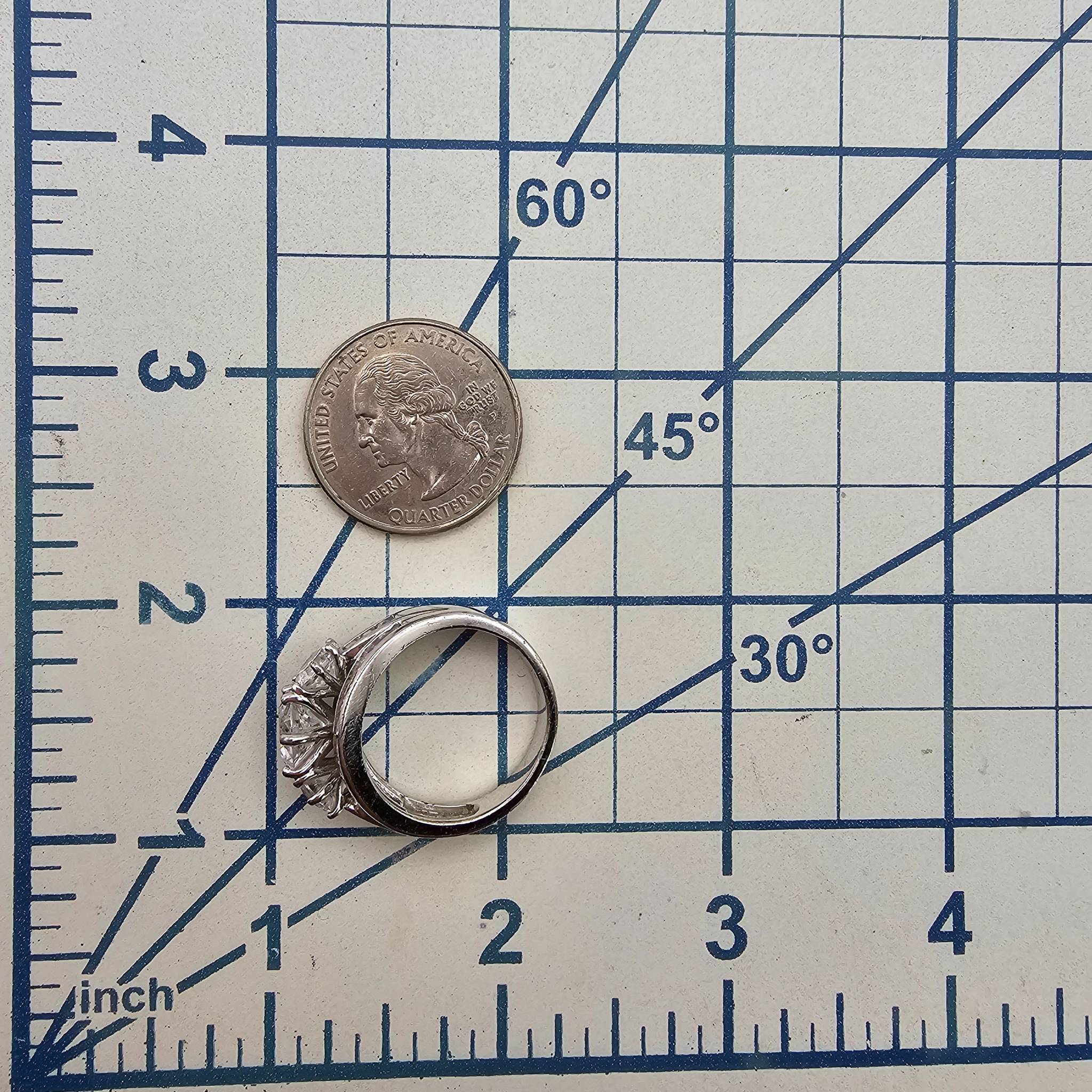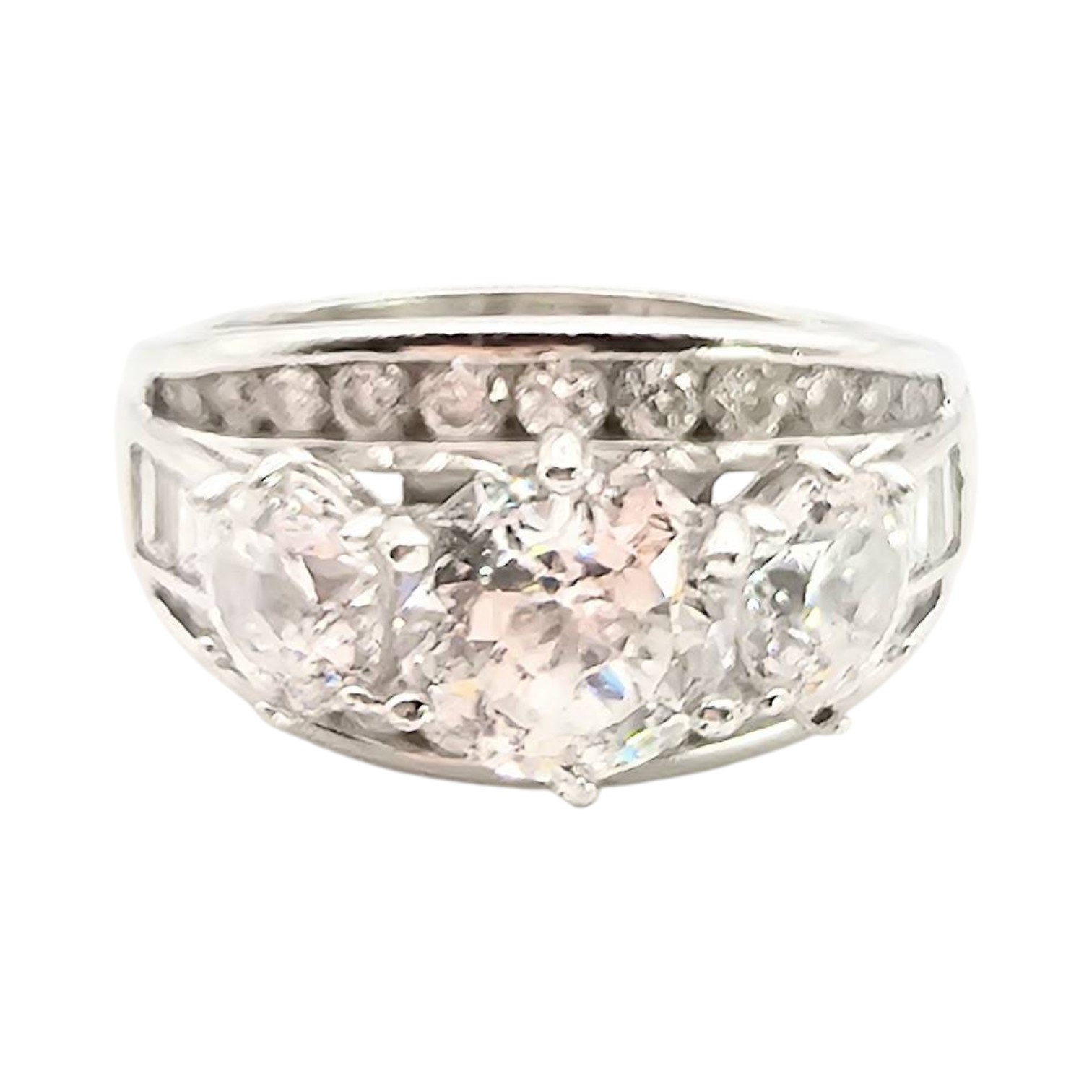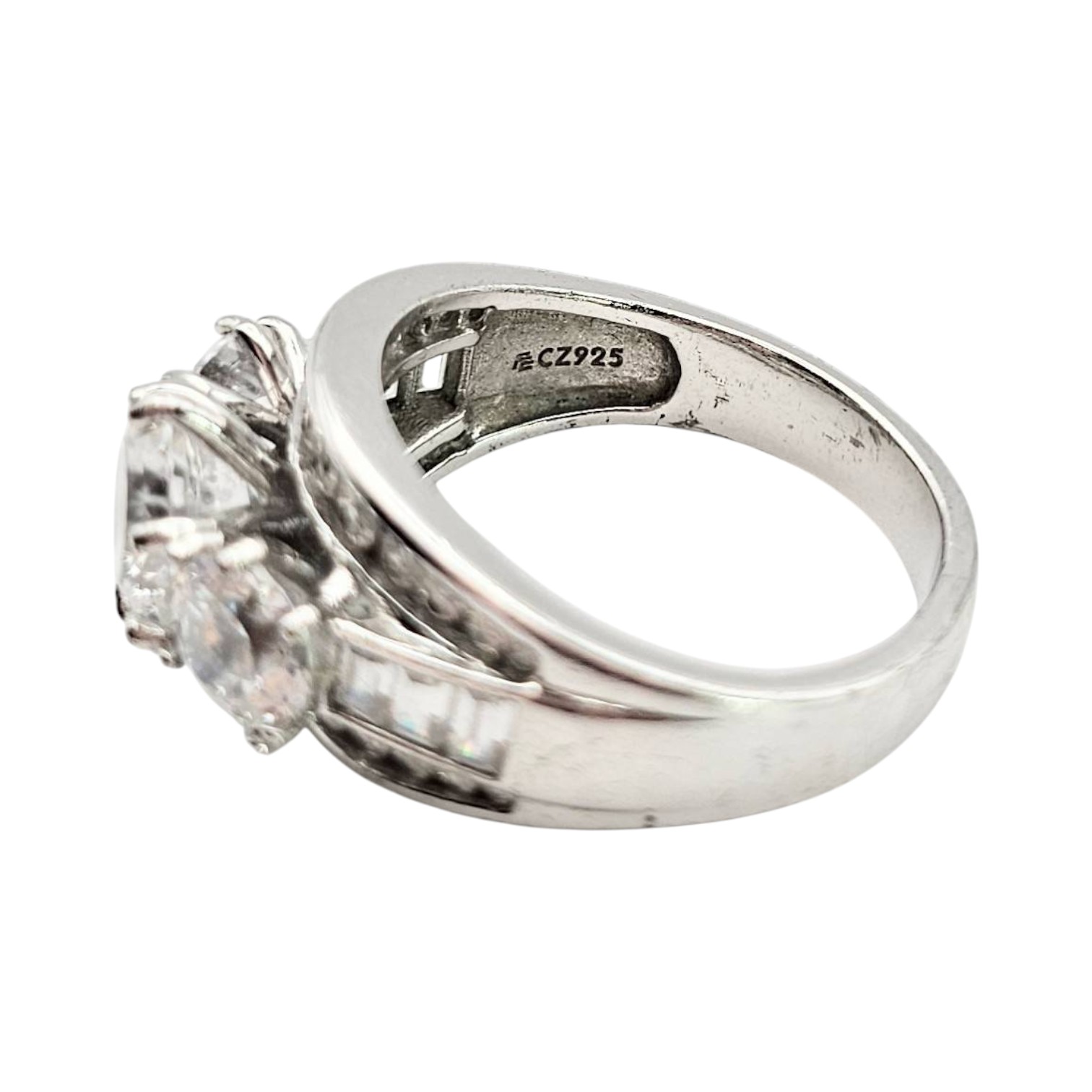 Sterling silver ring marked 925, featuring cubic zirconia stones in a three-stone design. The size of the ring is 9.5, and it weighs 9.5 grams. Intricate detailing enhances its elegant appearance, and the piece is well-suited for a range of occasions. The inner band is inscribed with the 925 sterling silver hallmark.