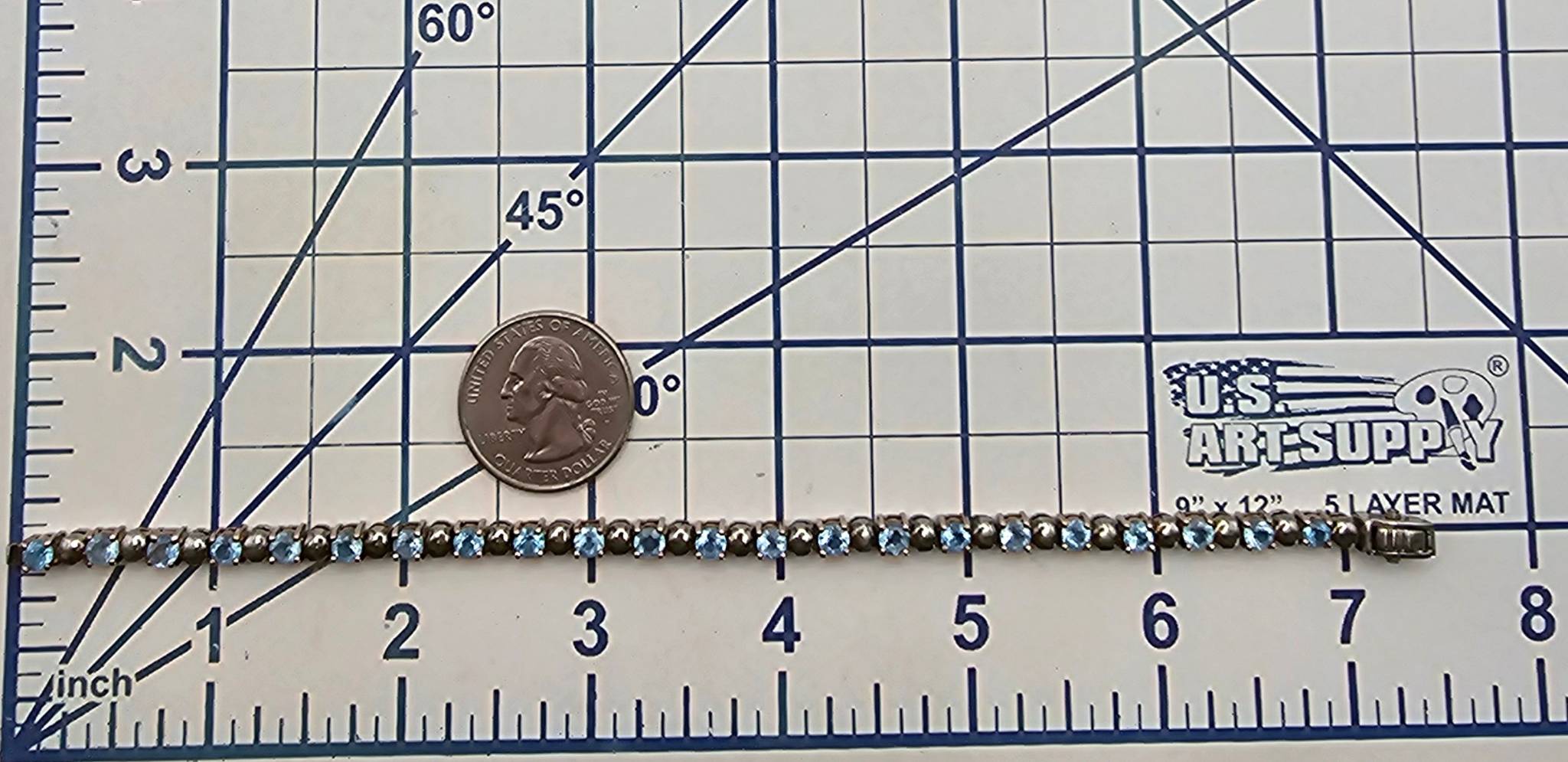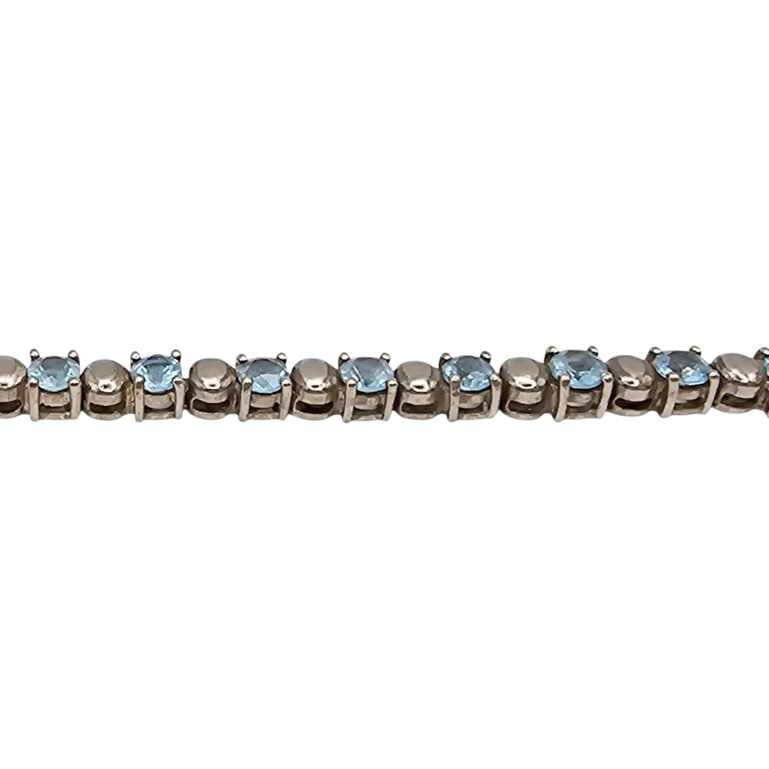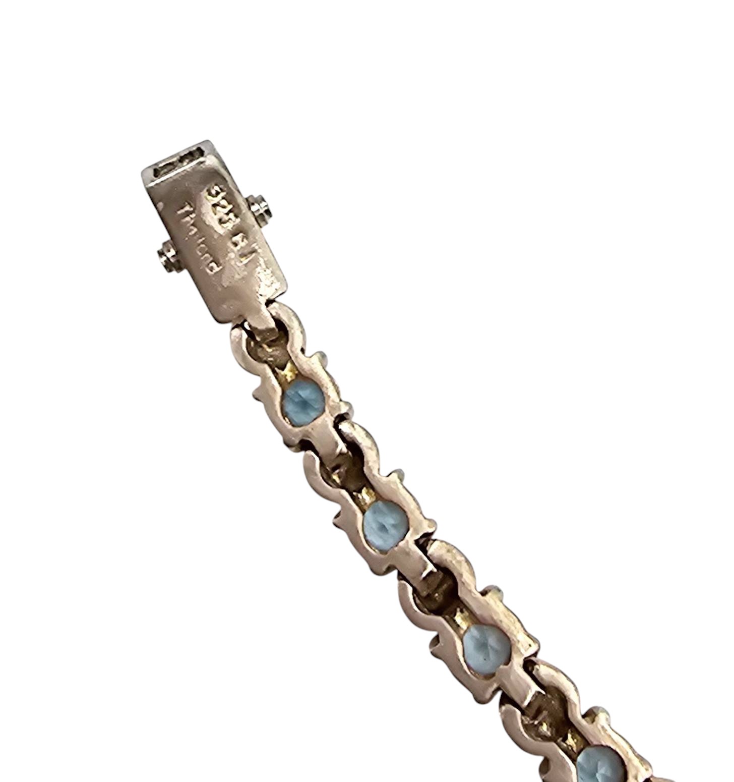 Sterling silver tennis bracelet featuring blue topaz gemstones in a classic prong setting. Weighs 13.9 grams and is equipped with a secure clasp mechanism. The bracelet measures approximately 7 inches in length. The piece is in good condition with all stones intact.