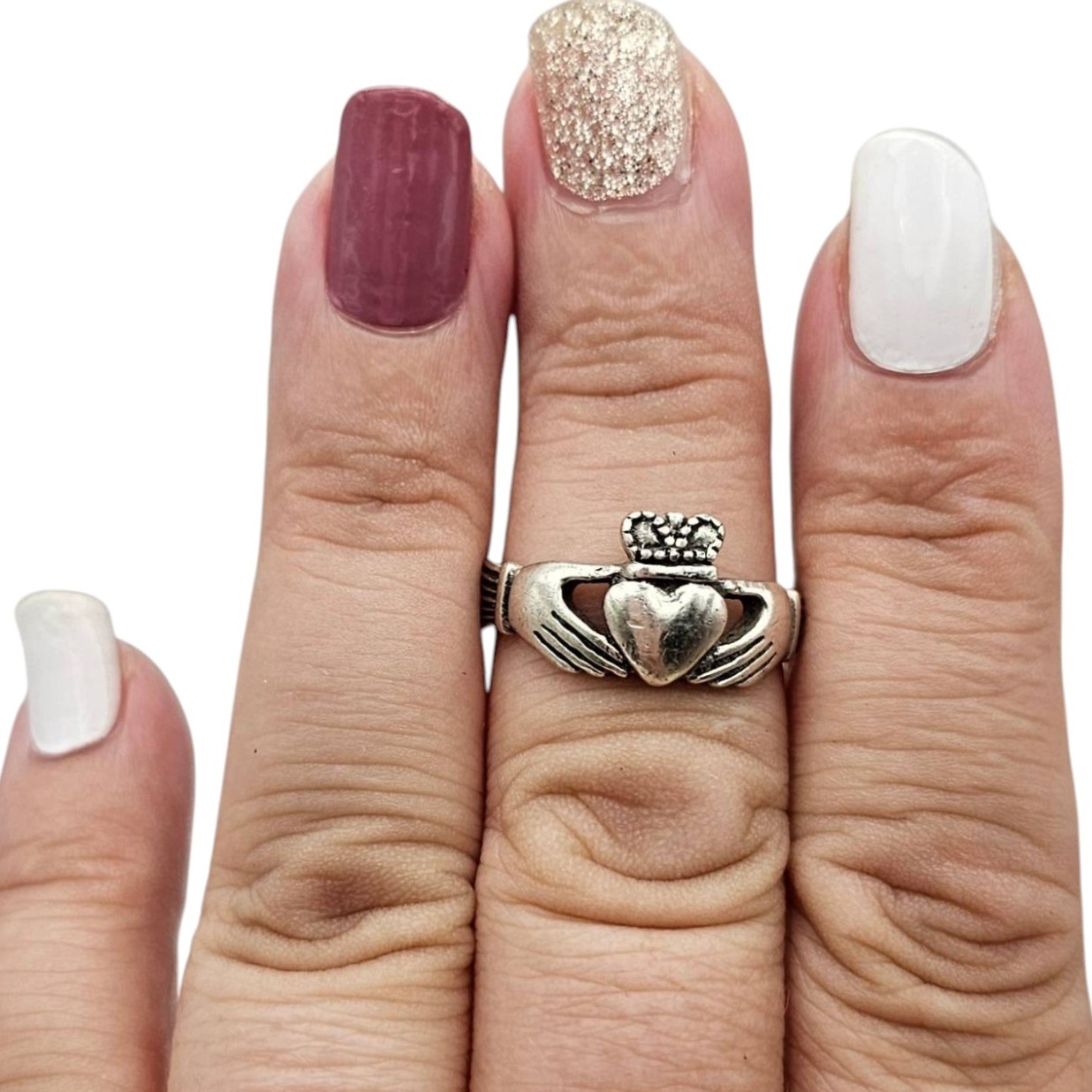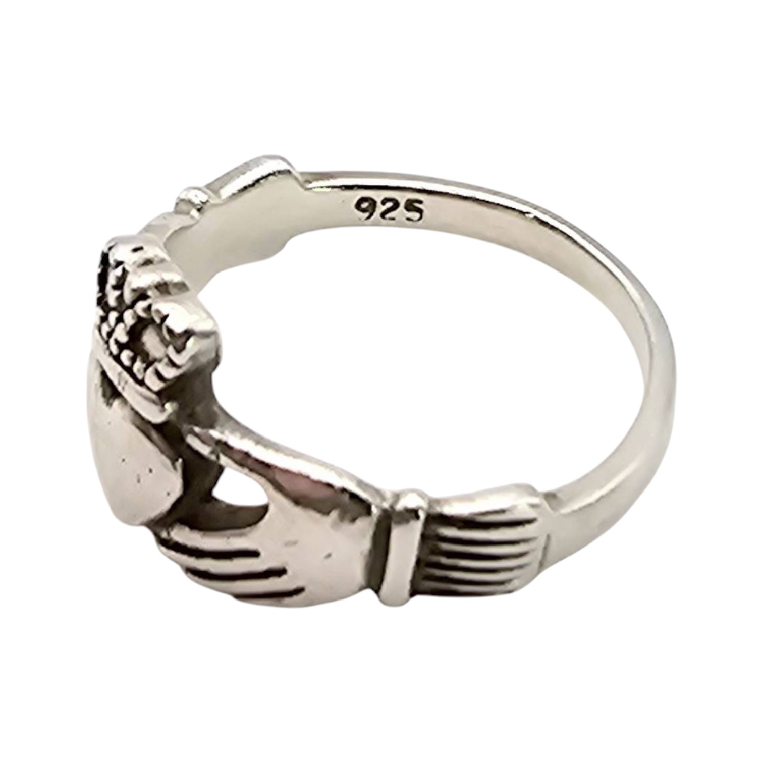 Sterling silver Claddagh ring, size 7, weighing approximately 3.9 grams. Features traditional Claddagh design with hands, heart, and crown. Stamped ‘925’ on the inner band, indicating sterling silver composition. Classic symbol of love, loyalty, and friendship.