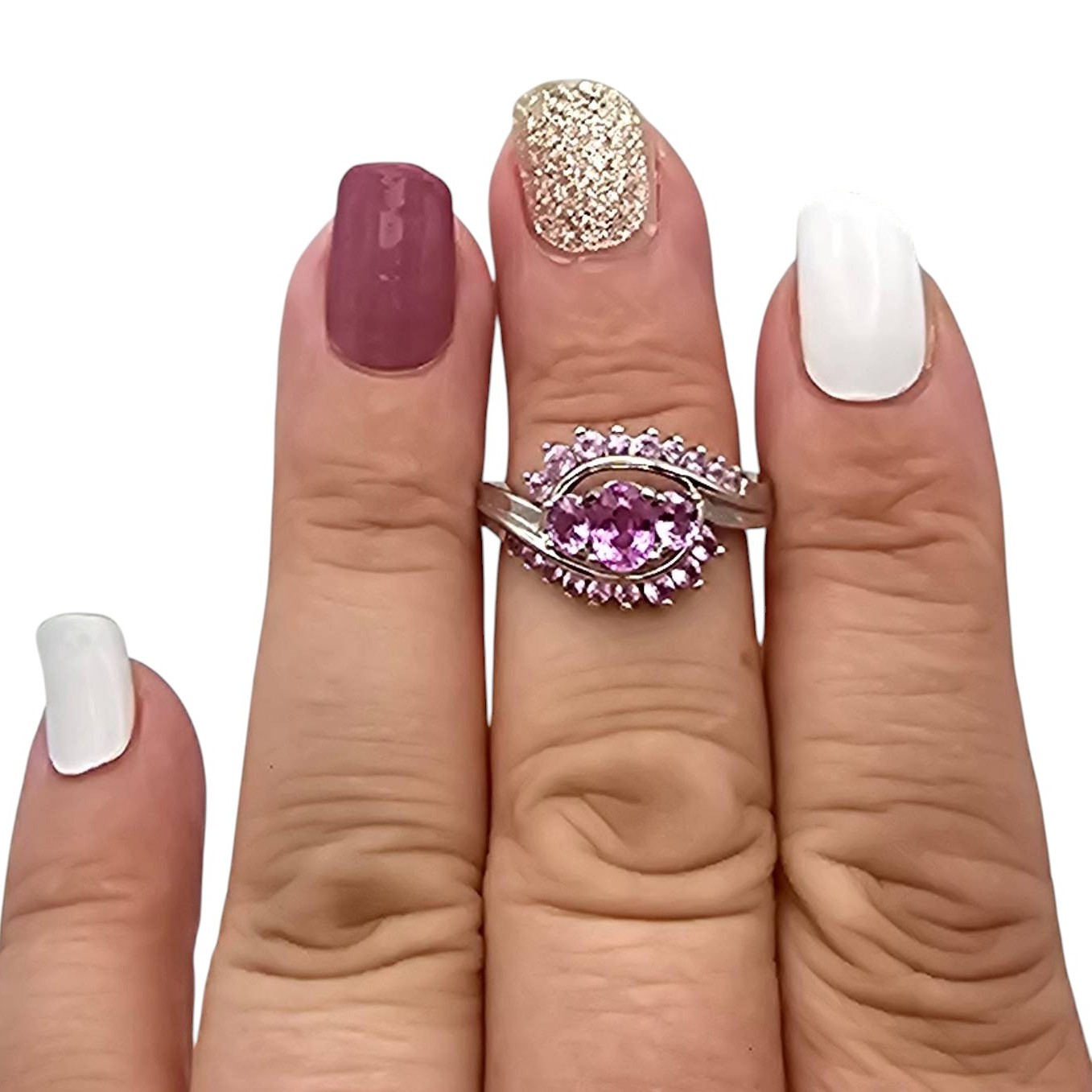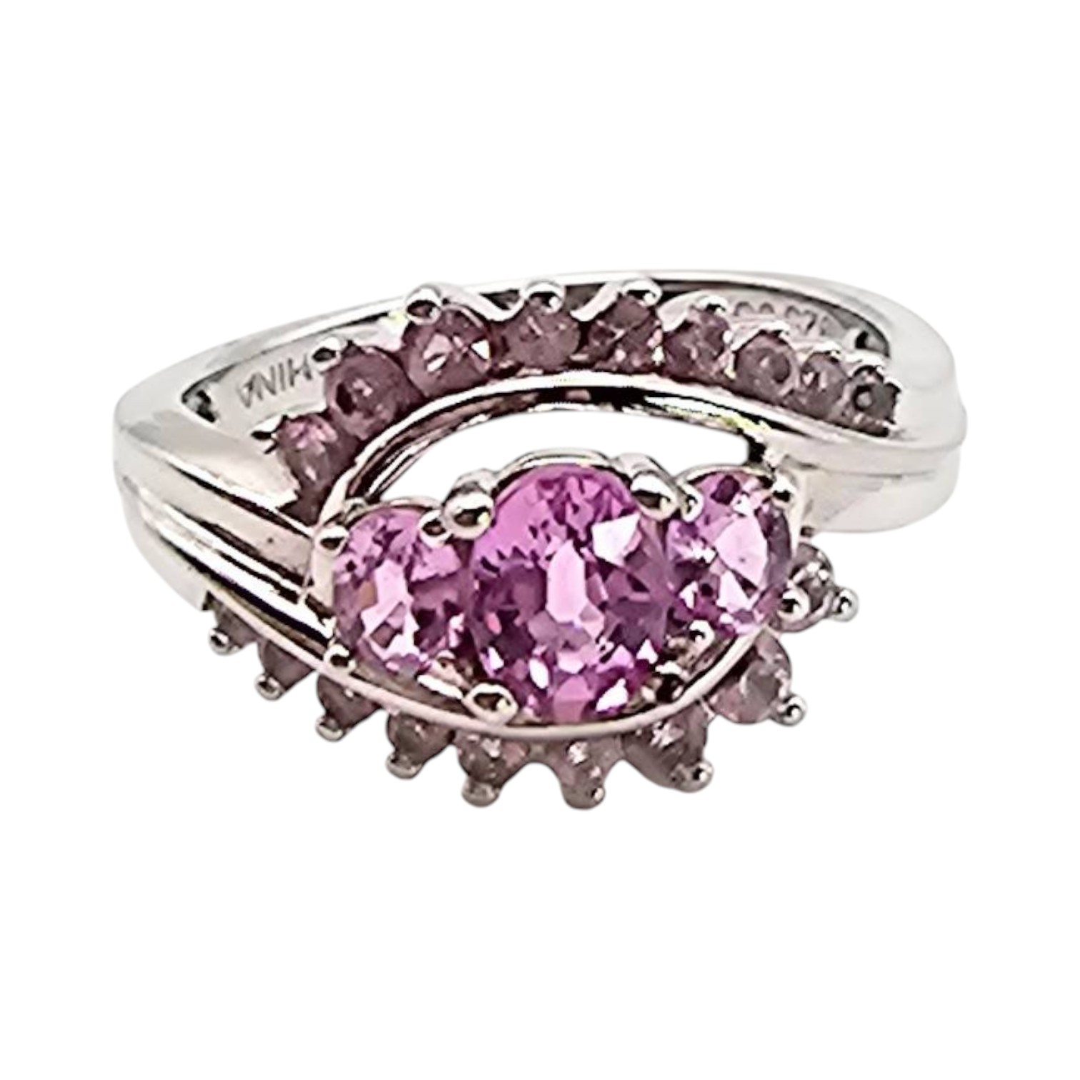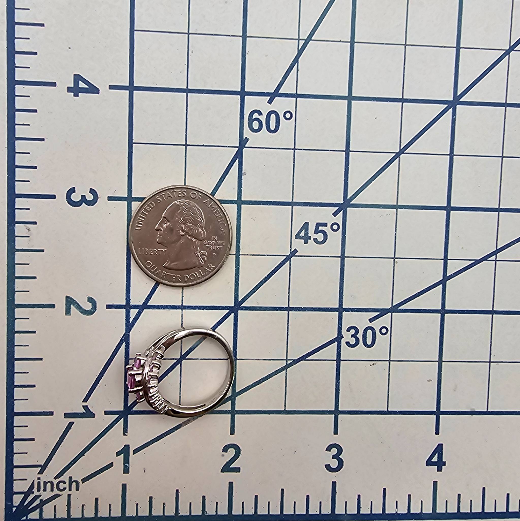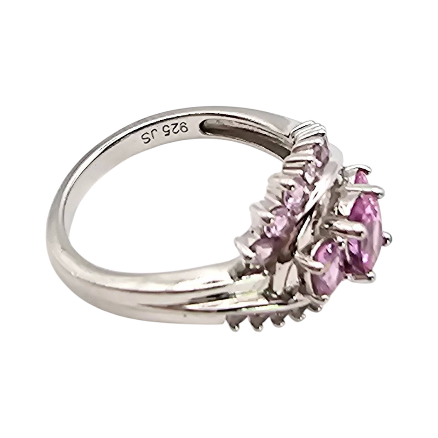 JS sterling silver ring featuring pink and white topaz stones in a multi-stone design. Weighs approximately 3.7 grams and is a size 6.75. Marked ‘925 JS’ on the inner band. Stylish and elegant accessory for any collection.