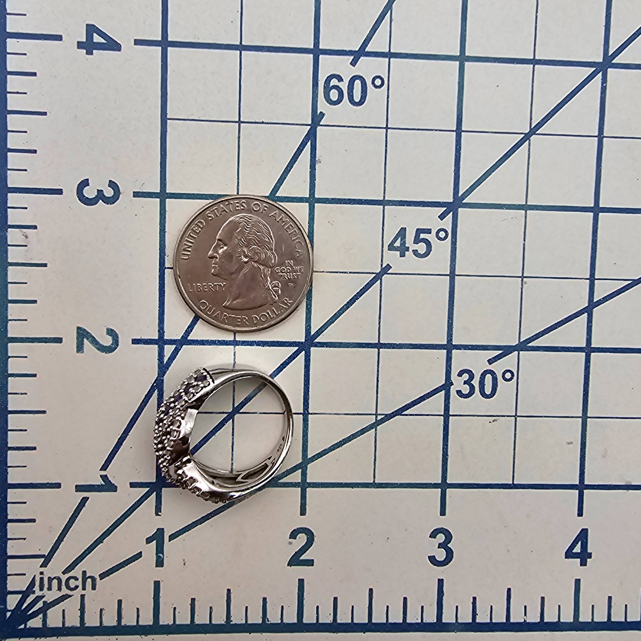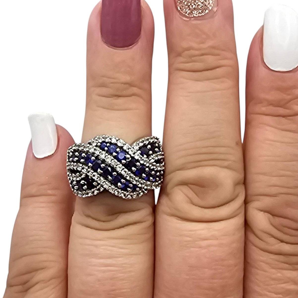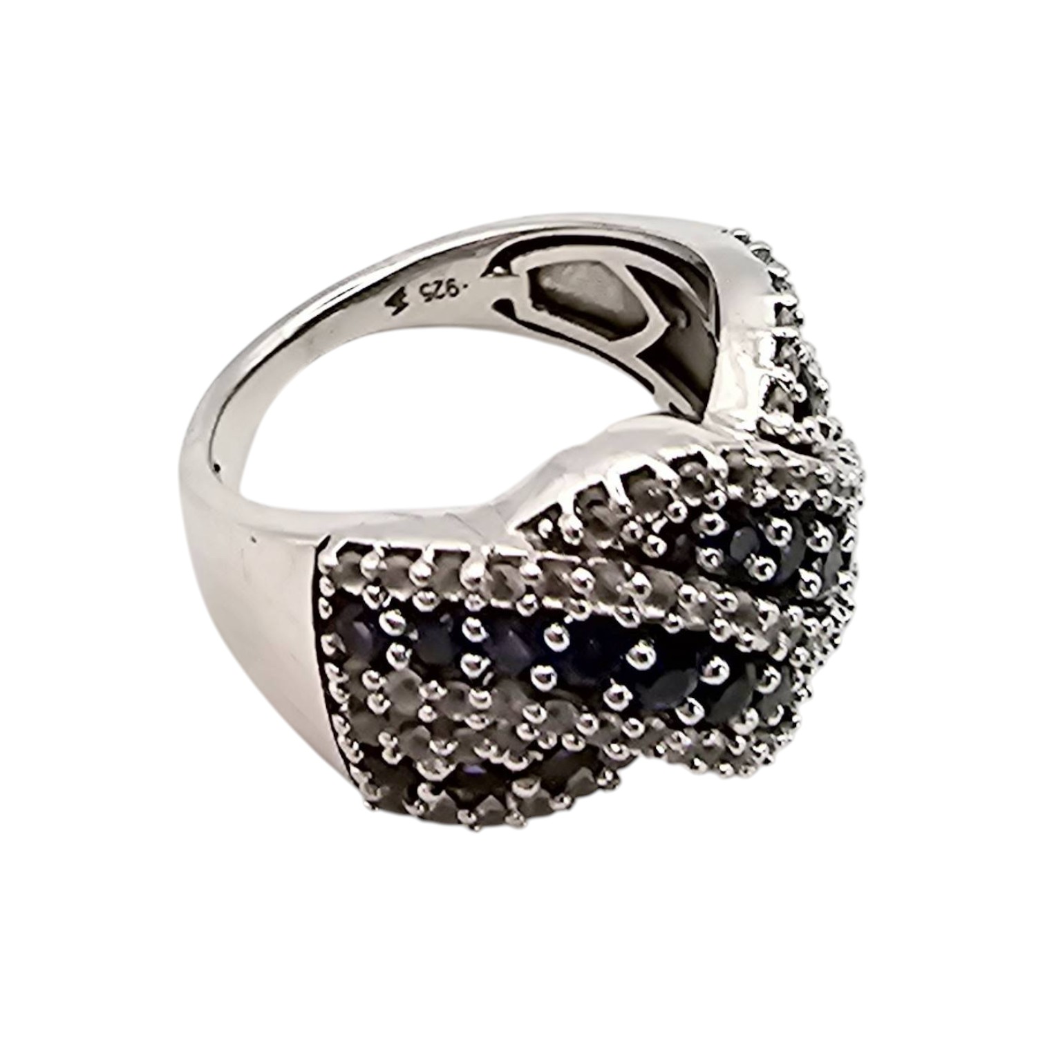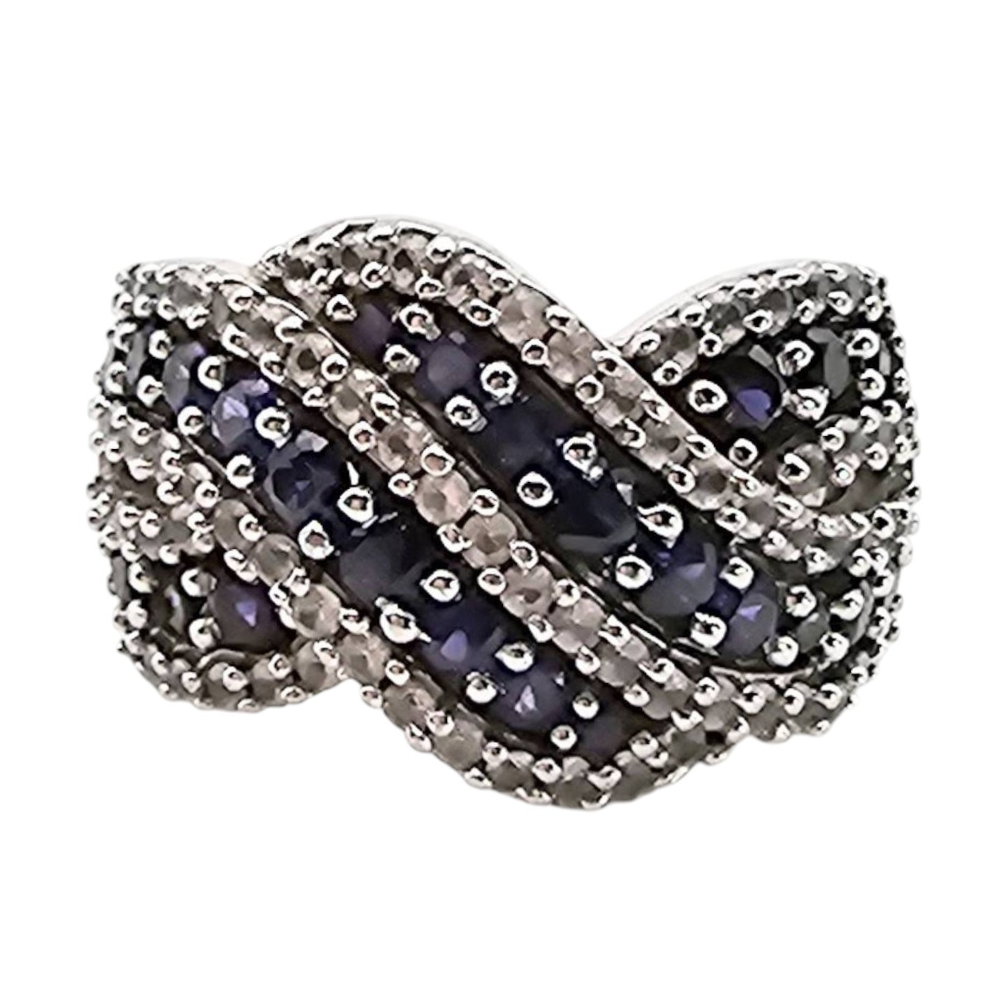 Sterling silver ring featuring an intertwined design with white and blue topaz stones. It is a size 6.75 and weighs approximately 7 grams. The piece shows detailed workmanship with faceted stones set in a textured silver band.