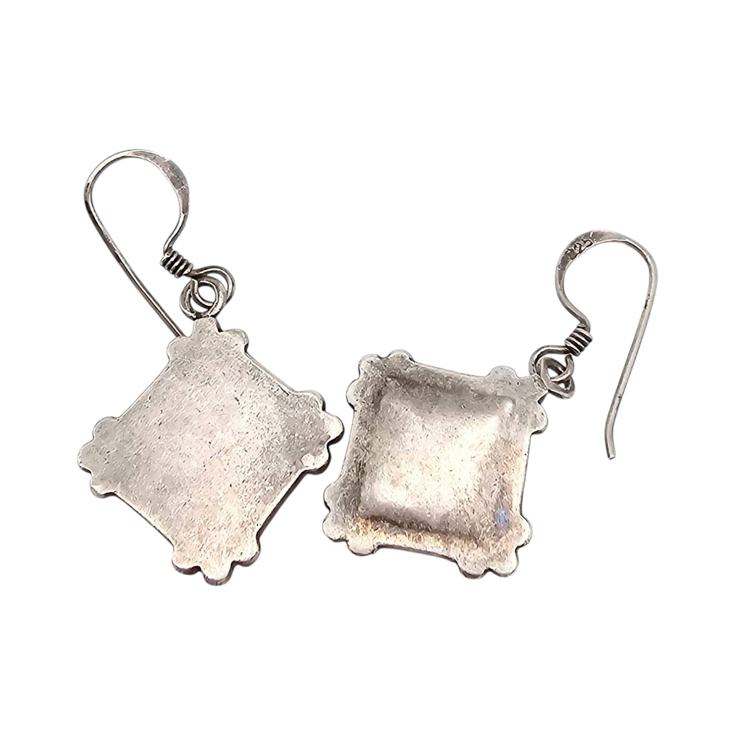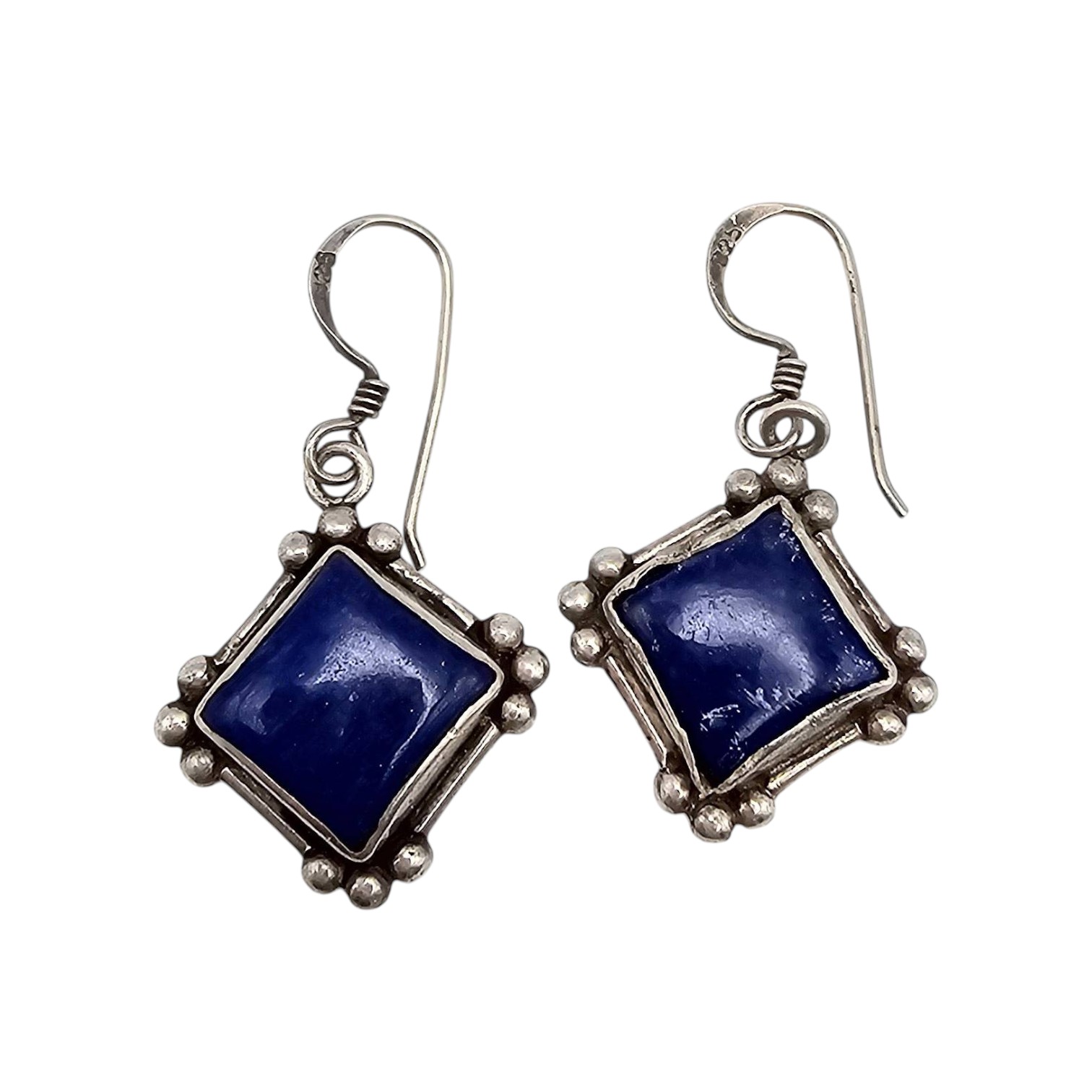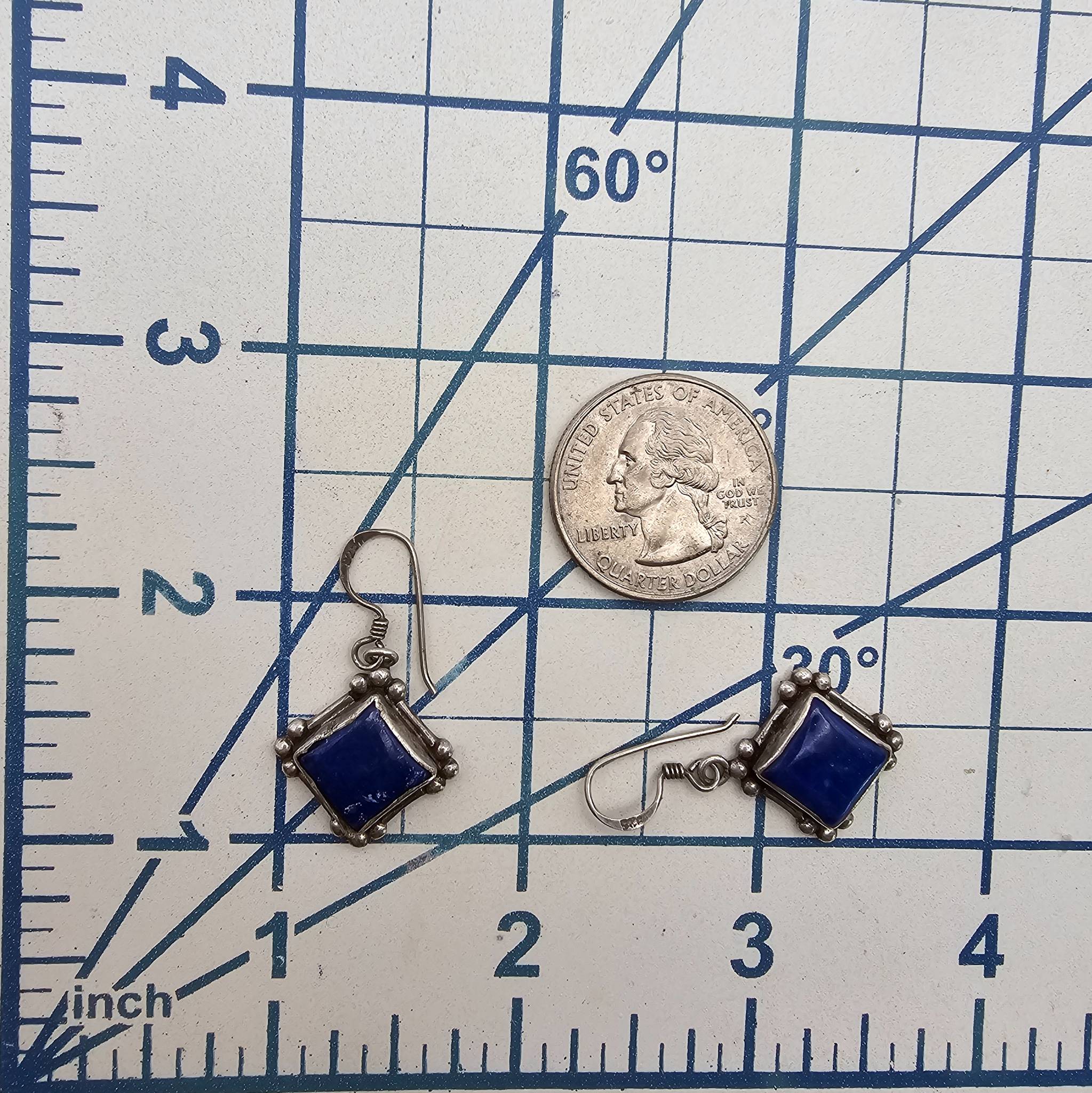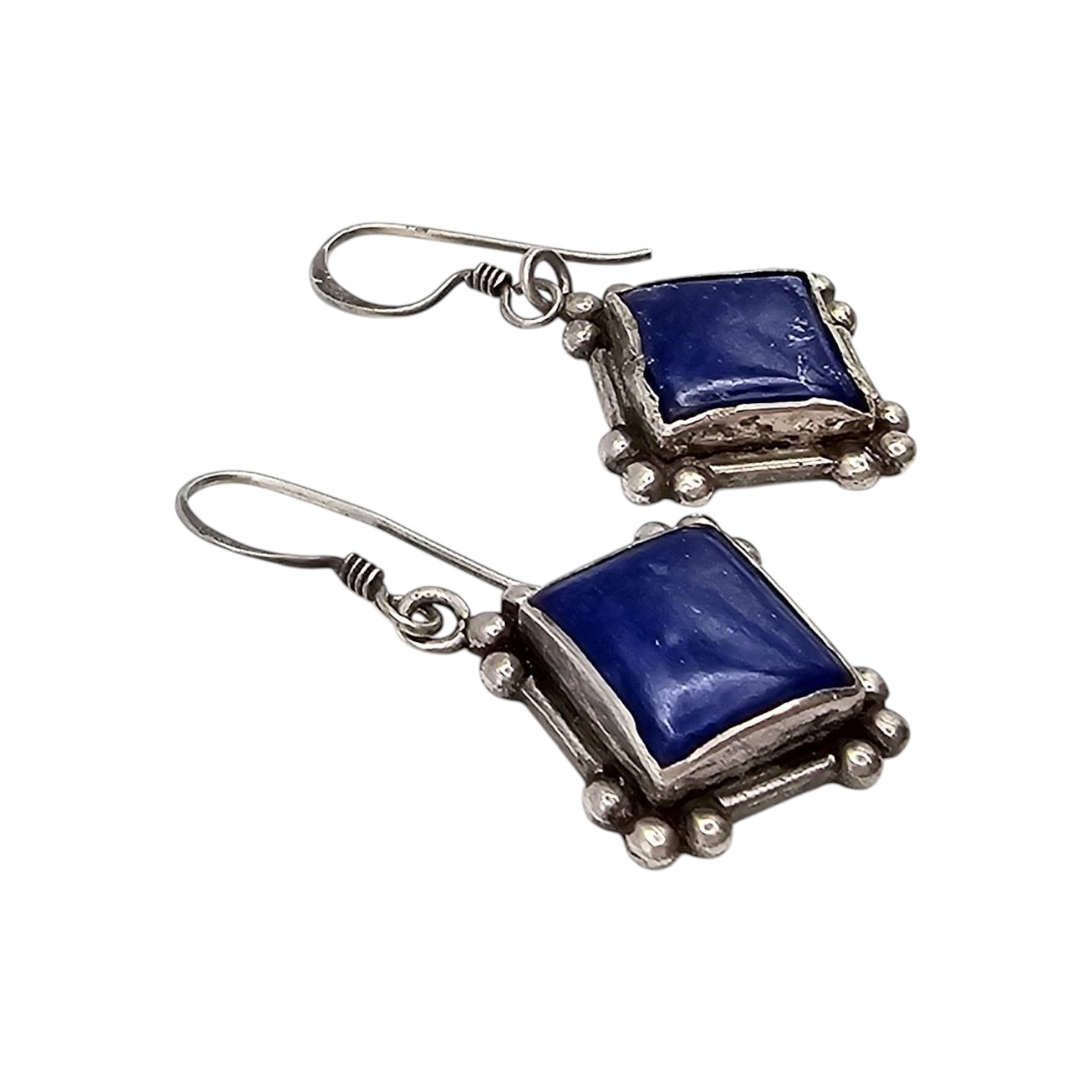 Sterling silver drop earrings featuring square lapis lazuli stones. The earrings measure approximately 6.2 grams in total weight. They showcase a dangling design with decorative silver accents surrounding the deep blue stones. Includes hooks for pierced ears, and are in good condition with minimal signs of wear.