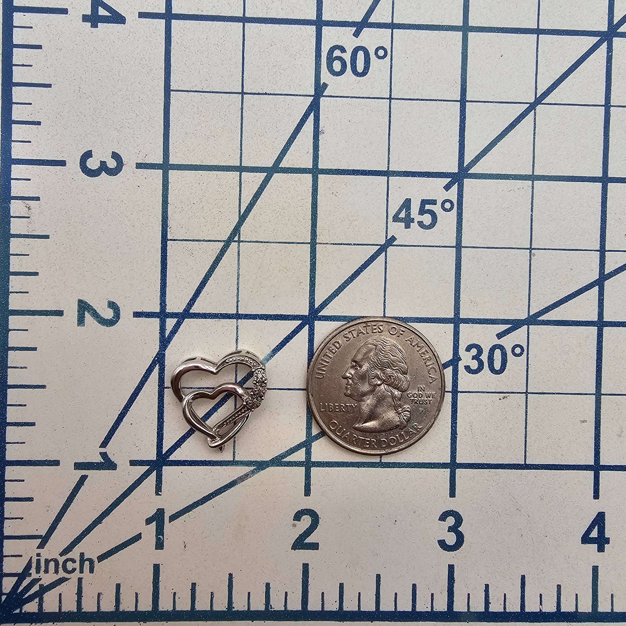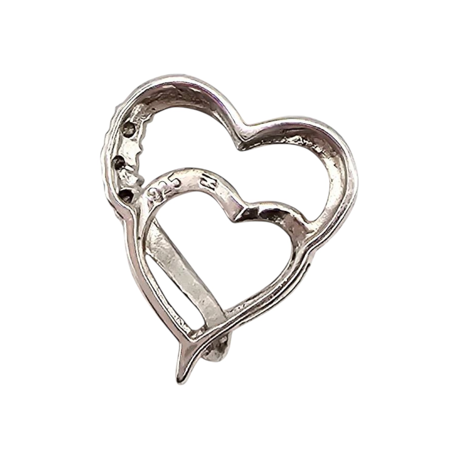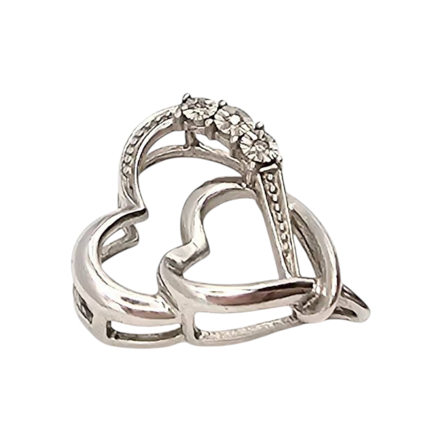 Sterling silver heart-shaped pendant marked ‘JJ 925’. Features a double-heart design adorned with small diamond accents on one side. Weighs approximately 1.4 grams. Measures slightly larger than a quarter, as shown for scale. Suitable for adding to a necklace or other jewelry piece.
