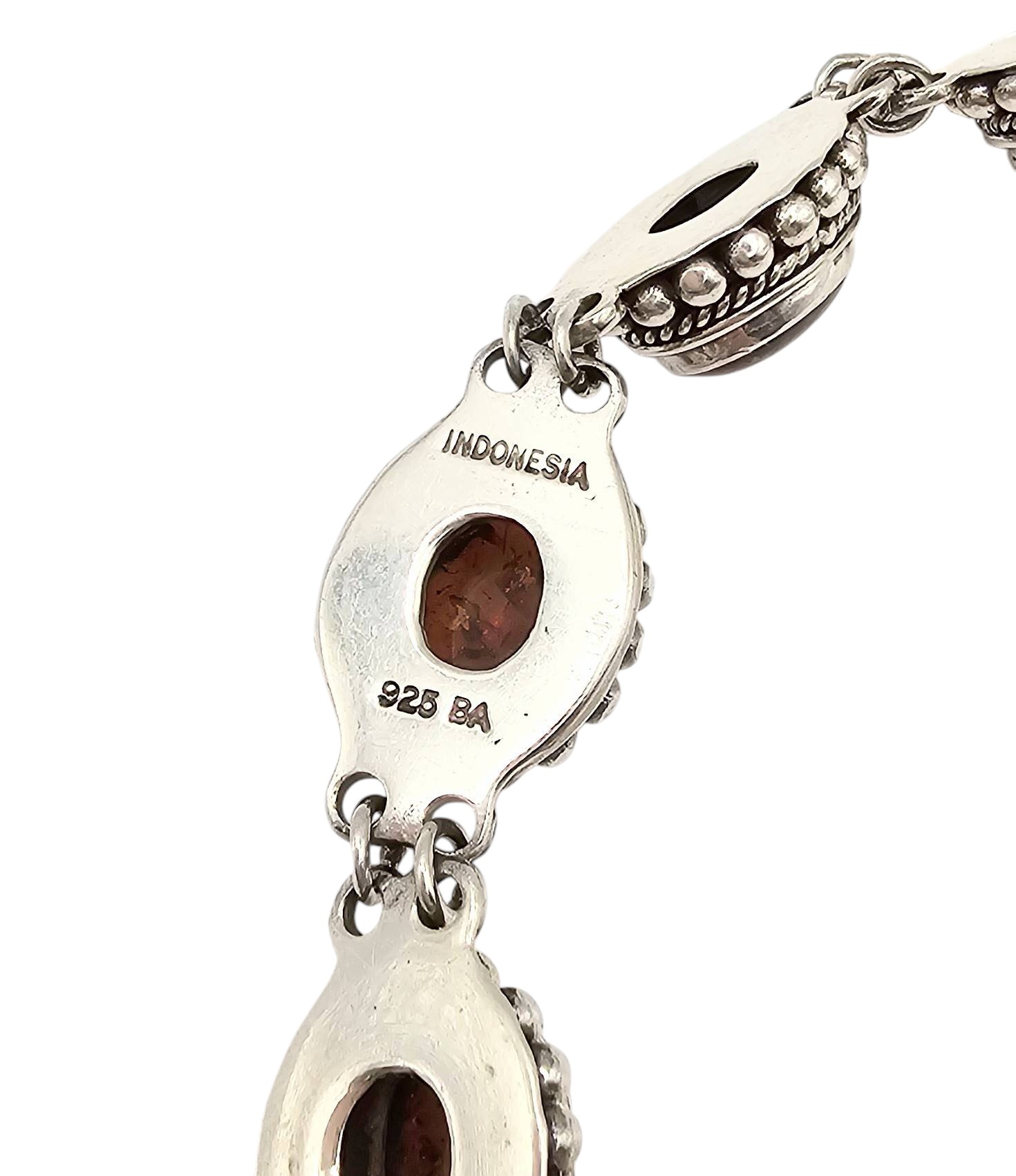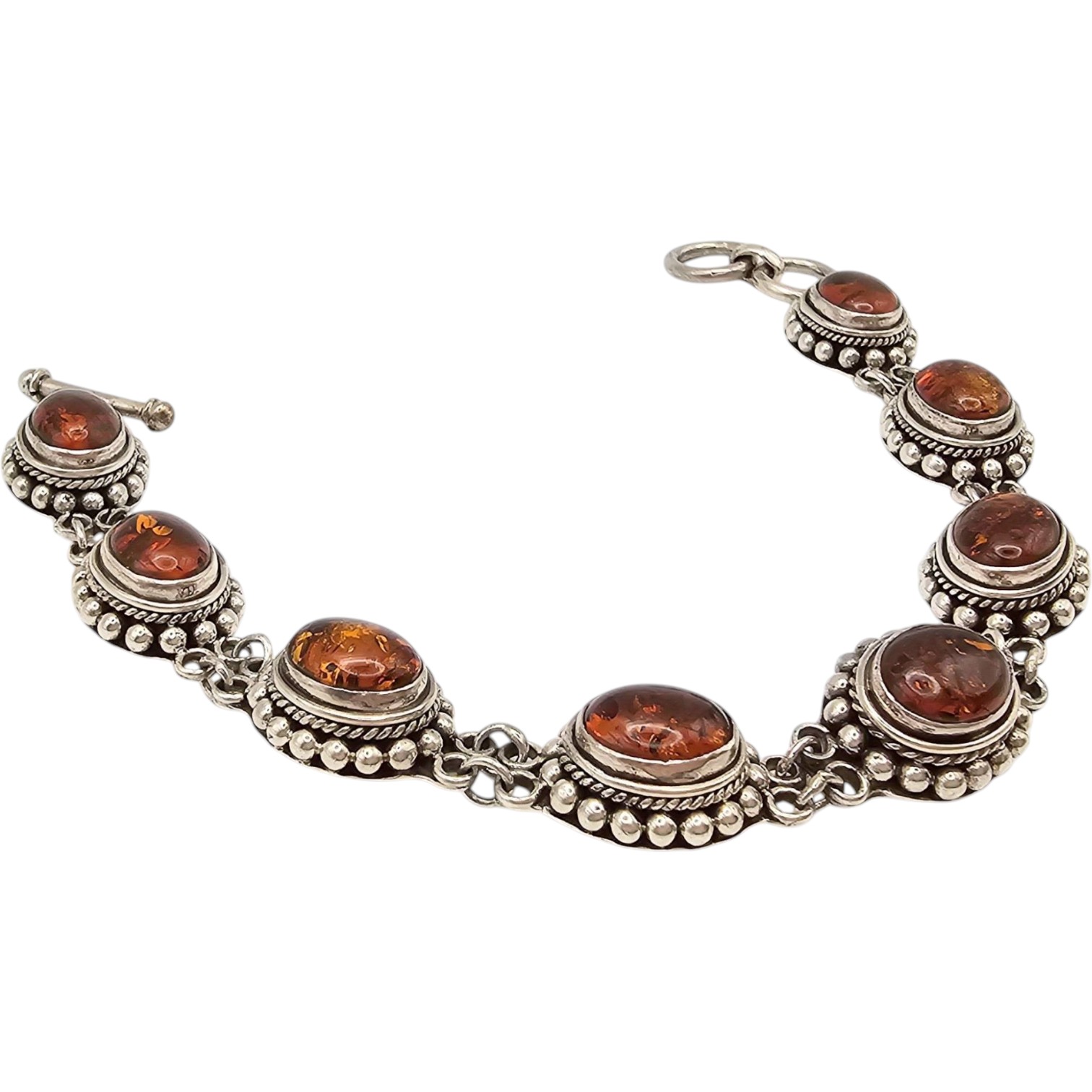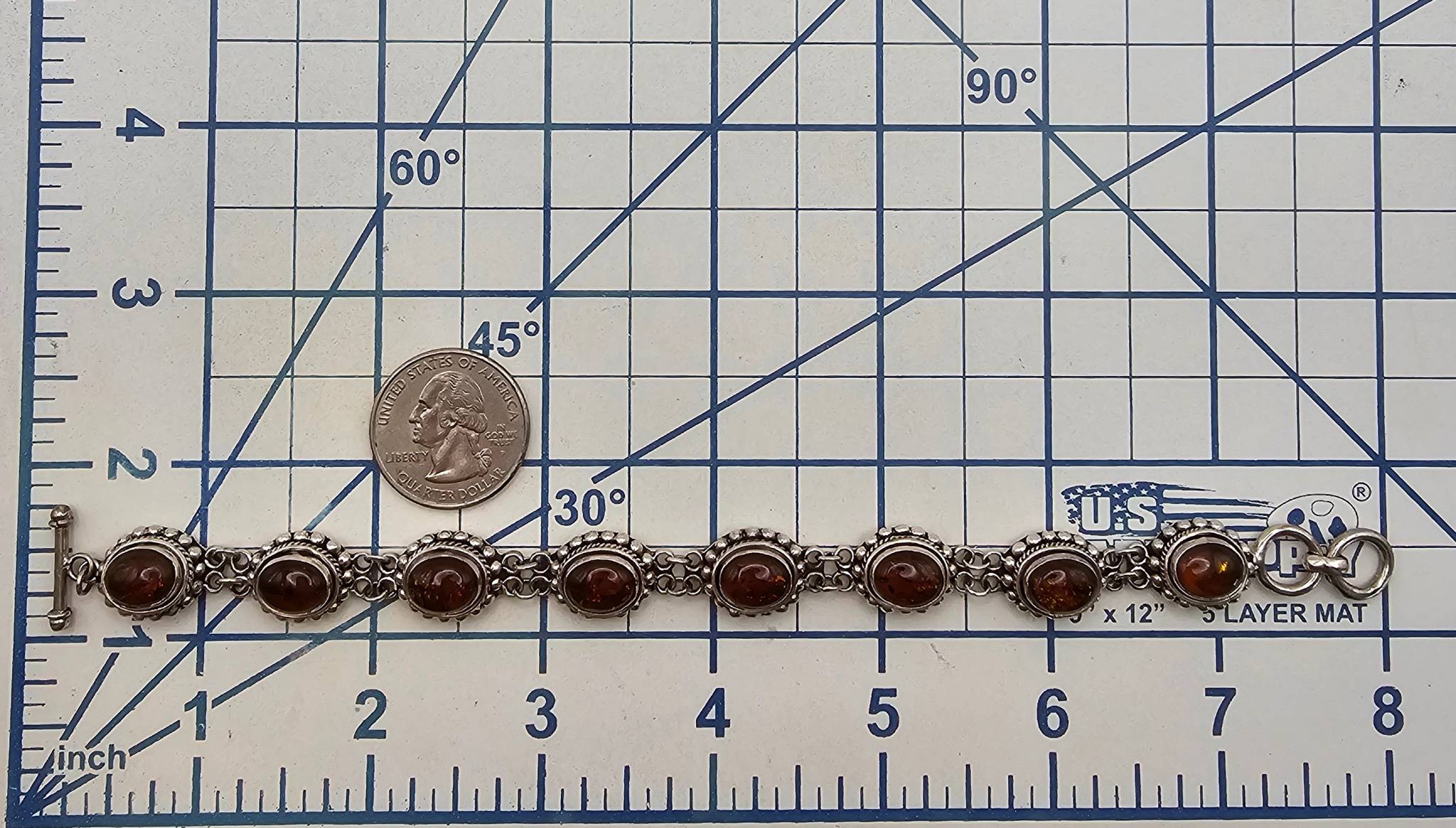 Sterling silver bracelet featuring oval amber cabochons, stamped with ‘INDONESIA 925 BA’. The bracelet has a toggle clasp and is intricately designed with a total weight of 33 grams. Each amber cabochon is encased in decorative sterling silver settings, connected by chain links.