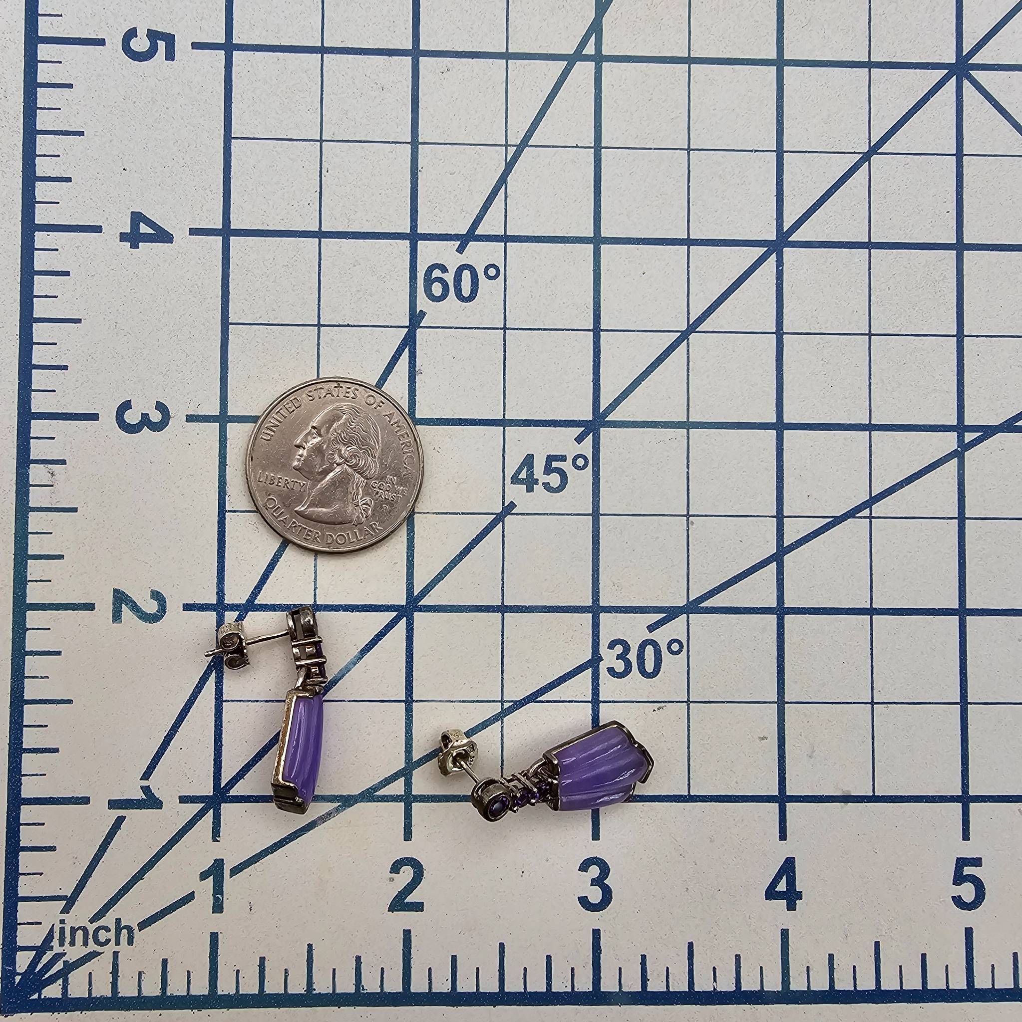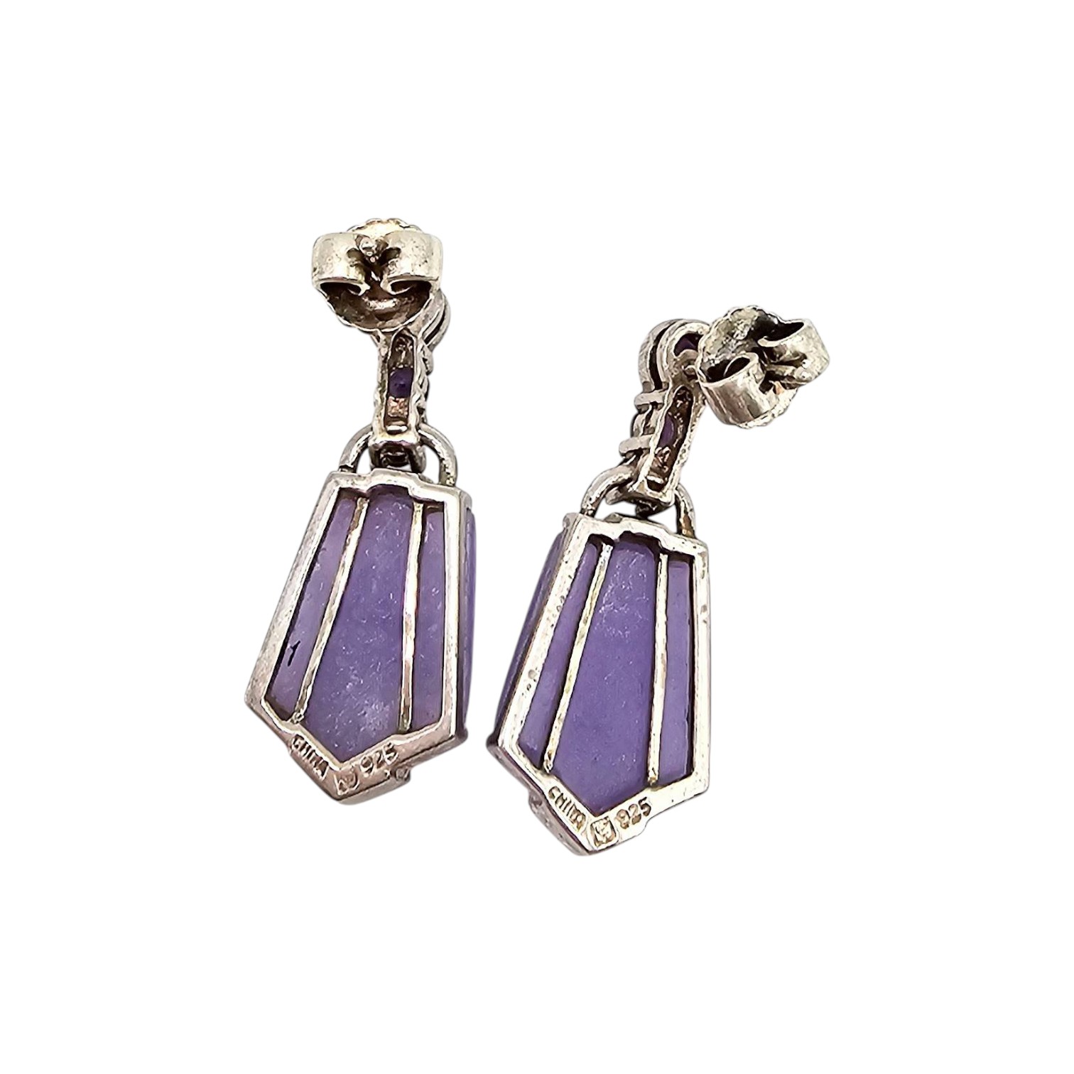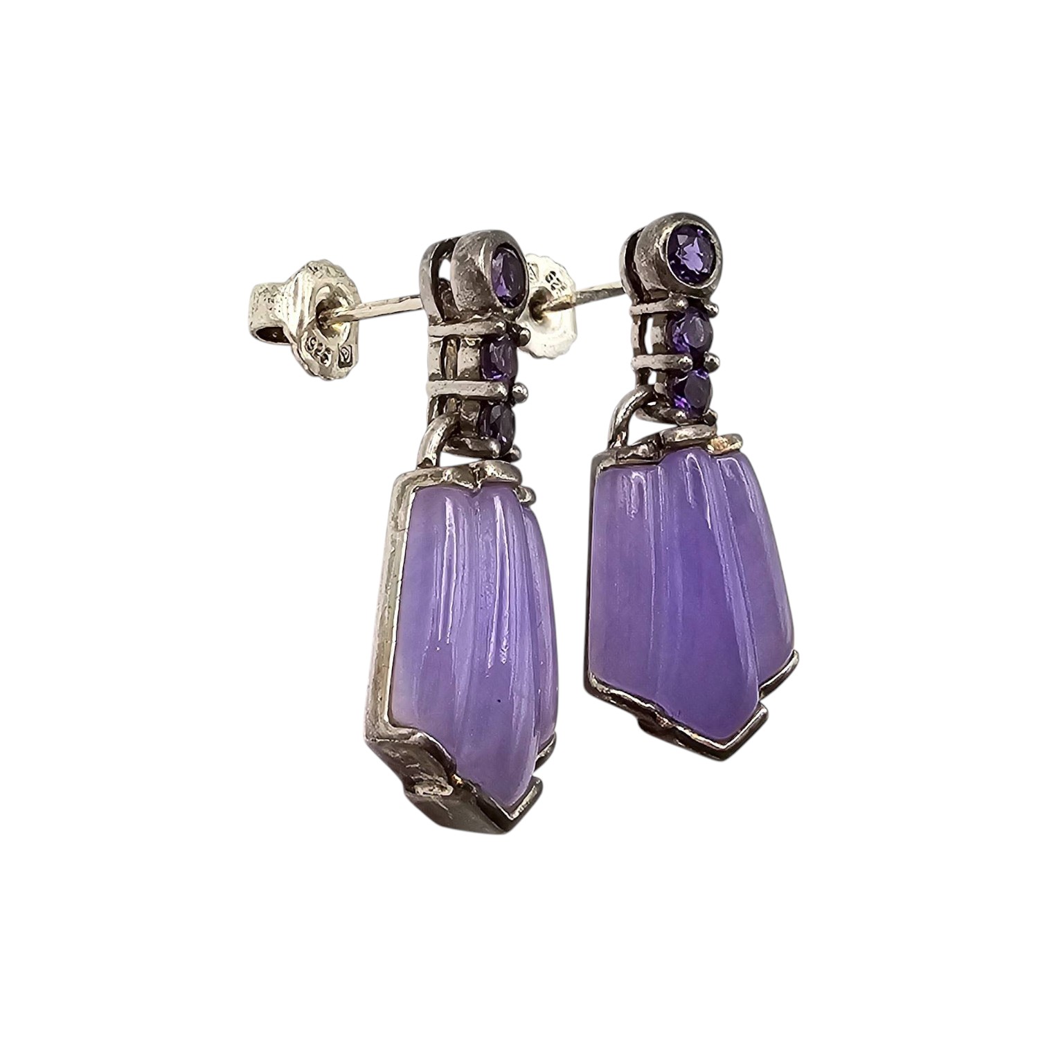 Sterling silver dangle earrings featuring amethyst and jade stones. The earrings showcase a geometric design with a polished finish. Total weight is approximately 5.5g. Comes as a pair, suitable for pierced ears.