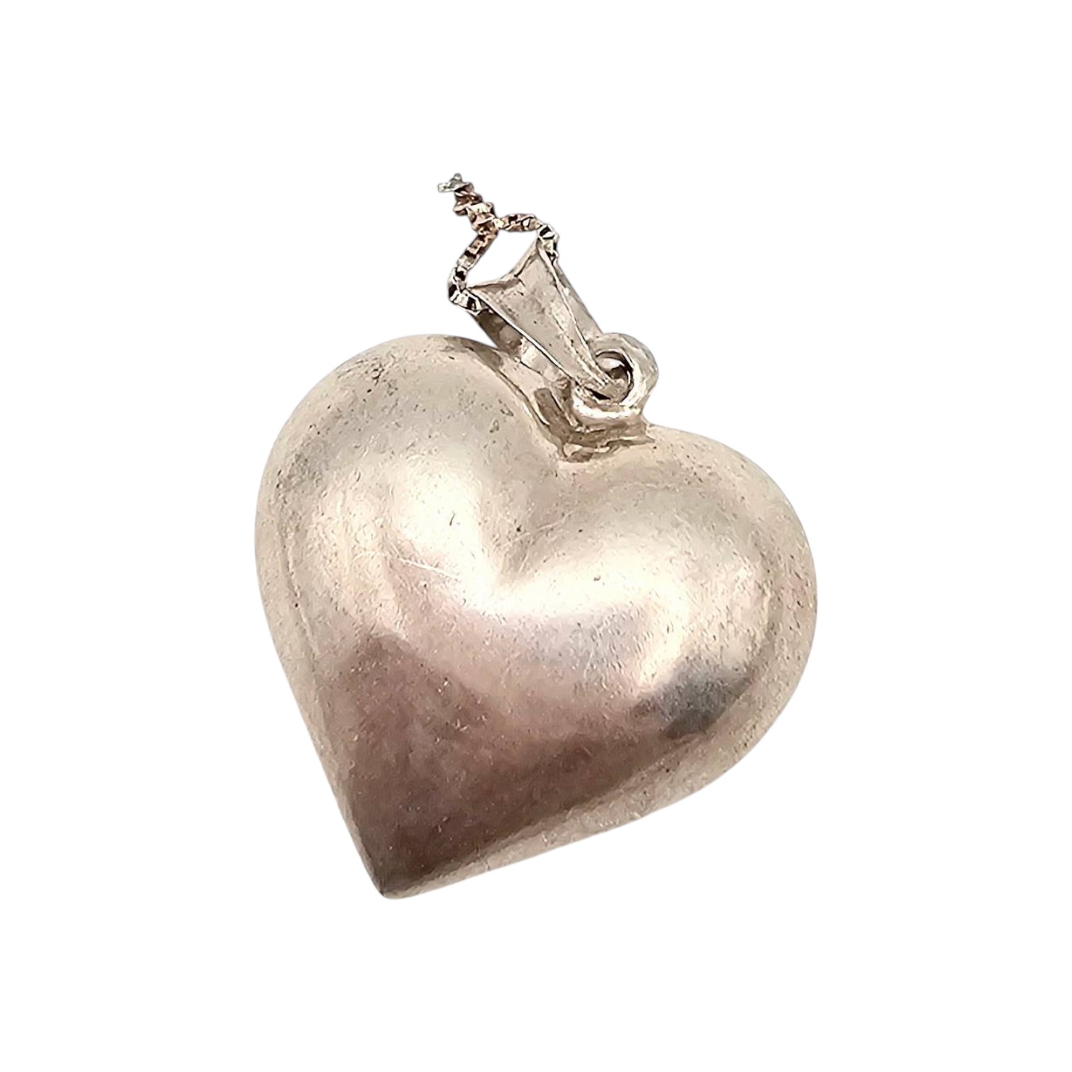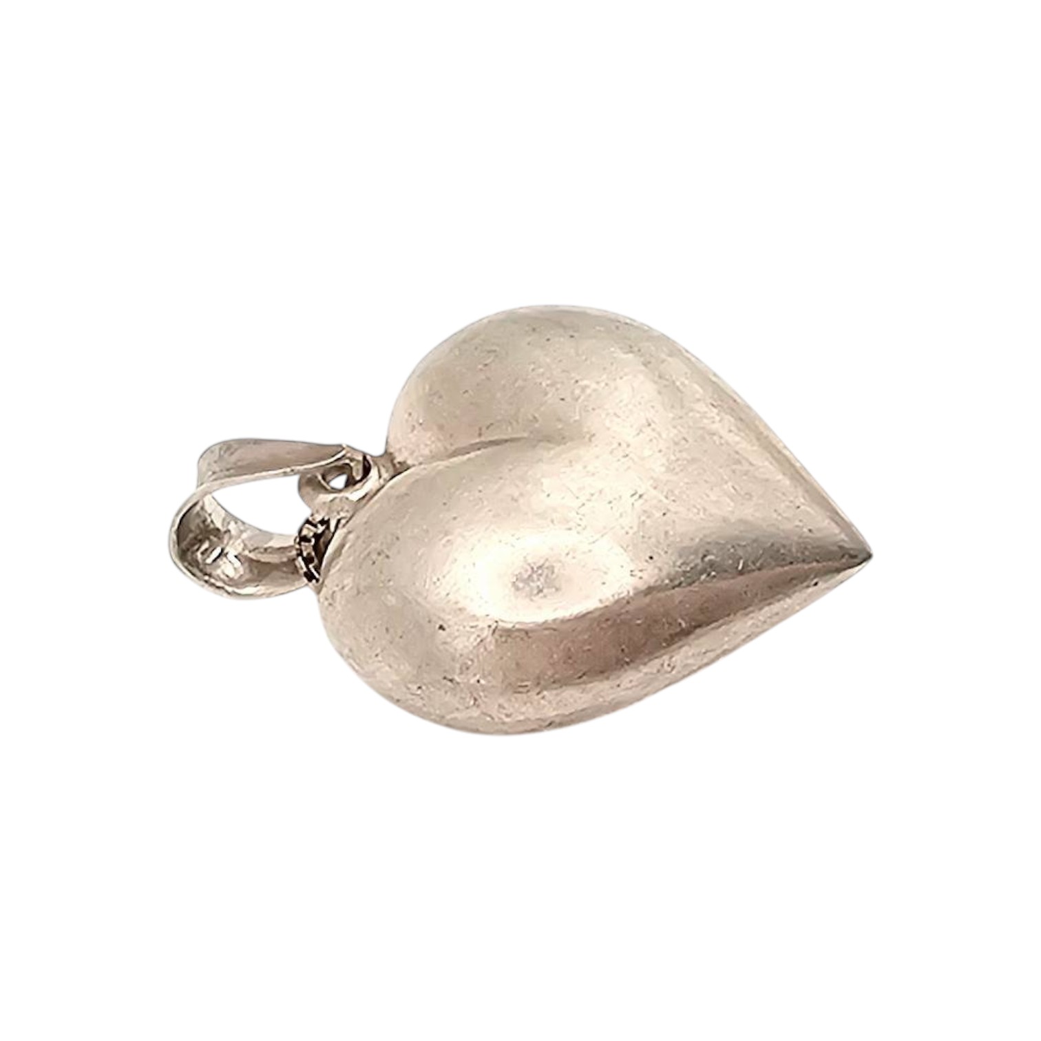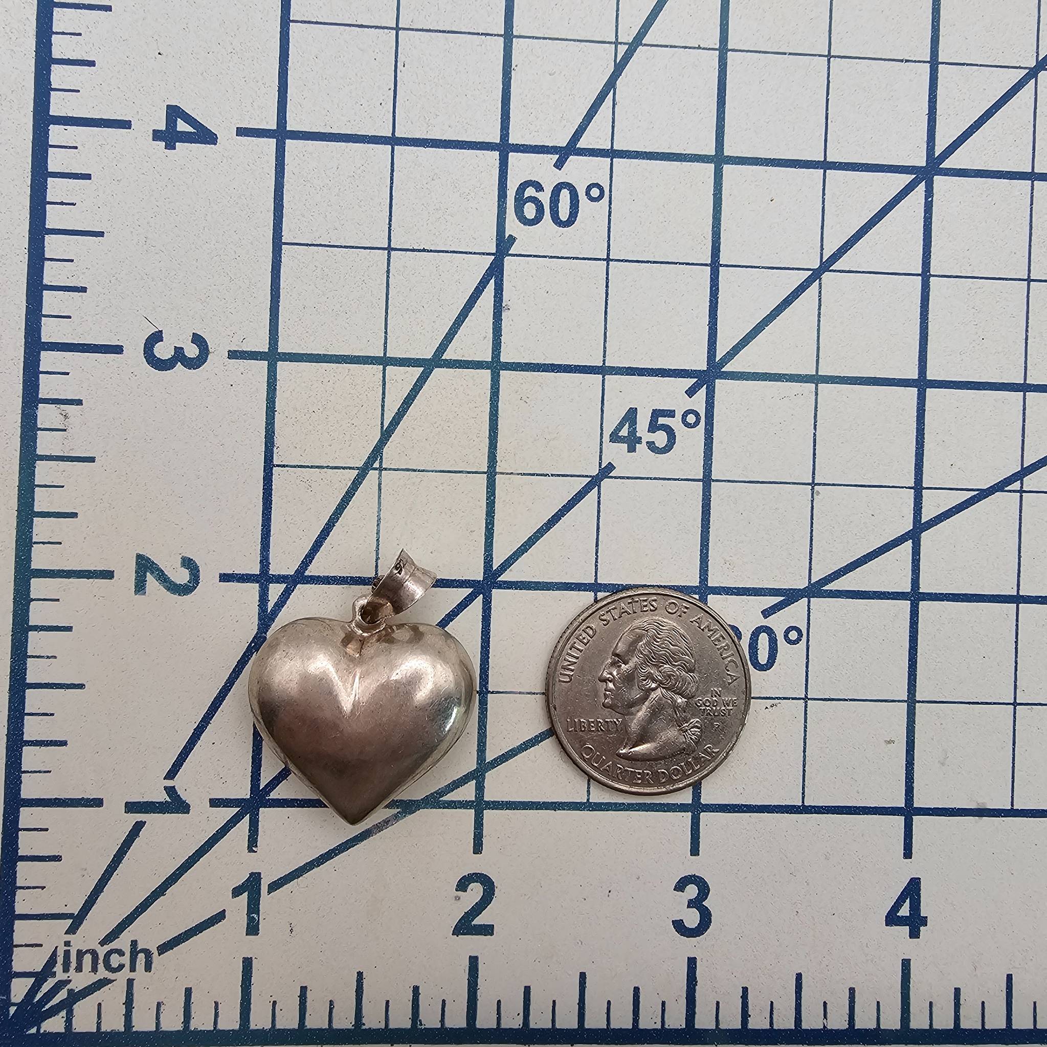 Sterling silver hollow-form heart-shaped pendant marked ‘JA 925.’ Weighs approximately 4.8 grams. Features a decorative bail for attachment. Measures about 1 inch in diameter (refer to measuring grid for dimensions). Overall condition is consistent with normal wear for silver items.