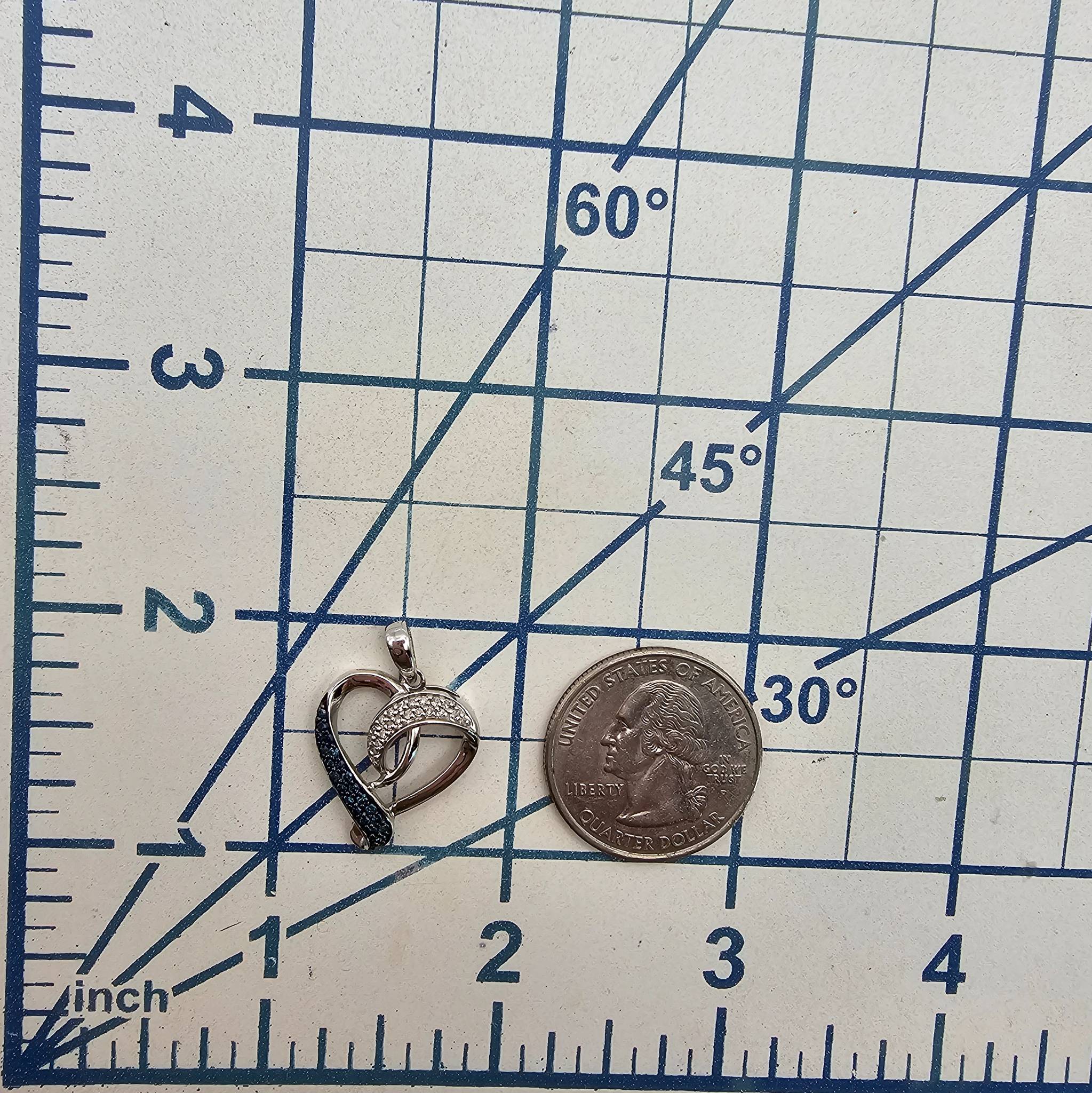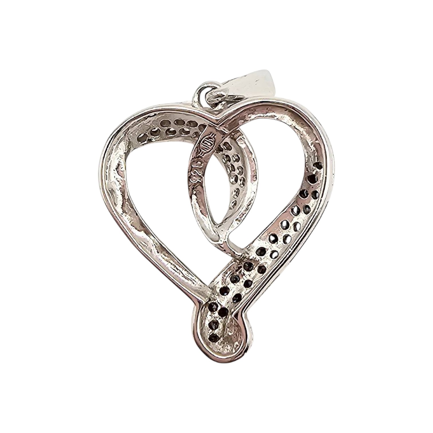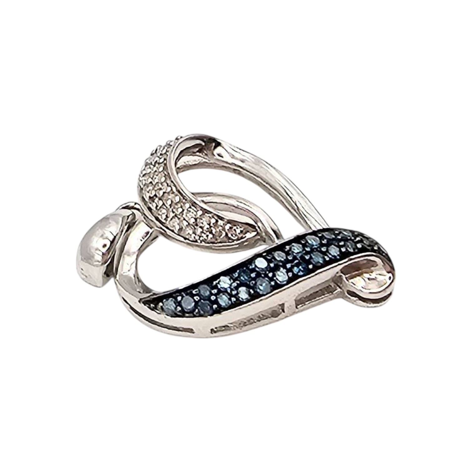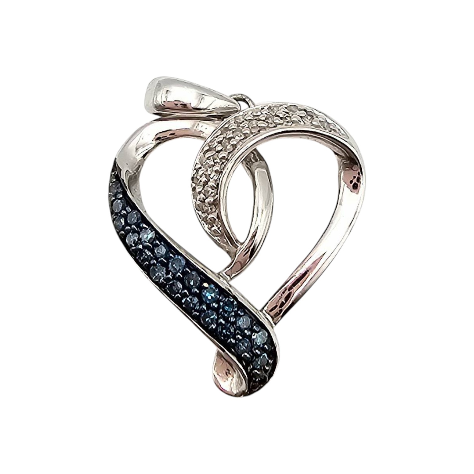 Sterling silver heart-shaped pendant adorned with blue and white diamonds. Weighs approximately 2.2 grams. The interwoven heart design features a polished finish, with one side set with blue stones and the other with white stones. Includes bail for attachment to a chain (chain not included).