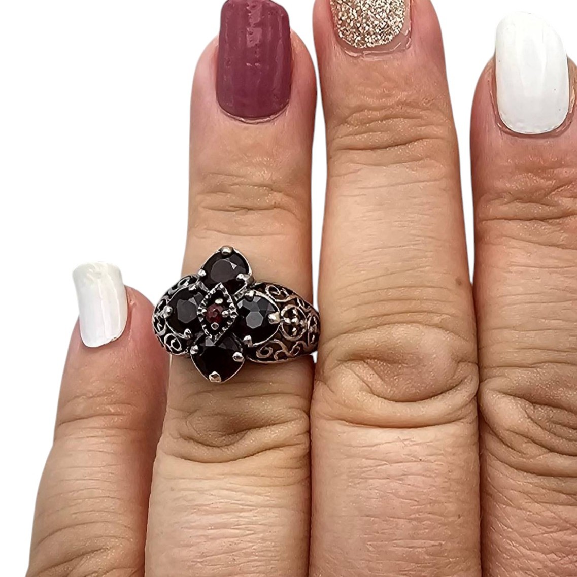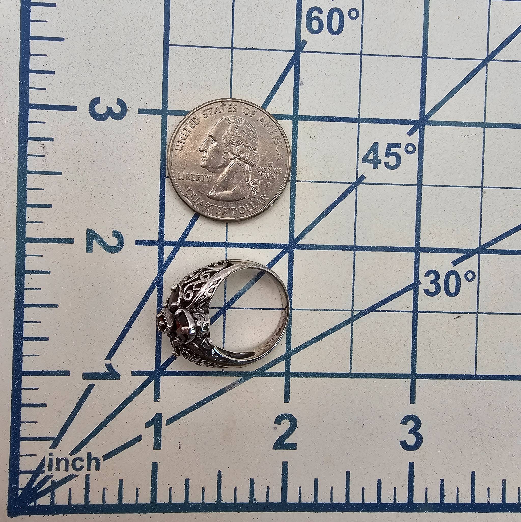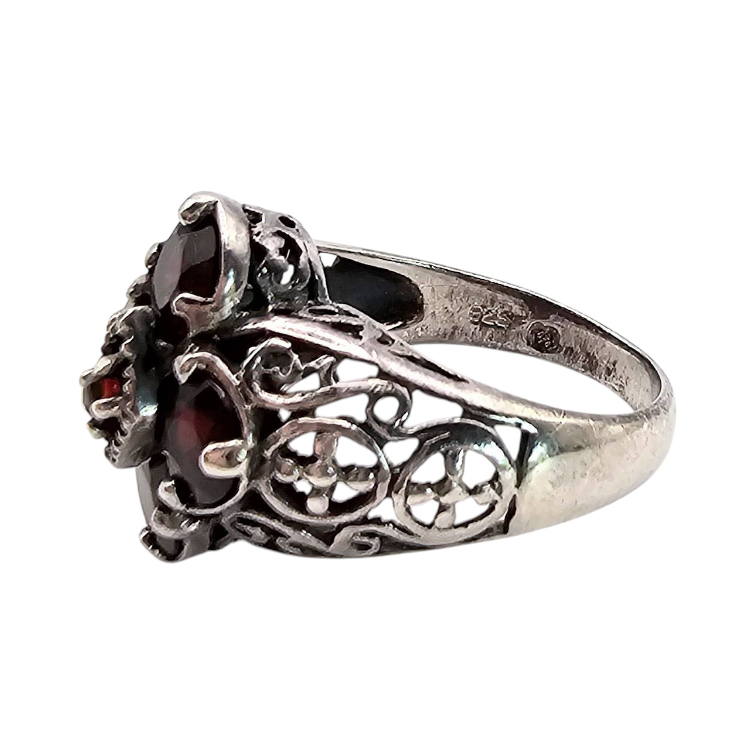 Sterling silver ring featuring a red rhinestone arrangement in an elegant floral-inspired design. The decorative filigree band adds intricate detail to the piece. The ring is marked 925 and weighs 4.1 grams with a size of 5.75. Ideal for collectors or as a statement accessory.