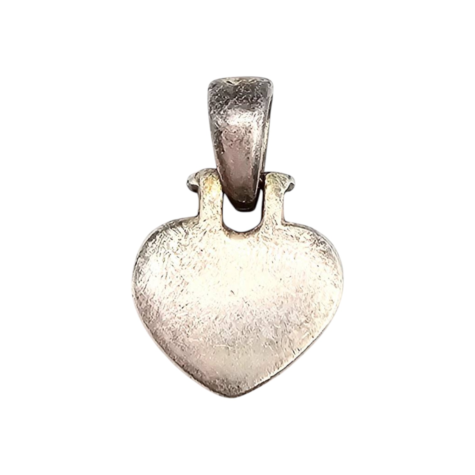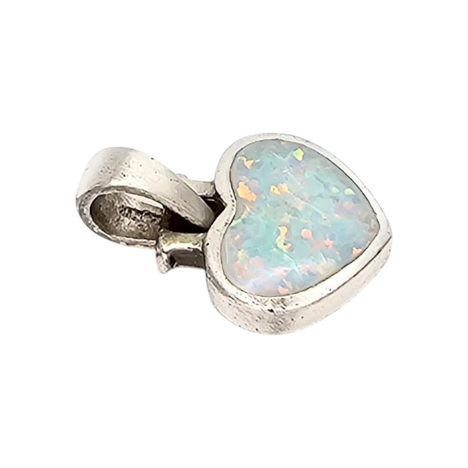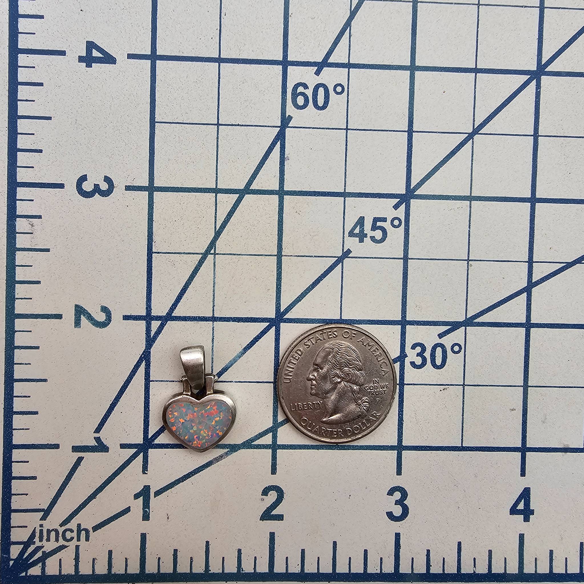 Sterling silver pendant featuring a heart-shaped opal stone. The pendant is stamped 925 to indicate sterling silver composition and weighs 3.4 grams. The opal displays a beautiful play of color. Approximate dimensions can be inferred from the measuring grid and coin for scale.