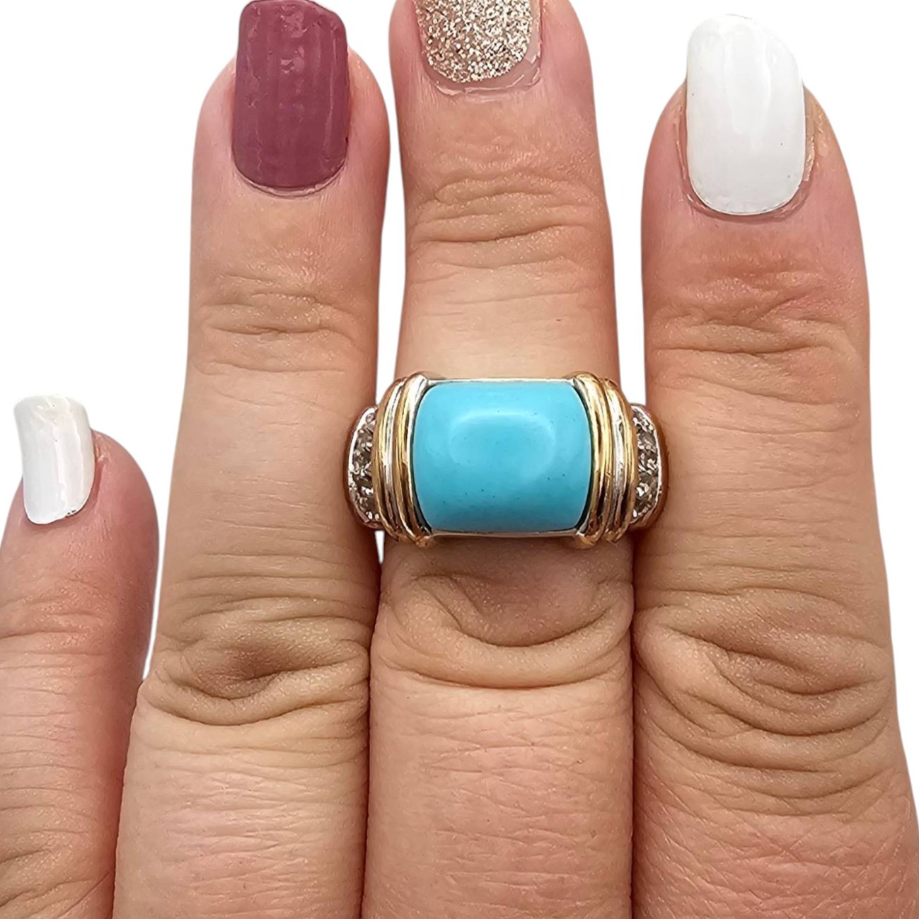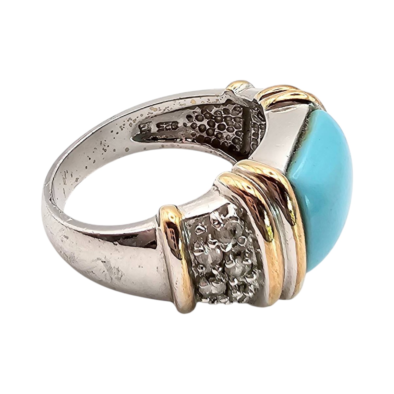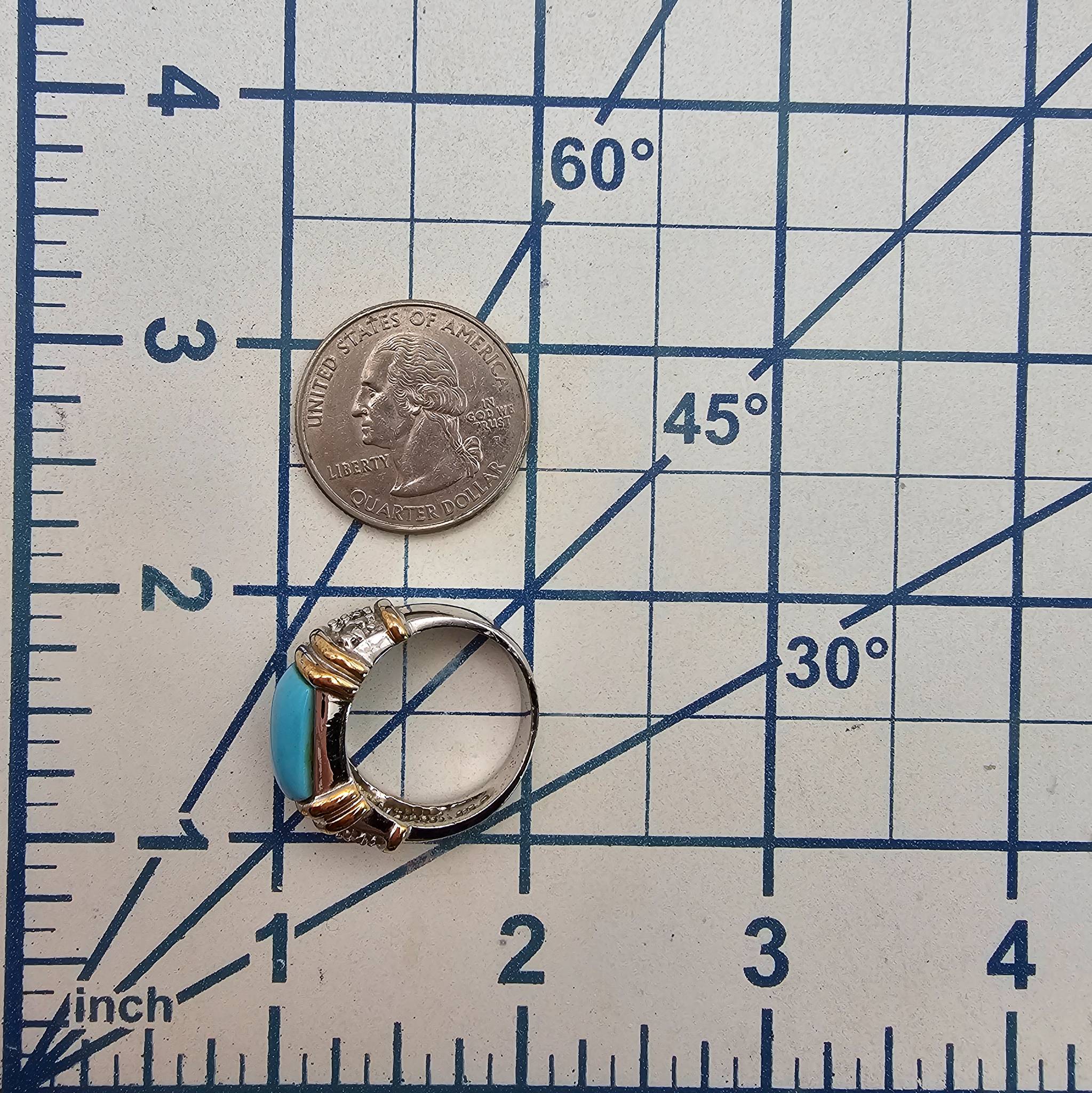 Sterling silver ring featuring a vibrant turquoise stone centerpiece, accented by clear stones on either side. The ring showcases an elegant combination of silver and gold-tone detailing. It weighs approximately 7.8 grams and is a size 8.25.