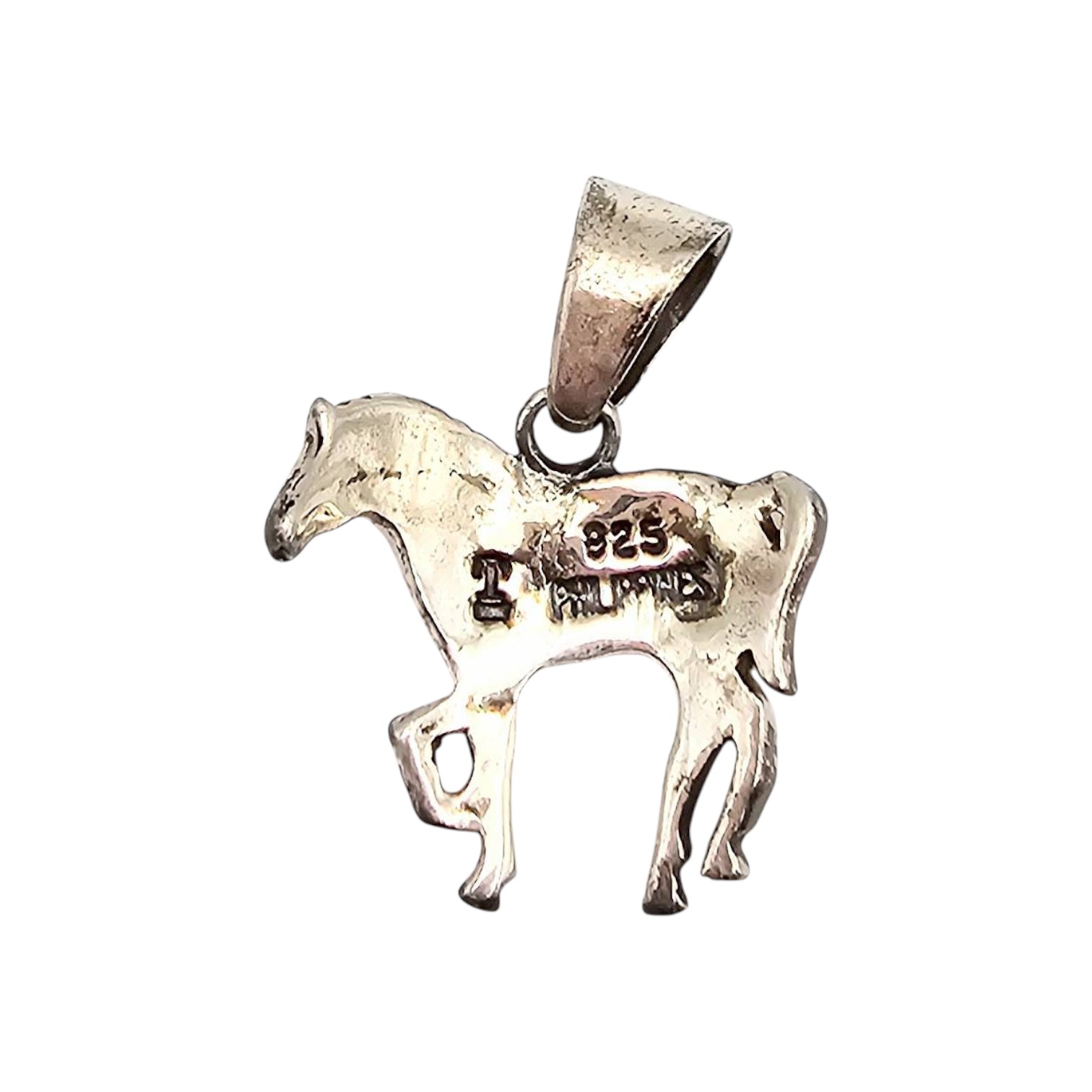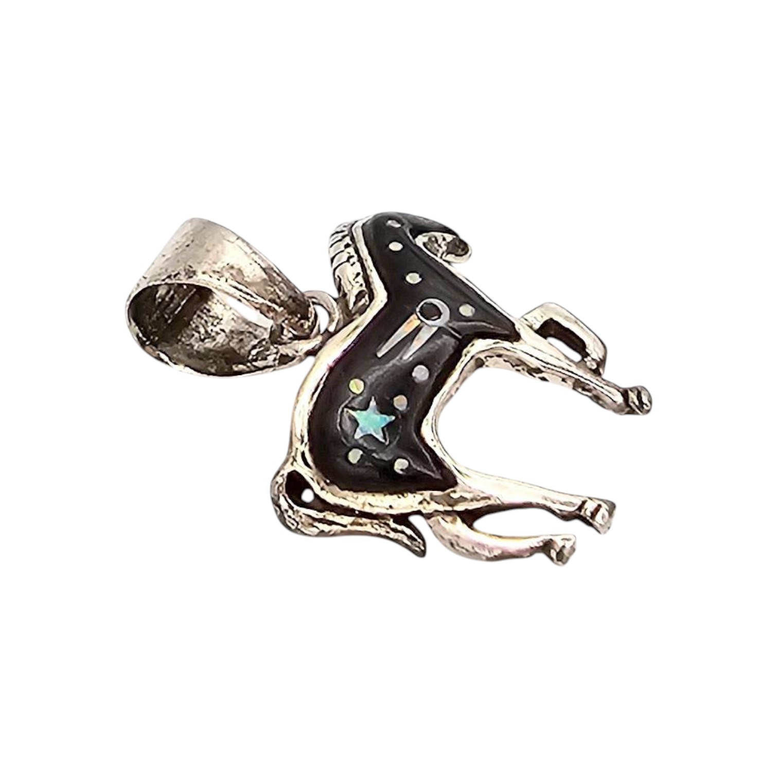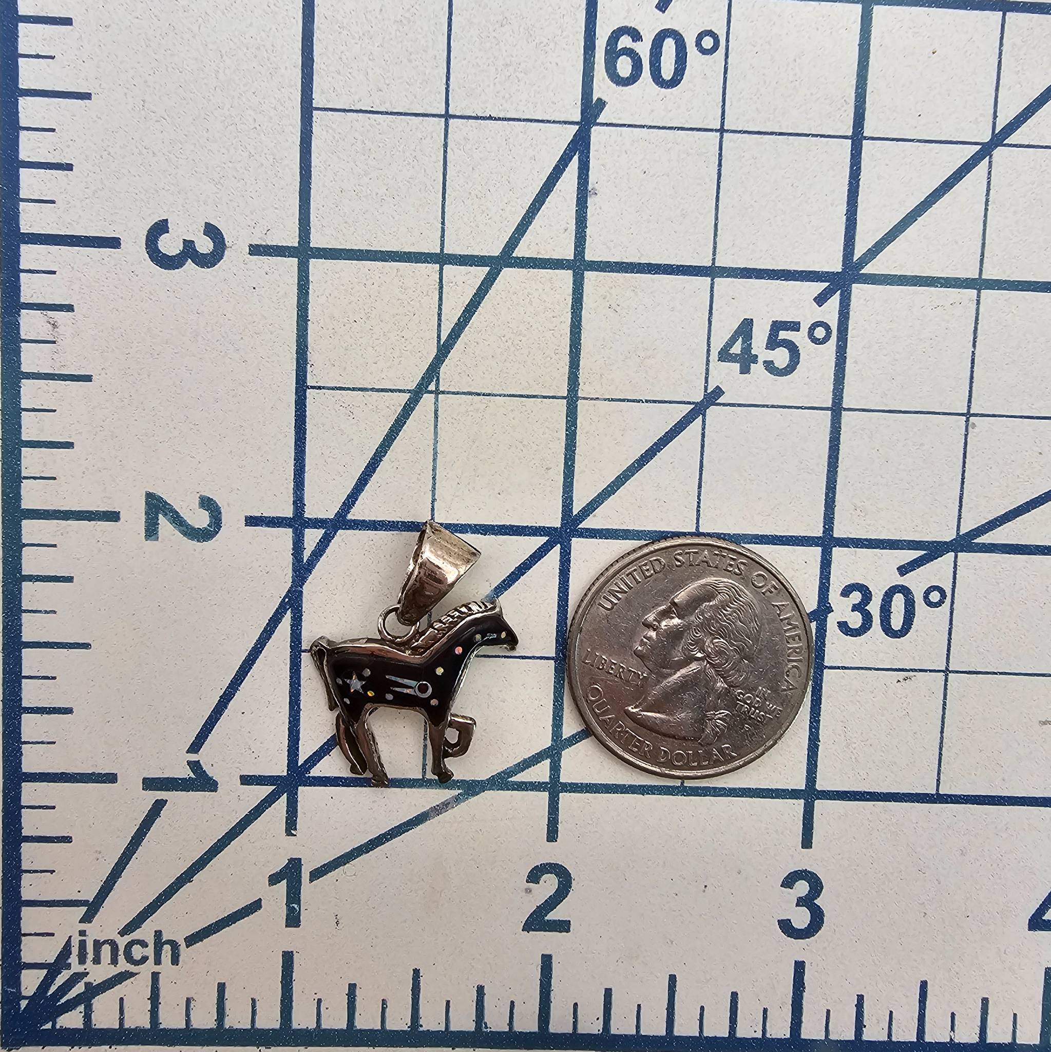 Sterling silver horse-shaped pendant weighing 2.2 grams with a marked 925 stamp. The design includes multi-stone inlay featuring star, moon, and dot patterns to create a decorative appearance. Includes a textured bail for chain attachment. Approximate dimensions visible but not specified. Suitable for use as jewelry.