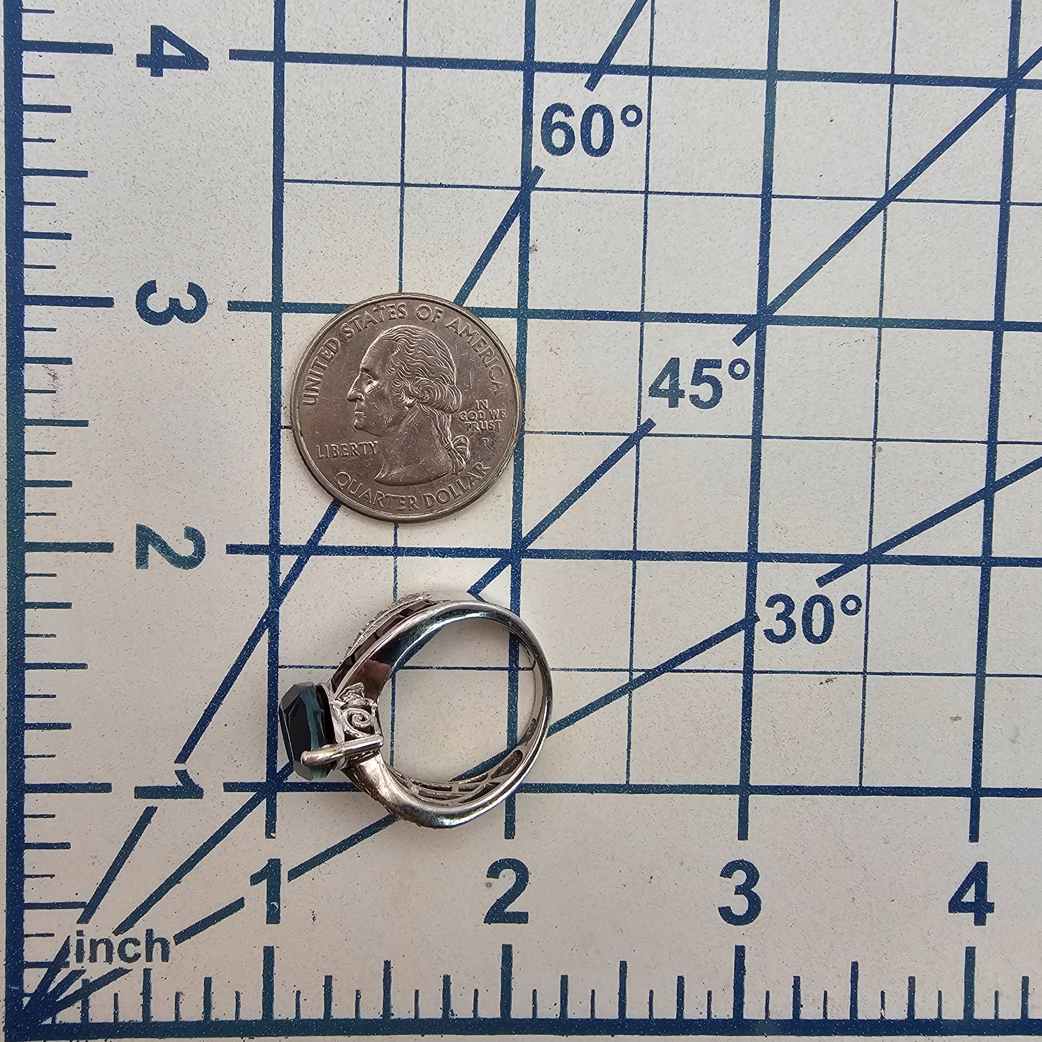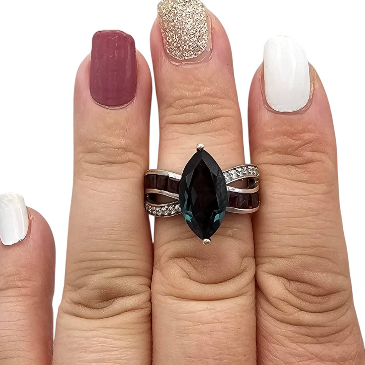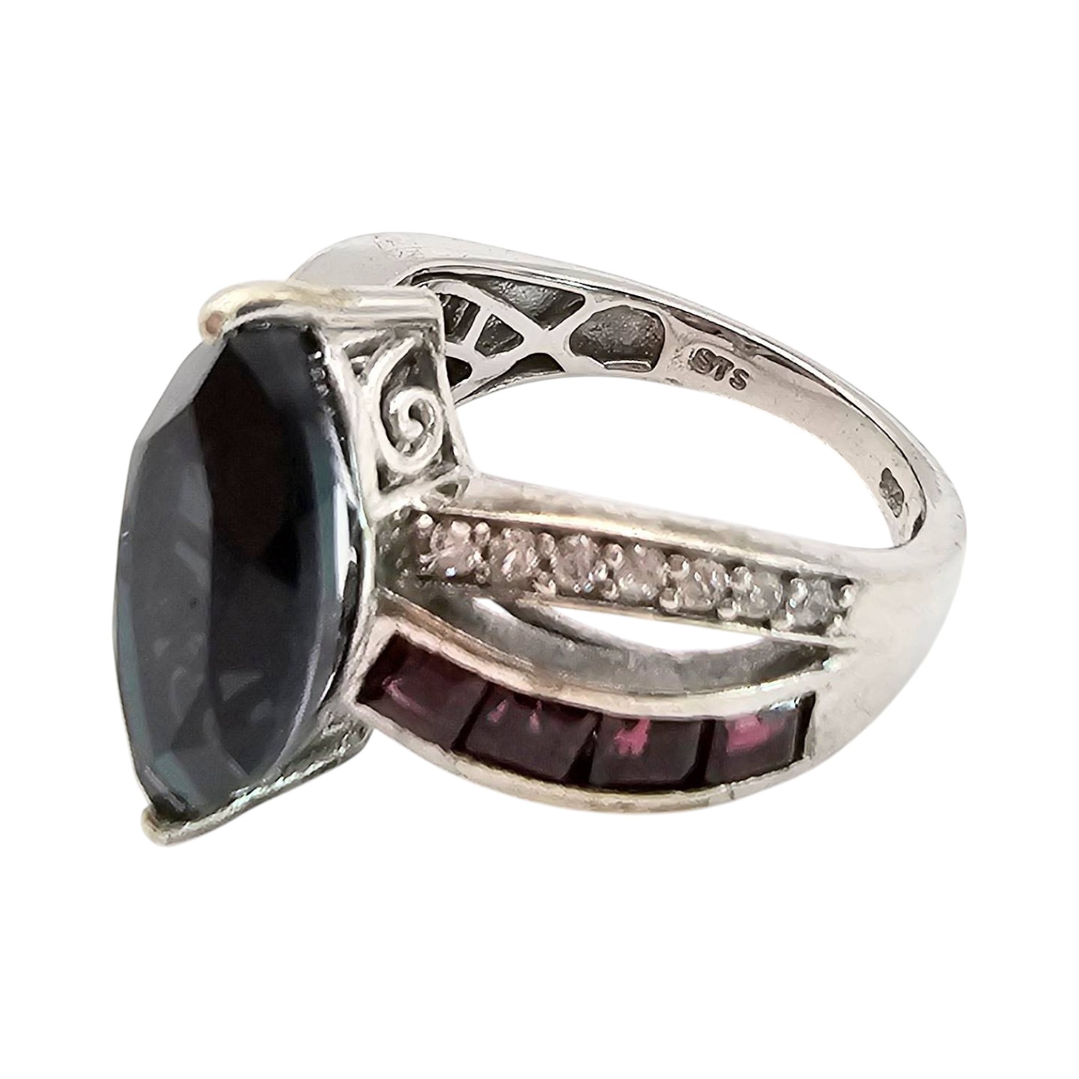 STS sterling silver multi-gemstone ring featuring an elongated marquise-cut center stone with accents of smaller gemstones in channel settings, and additional clear stones providing sparkle. The ring size is 7.5, with a total weight of 6.2 grams. The inner band is marked with ‘STS’ and ‘925’ indicating sterling silver.