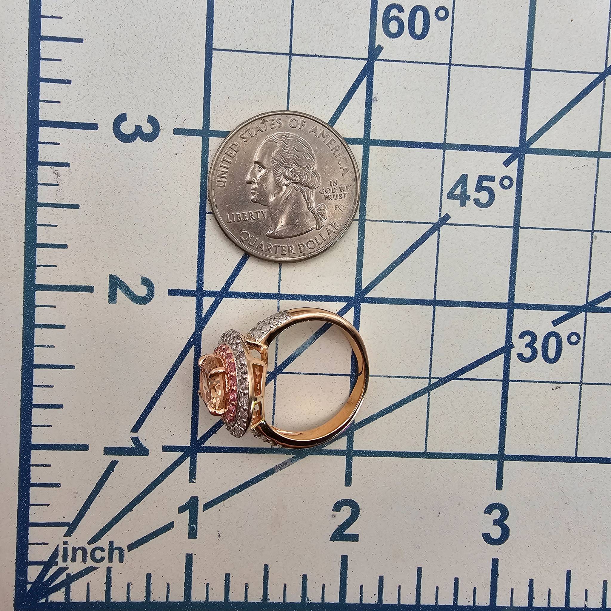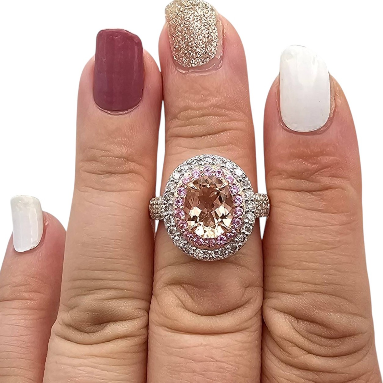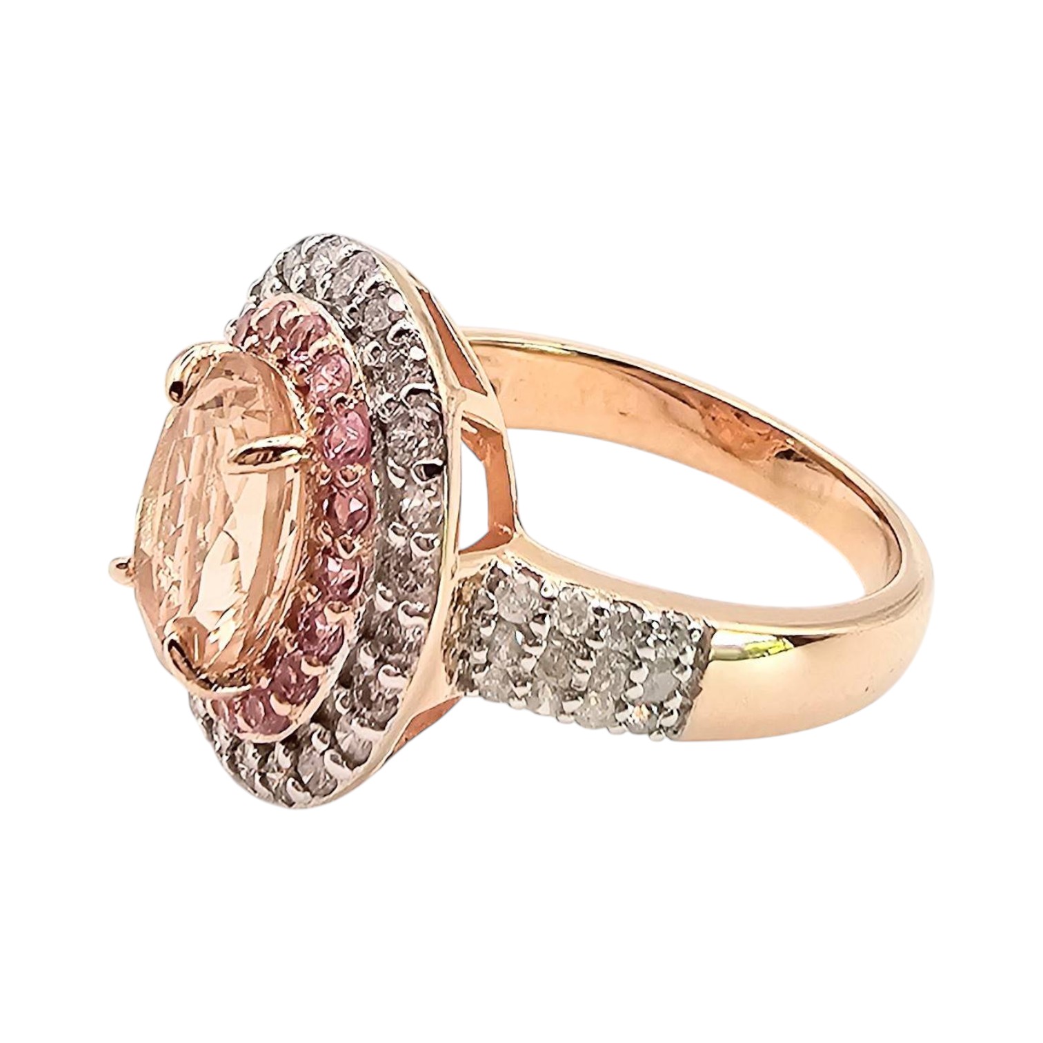 BBJ ring featuring a gold-over sterling silver band with a morganite gemstone centerpiece. The oval morganite is surrounded by a double halo of pink and white diamonds. Ring size is 7.5, and it weighs 5.2 grams. Intricately designed with accent stones on the shoulders for added elegance.