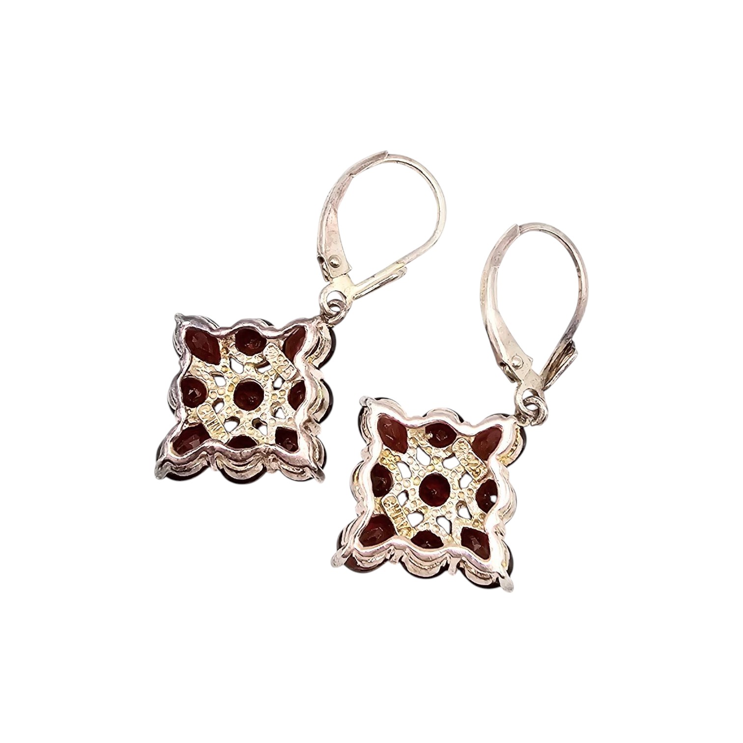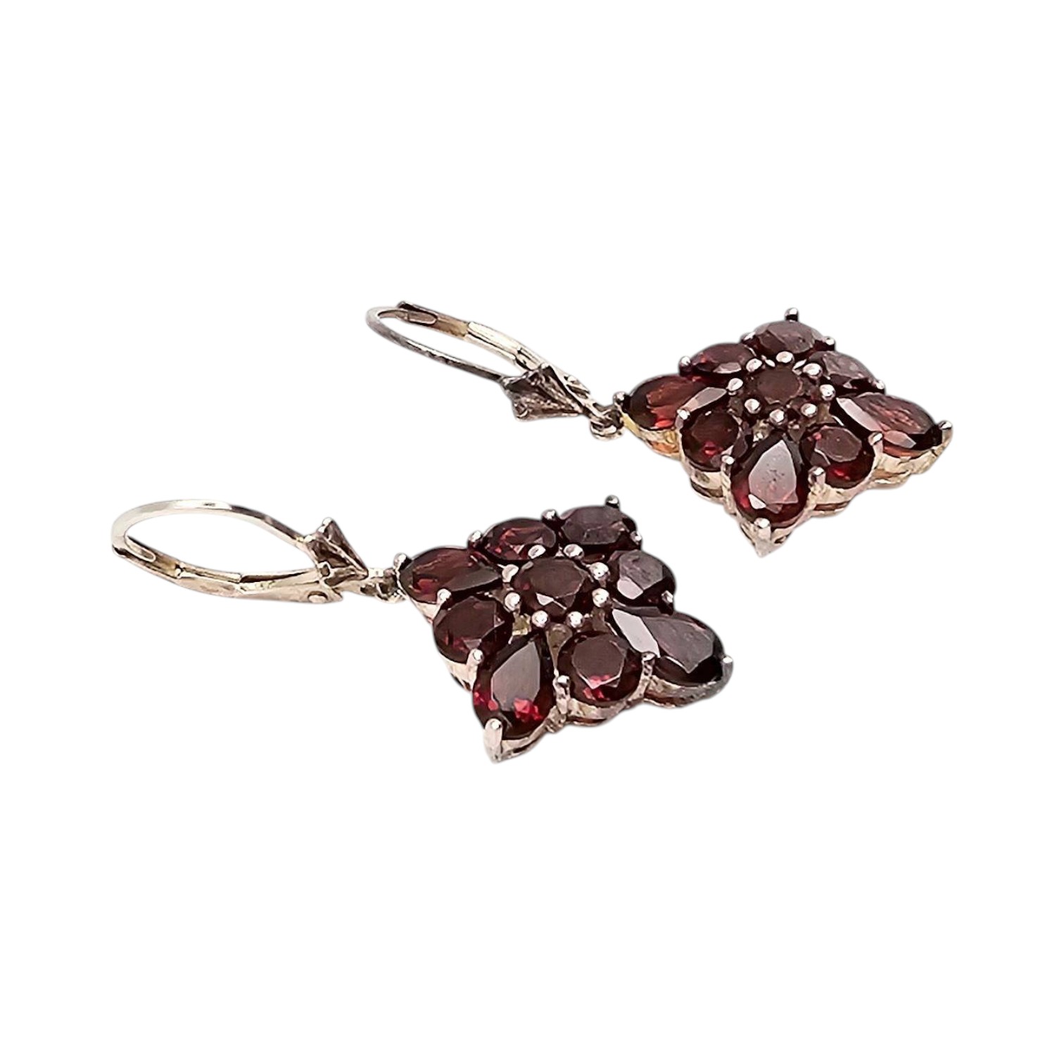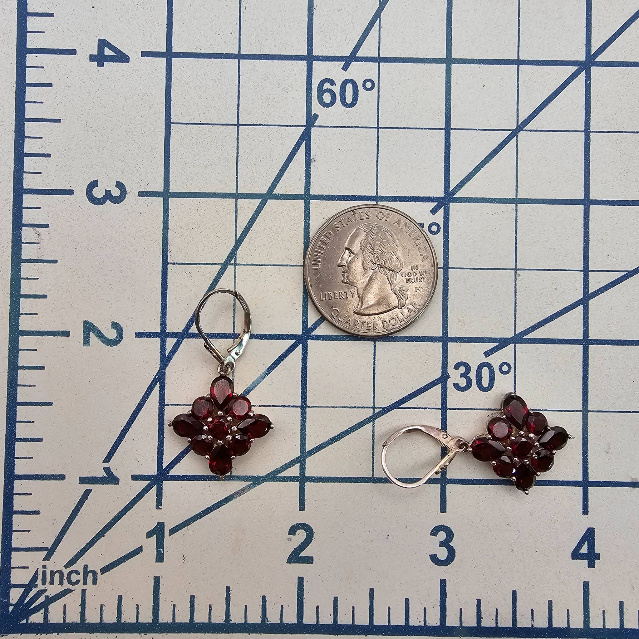 Garnet drop earrings crafted in sterling silver. Featuring a floral-inspired design, the earrings showcase multiple garnet stones in a prong setting. The leverback closure adds security and ease of wear. Total weight is approximately 5.2 grams.