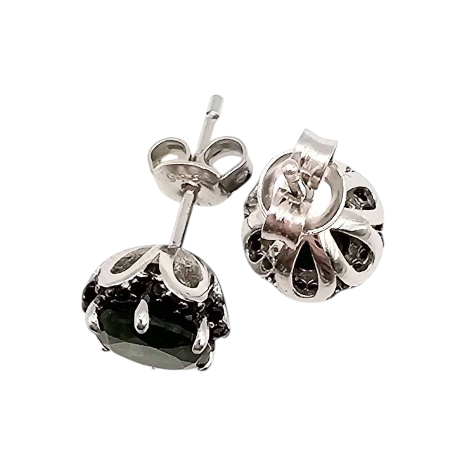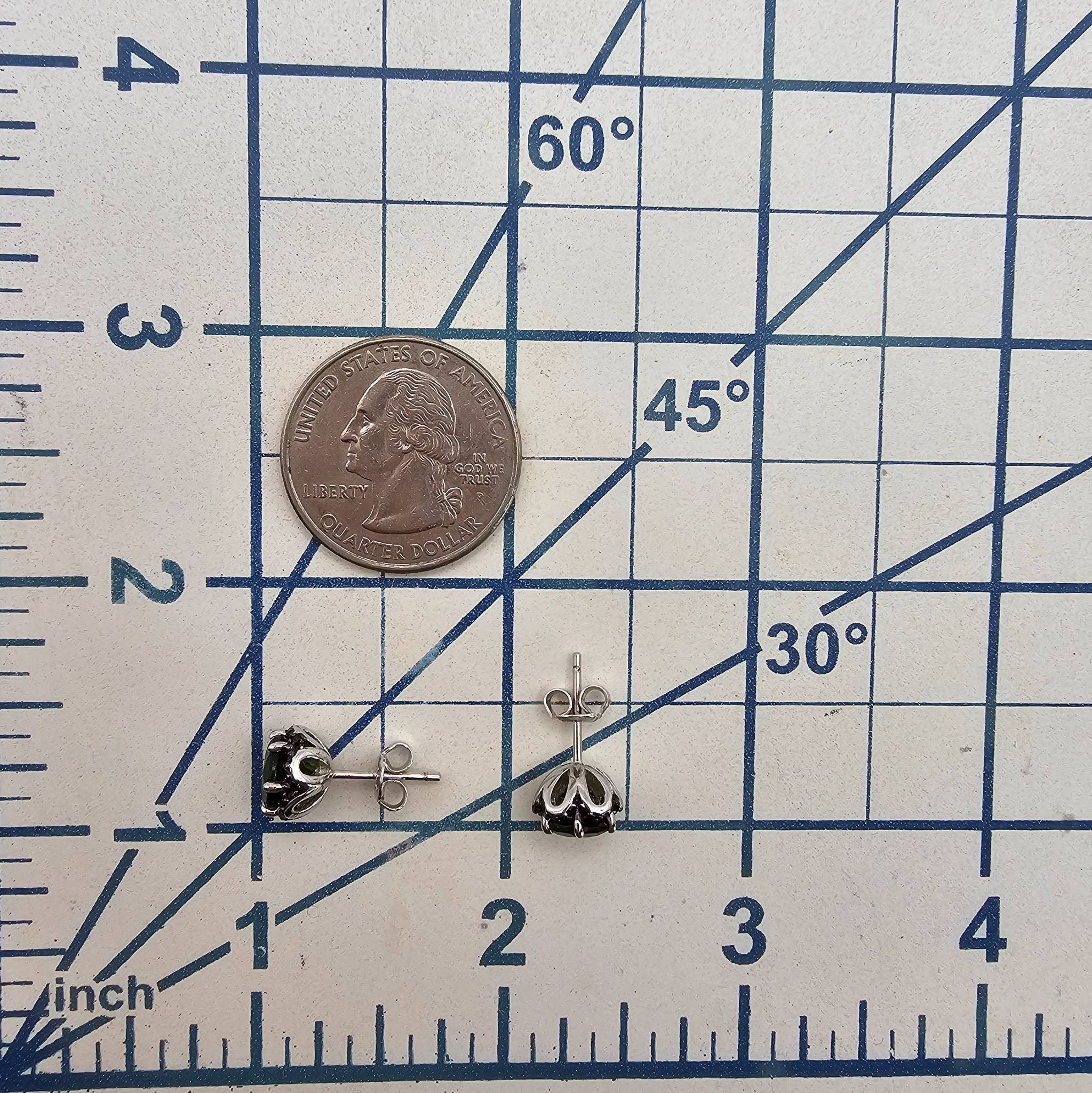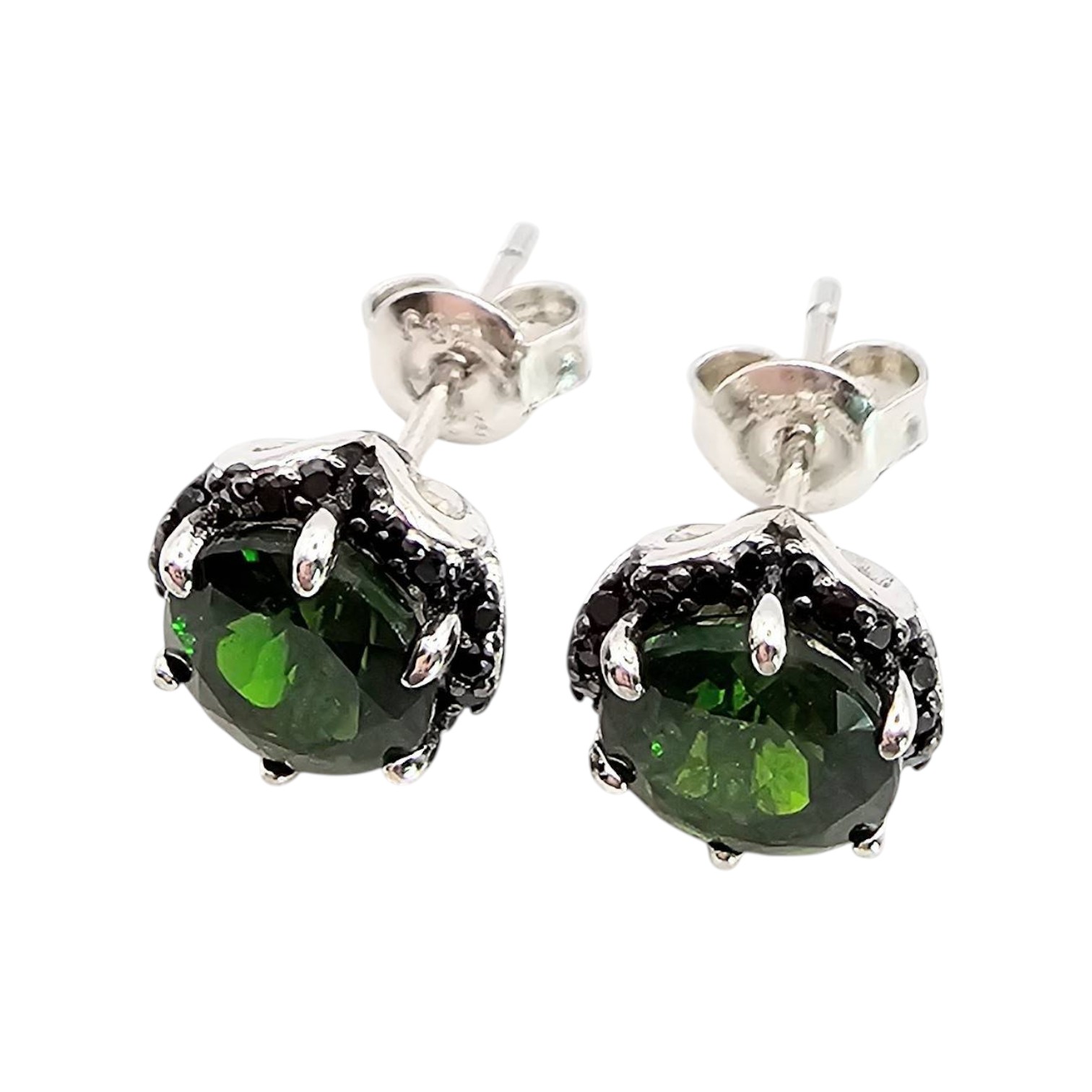 BBJ sterling silver stud earrings featuring green emerald stones, surrounded by a detailed setting. Marked ‘925’ for sterling silver. Total weight is 3.1 grams. Approximate size indicated as shown in scale image with a U.S. quarter. Elegant and finely crafted design.