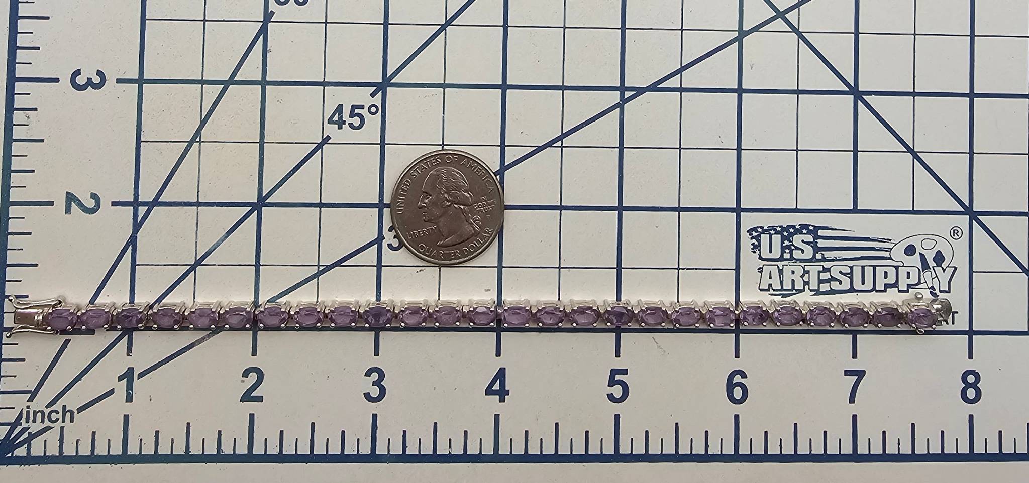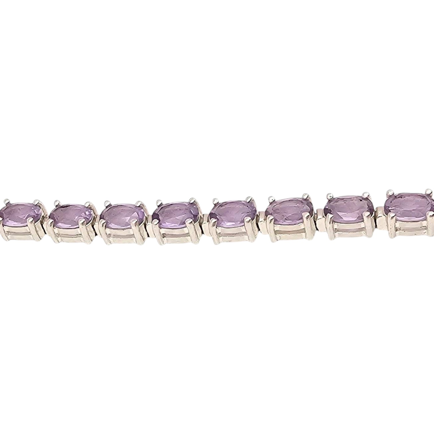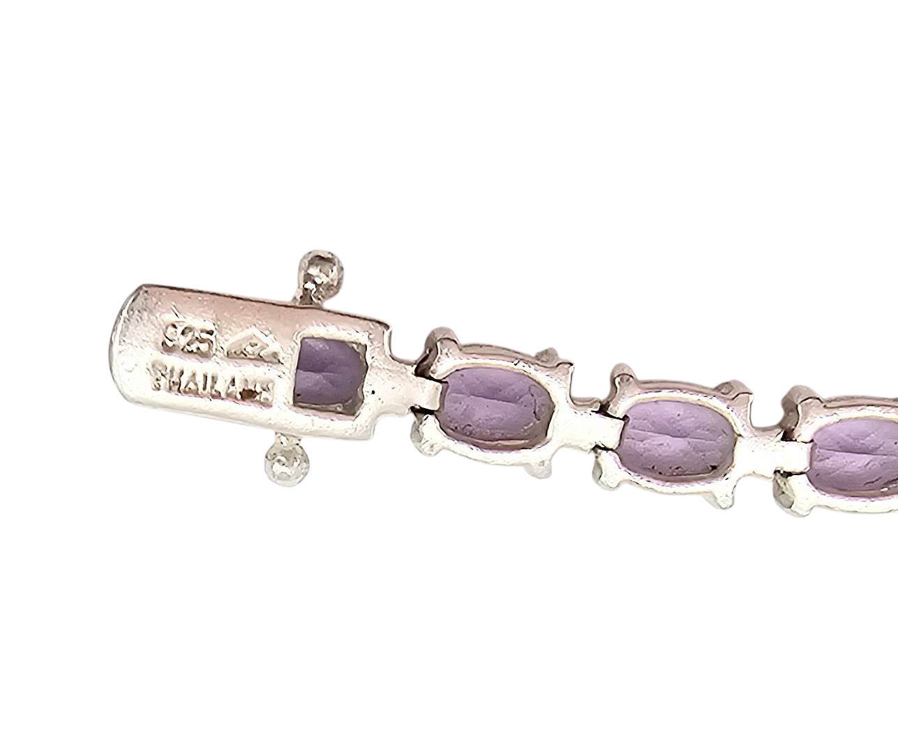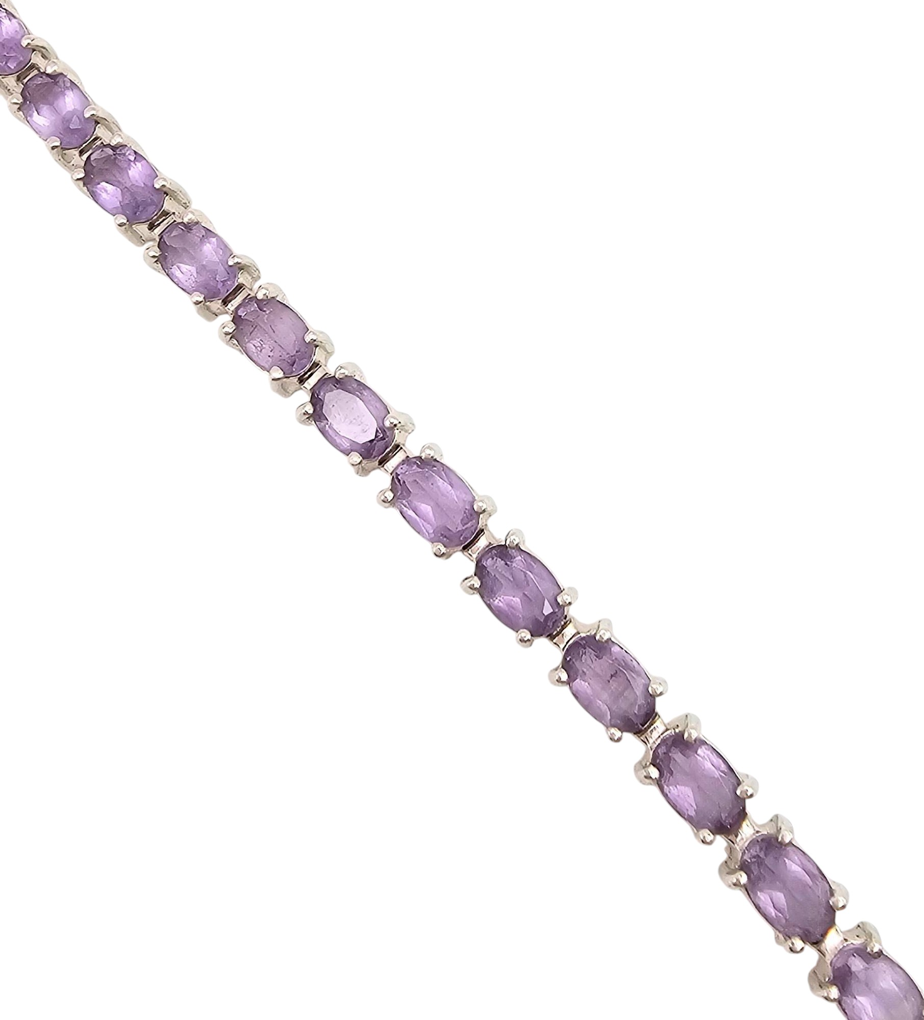 Amethyst tennis bracelet crafted from sterling silver. Features a series of oval-cut amethyst stones set in a linked design. The bracelet weighs 13.8 grams. Stamped with ‘925’ for sterling silver purity. Clasps securely for wearability. Standard tennis bracelet length visible in measurements.