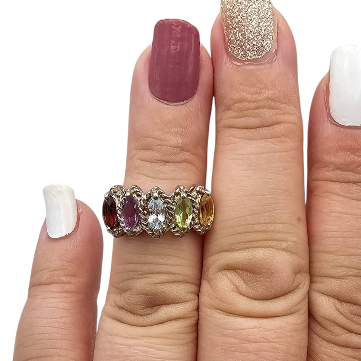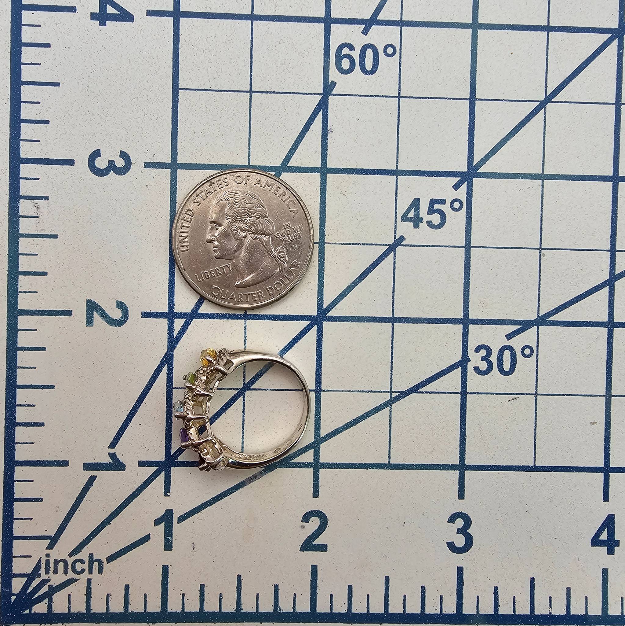Sterling silver multi-gemstone ring featuring five marquise-cut stones in various colors, including purple, red, green, yellow, and clear. The band is stamped F 925, indicating sterling silver composition. The ring weighs 3.9 grams and is a size 5.5.